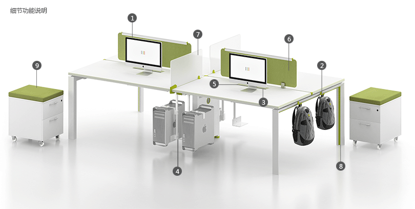 | 1、桌面屏风,多种选择:板材、玻璃、亚克力、吸音板、多功能挂槽。 | 2、超人性化设计,多功能挂件,收纳无处不在。 |