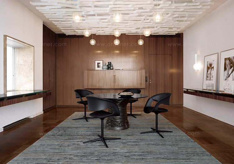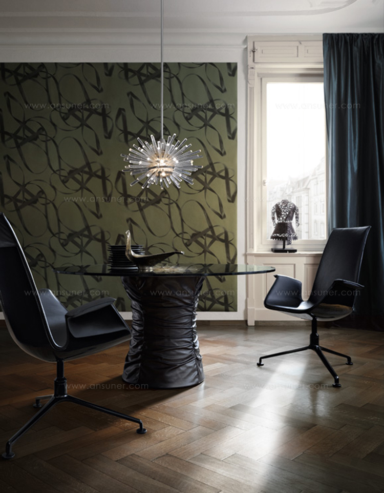 圆形茶几,这是一个家人、朋友聚在一起的地方,在这里,你们可以一起讨论一件事或者享受美食。最原始的欢乐。风箱式的餐桌体现了魅力和生活态度。柔软的皮革和玻璃搭配,稳定的底座和精致的桌面,温暖而凉爽的材料组合在一起创造出独特的效果。