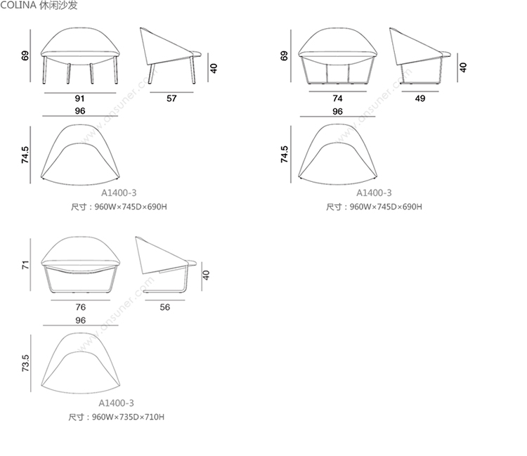 有3种尺寸可供选择:小型,中型和大型皮革或织物软垫。 小型,中型和大型版本采用软垫实心底座。 此外,Colina Medium有悬臂,雪橇和4腿木质底座。