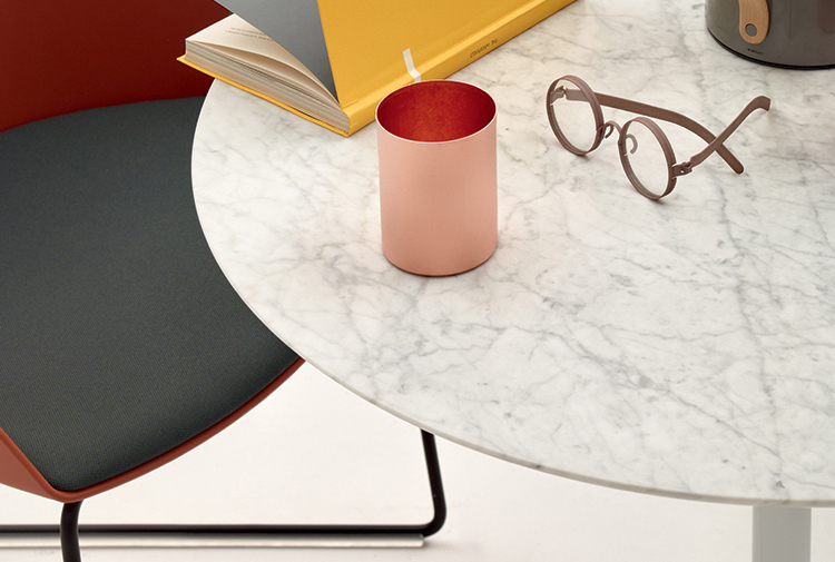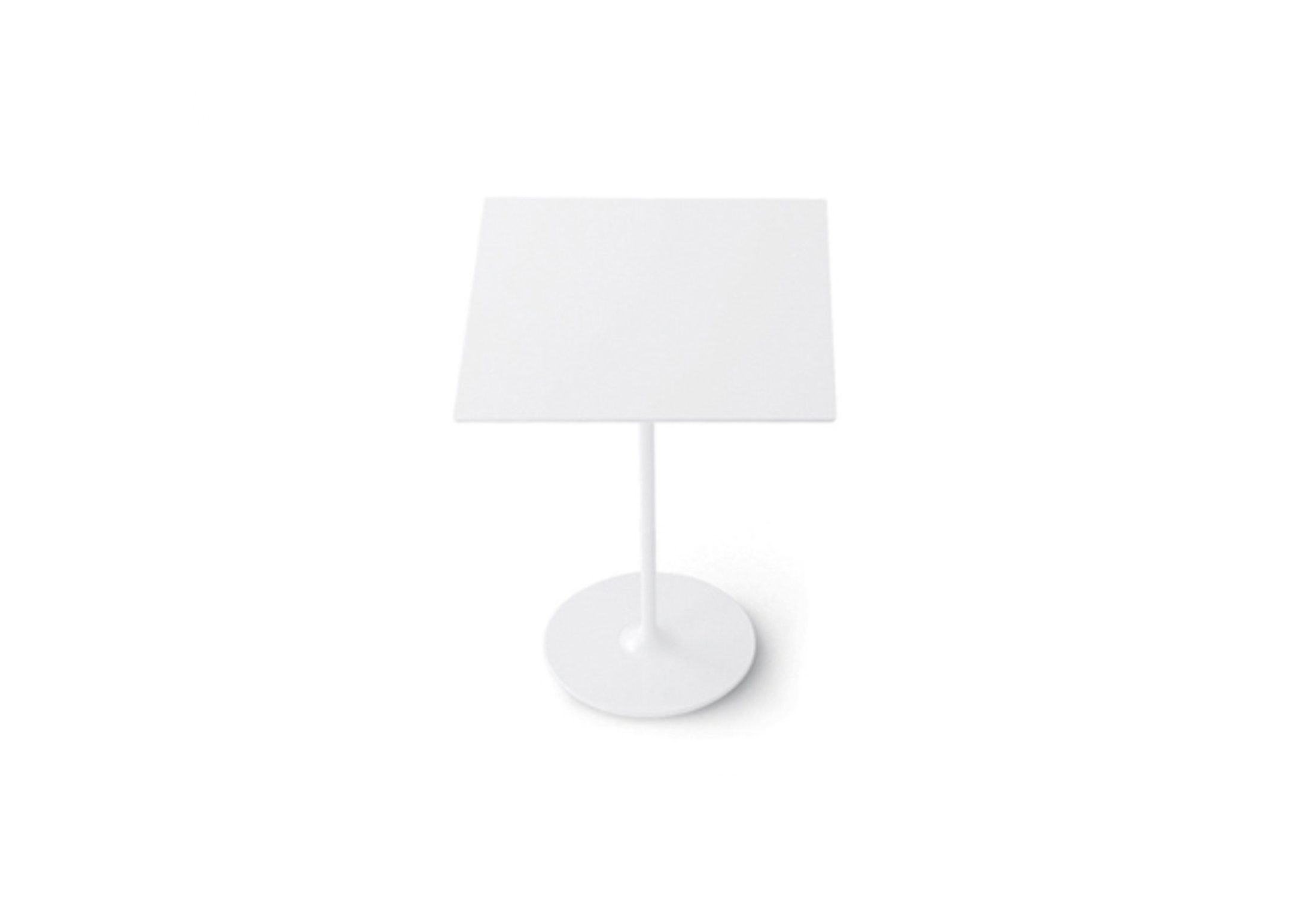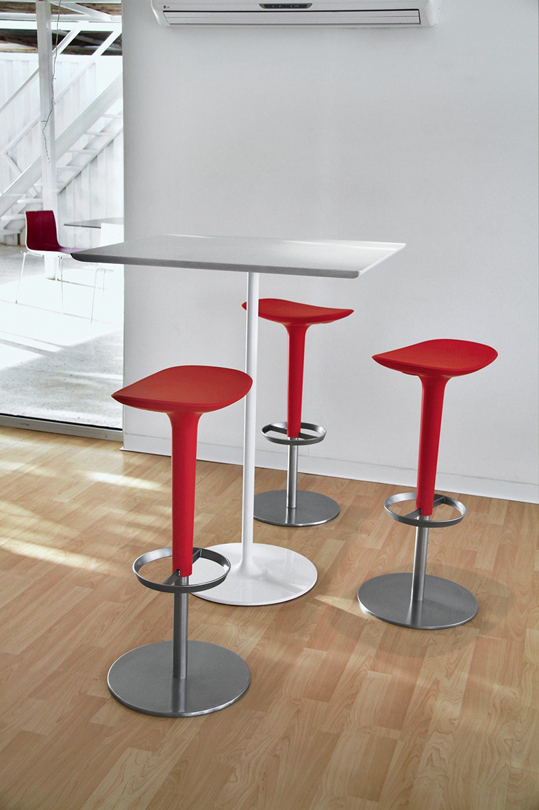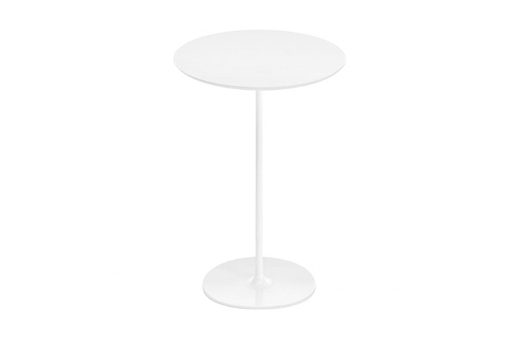 高脚台为圆形底座,白色有光泽或黑色哑光粉末涂层钢,顶部为白色压花MDF(厚2.5厘米)或层压板FenixⓇ(厚2,6厘米),有不同形状和尺寸(方形,圆形)。 身高105厘米。