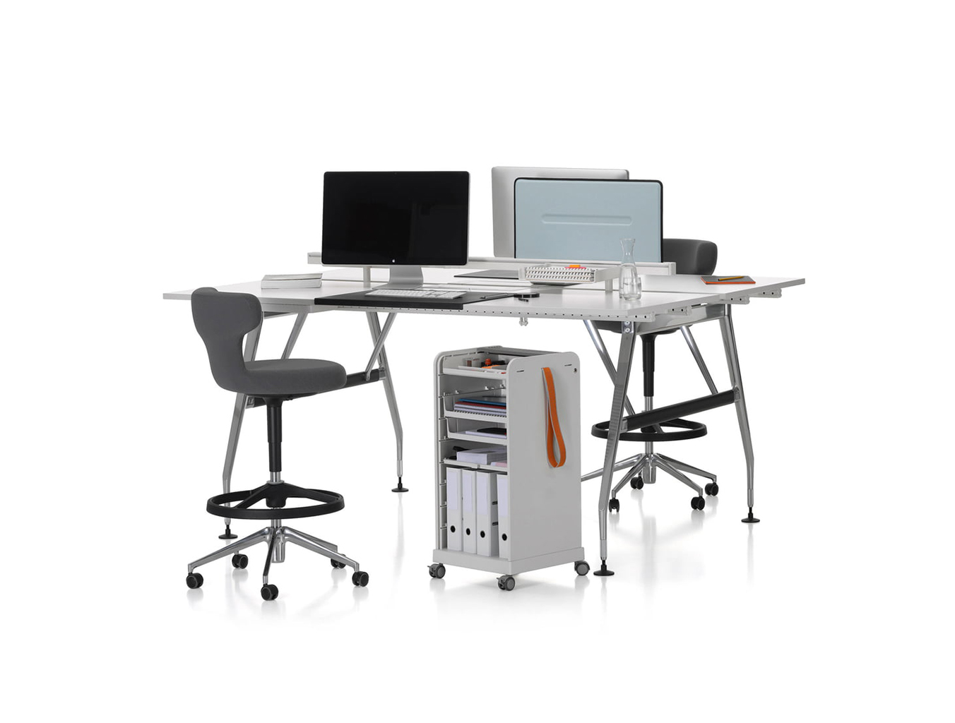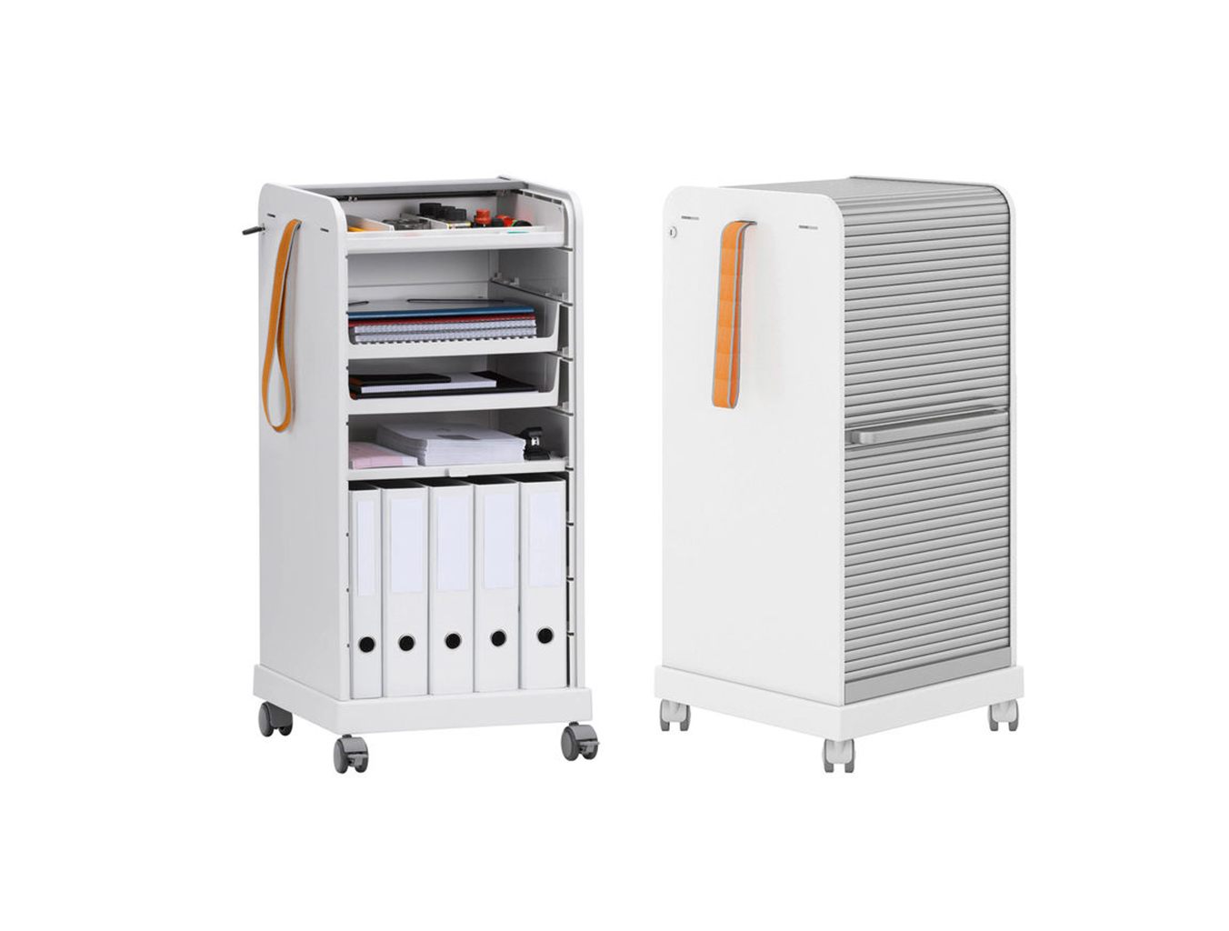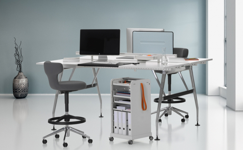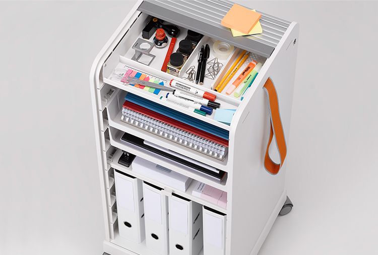 跟随我1和2是坚固,可锁定的移动基座,用于办公室和家庭。 装饰性拉带可以轻松地将手推车从一个地方移动到另一个地方。 一个(跟随我1)或两个(跟随我2)用于活页夹的货架空间和一个带有可移动托盘的集成存储隔间用于纸张和个人物品可以隐藏在移动基座的鼓形快门后面。 两种型号都可以单独配置可选的抽屉和搁板。 较高的Follow Me 2版本是站立高度表的理想伴侣。