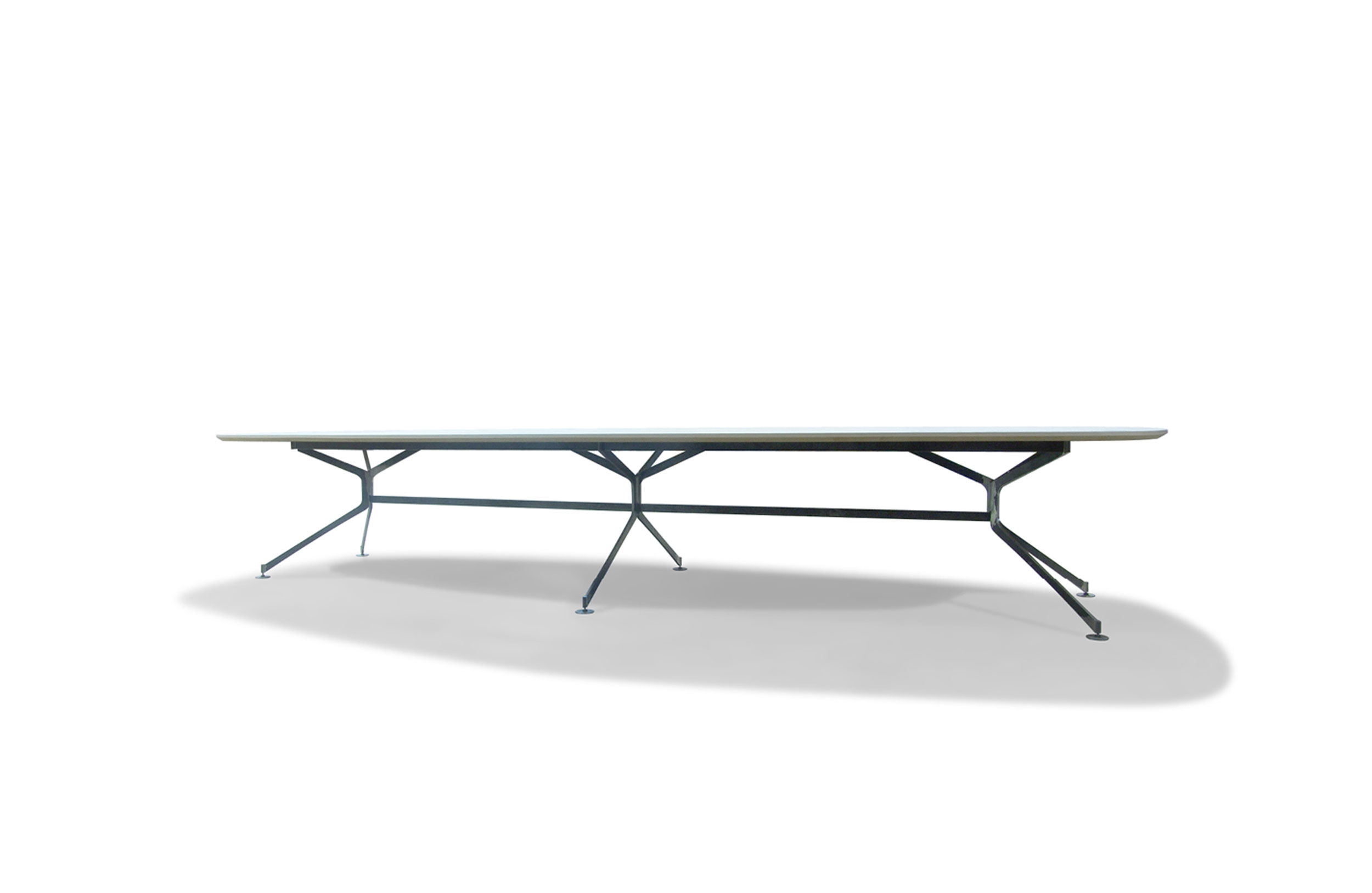 会议桌。30mm一体式矩形桌面,底部有10mm直角和90mm锋利的斜边。激光切割金属板腿结构。表面处理:顶部采用木材或微纹理漆面处理。金属底座采用微纹理漆面处理。