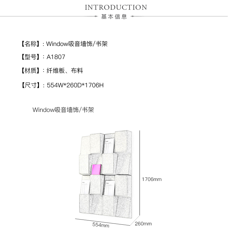 窗口是一个杂志展示架,充当吸音器,或充当杂志展示架的吸声器。由于采用模块化设计,Window可根据所需尺寸进行定制。窗户包括模制毛毡,内部带有吸音再生纤维板。使用隐藏式墙壁支架安装在墙上。提供2x2或3x3模块。