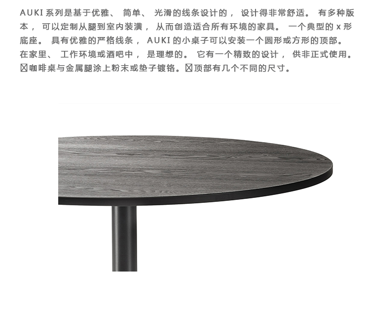 AUKI系列是基于优雅、简单、光滑的线条设计的,设计得非常舒适。有多种版本,可以定制从腿到室内装潢,从而创造适合所有环境的家具。一个典型的x形底座。具有优雅的严格线条,AUKI的小桌子可以安装一个圆形或方形的顶部。在家里、工作环境或酒吧中,是理想的。它有一个精致的设计,供非正式使用。咖啡桌与金属腿涂上粉末或垫子镀铬。顶部有几个不同的尺寸。