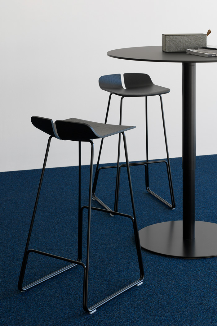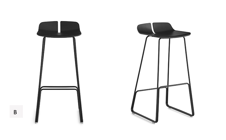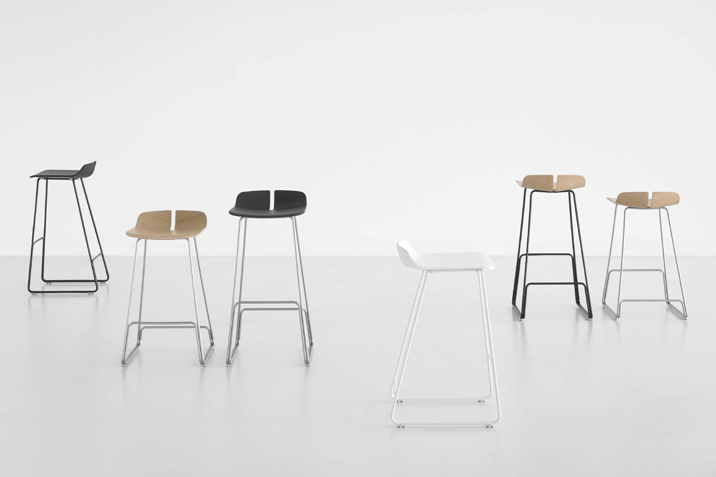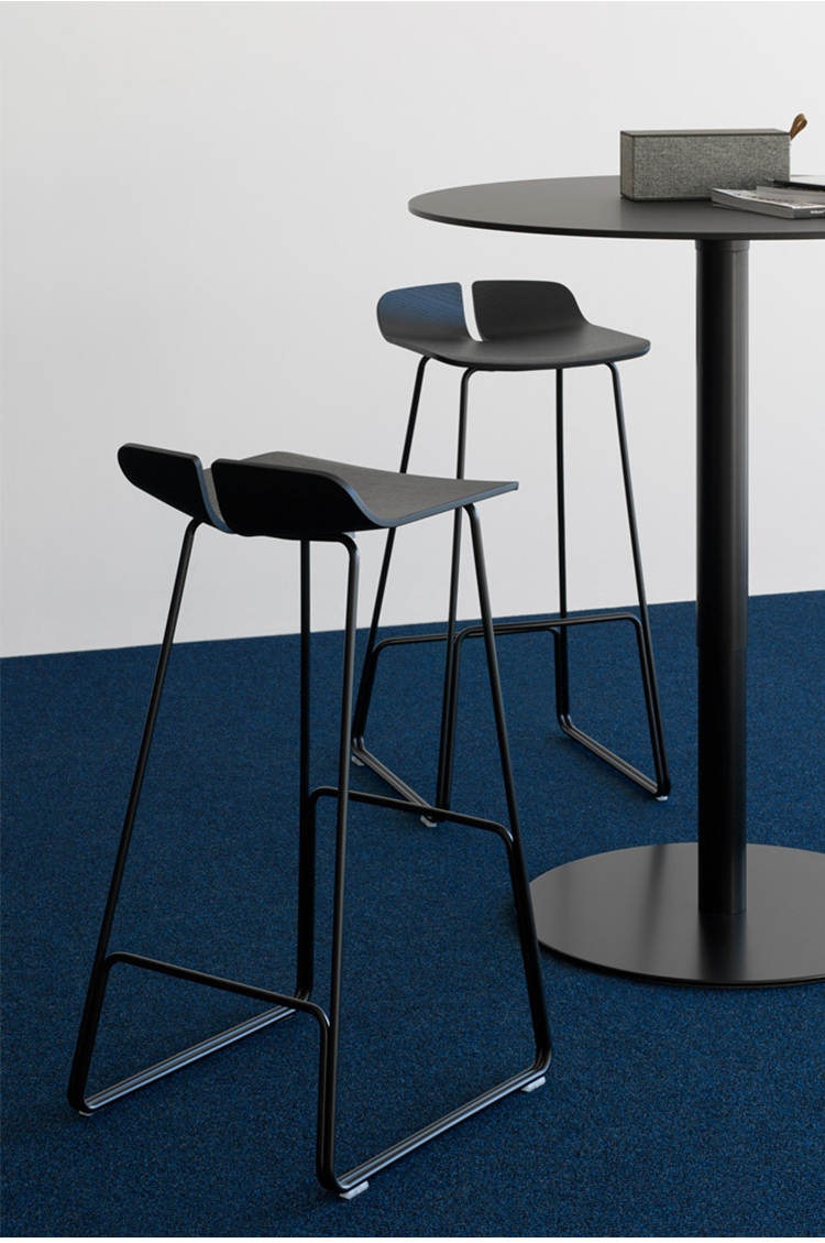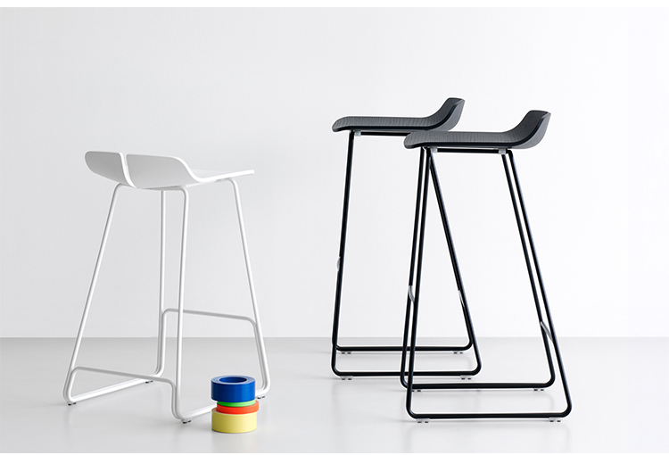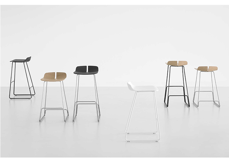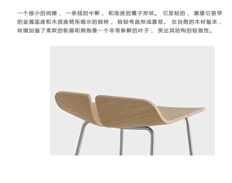 一个很小的间隙,一条线的中断,和连接的凳子形状。它是轻的,就像它狭窄的金属底座和木质座椅所暗示的那样,轻轻弯曲形成靠背。在自然的木材版本,纹理加强了柔软的轮廓和拥抱像一个非常新鲜的叶子,突出其结构的轻盈性。