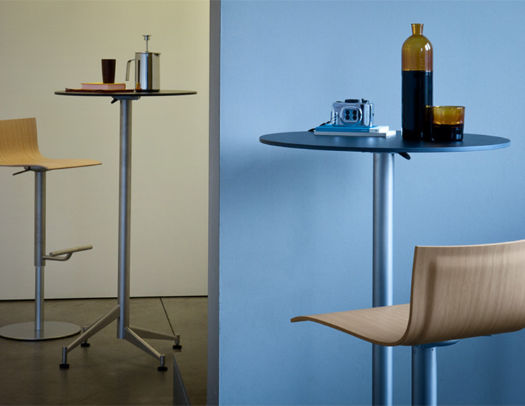 用旋转座椅和可调整高度的大便与喷砂不锈钢和钢中的圆形底座与«亚麻织物»图案或完全粉末涂覆。座椅在几个饰面与厚度变化胶合板,更薄的边缘。有多种饰面或在皮革软垫。