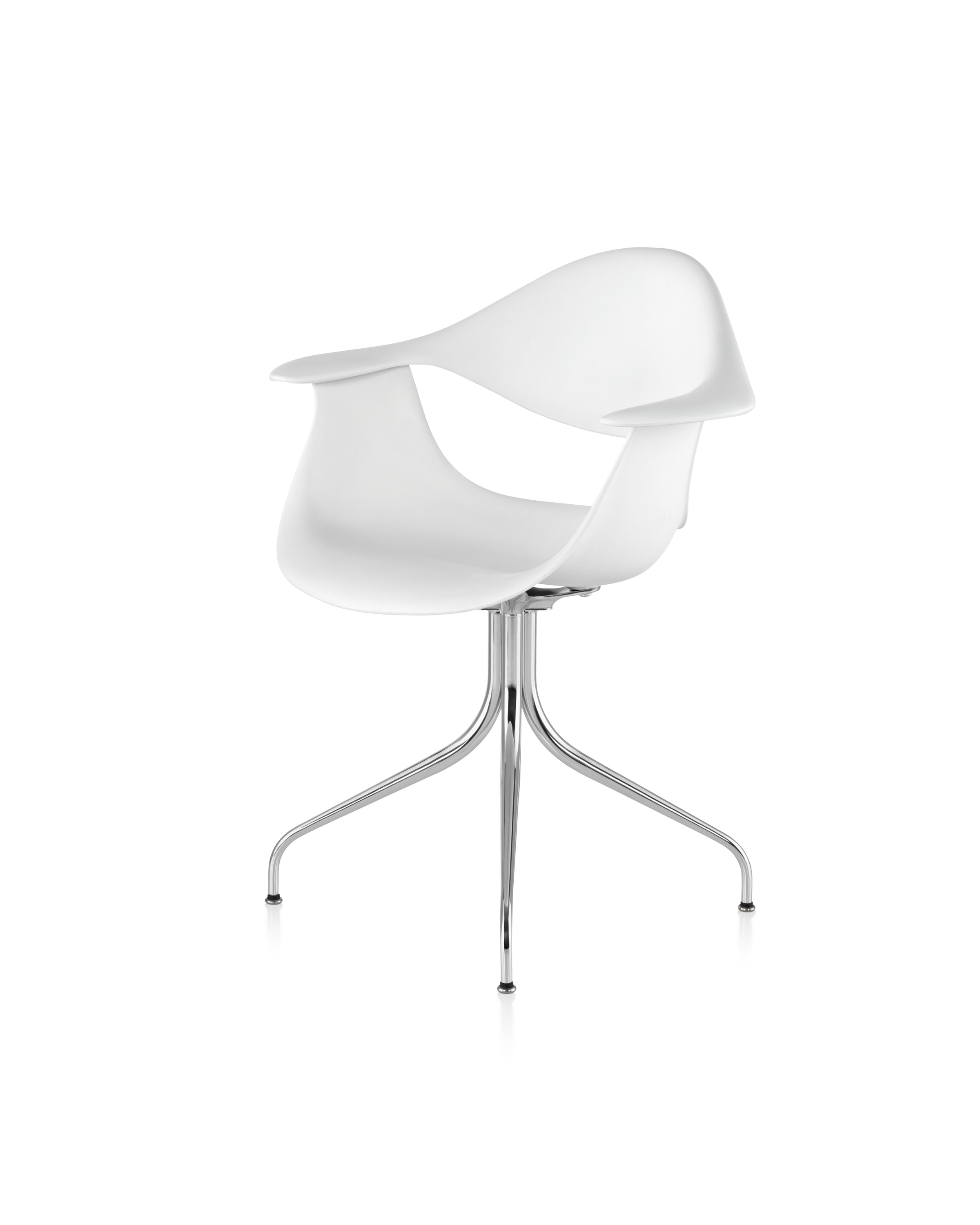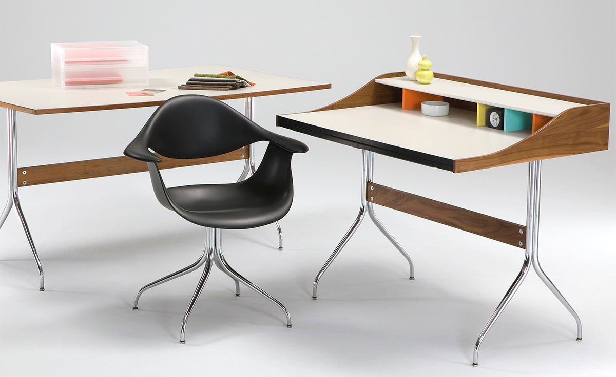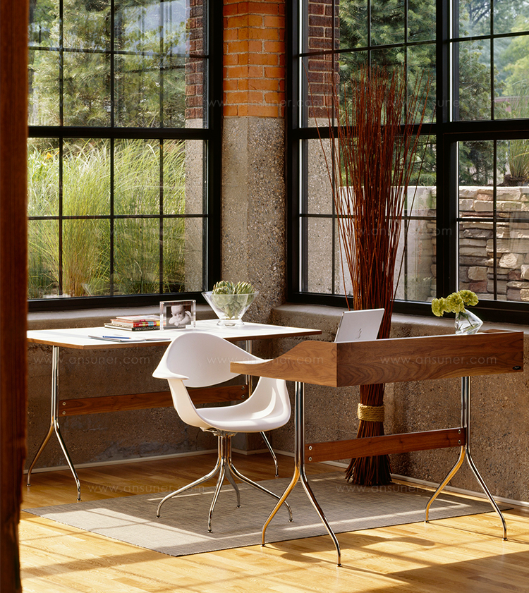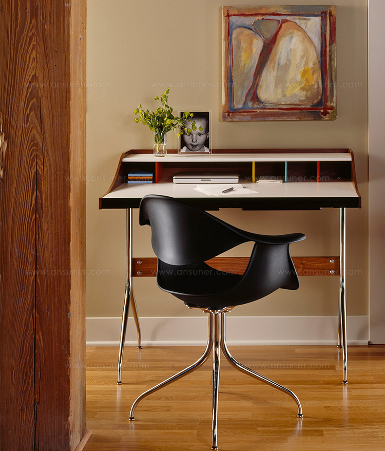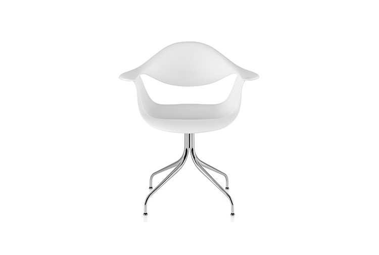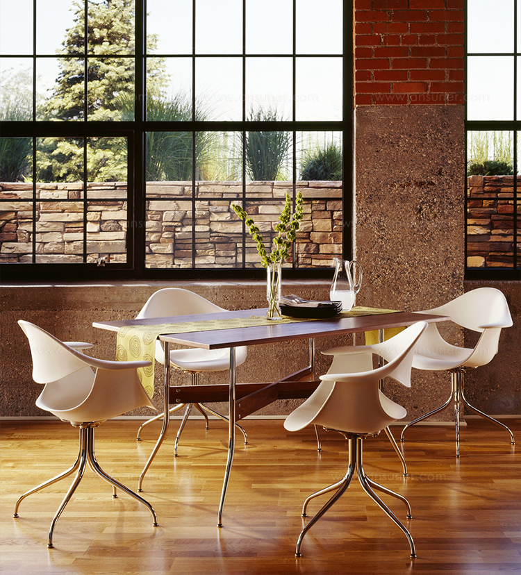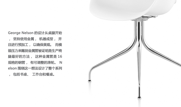 这款扶手椅所属系列的灵感来自George Nelson对创作一款具有雕刻感椅腿家具的渴望,并且他对椅腿的形状有非常具体的想法。George Nelson希望底座具有优雅的曲线,采用金属材料制造,工业加工成型,并且采用预处理饰面,同时要容易组装和分解,以方便装运,并且价格更便宜。型锻是用压力细化并弯曲金属管的过程。实践证明这是制造椅腿的绝好工艺,而Nelson也是用这种工艺为自己的独特设计命名。 对于椅座壳,Nelson将单独的椅座和靠背组合在一起,形成雕刻般的形状,以贴合人体曲线。椅背和椅身之间的缝隙可以避免产生过高的热量。宽阔平坦的扶手可以让手臂处于放松状态。放置在办公桌或是用餐区或会议室的桌子旁边,这款永恒时尚的座椅能够满足当今的需要,如同1958年刚刚推出时一样。