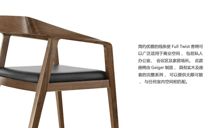 Mark Goetz设计的Full Twist客椅是一把实木带纺织软垫的休闲座椅,既灵活又舒适。利用了尖端的生产技术和传统的木匠工艺,单独雕刻成型的木条不但构建了座椅的底部,同时流畅形成了座椅的扶手及略微倾斜的靠背。简约优雅的线条使Full Twist客椅可以广泛适用于商业空间,包括私人办公室、会议区及家居场所。此款座椅由Geiger制造,具有实木及座套的完整系列,可以提供无限可能,与任何室内空间相匹配。