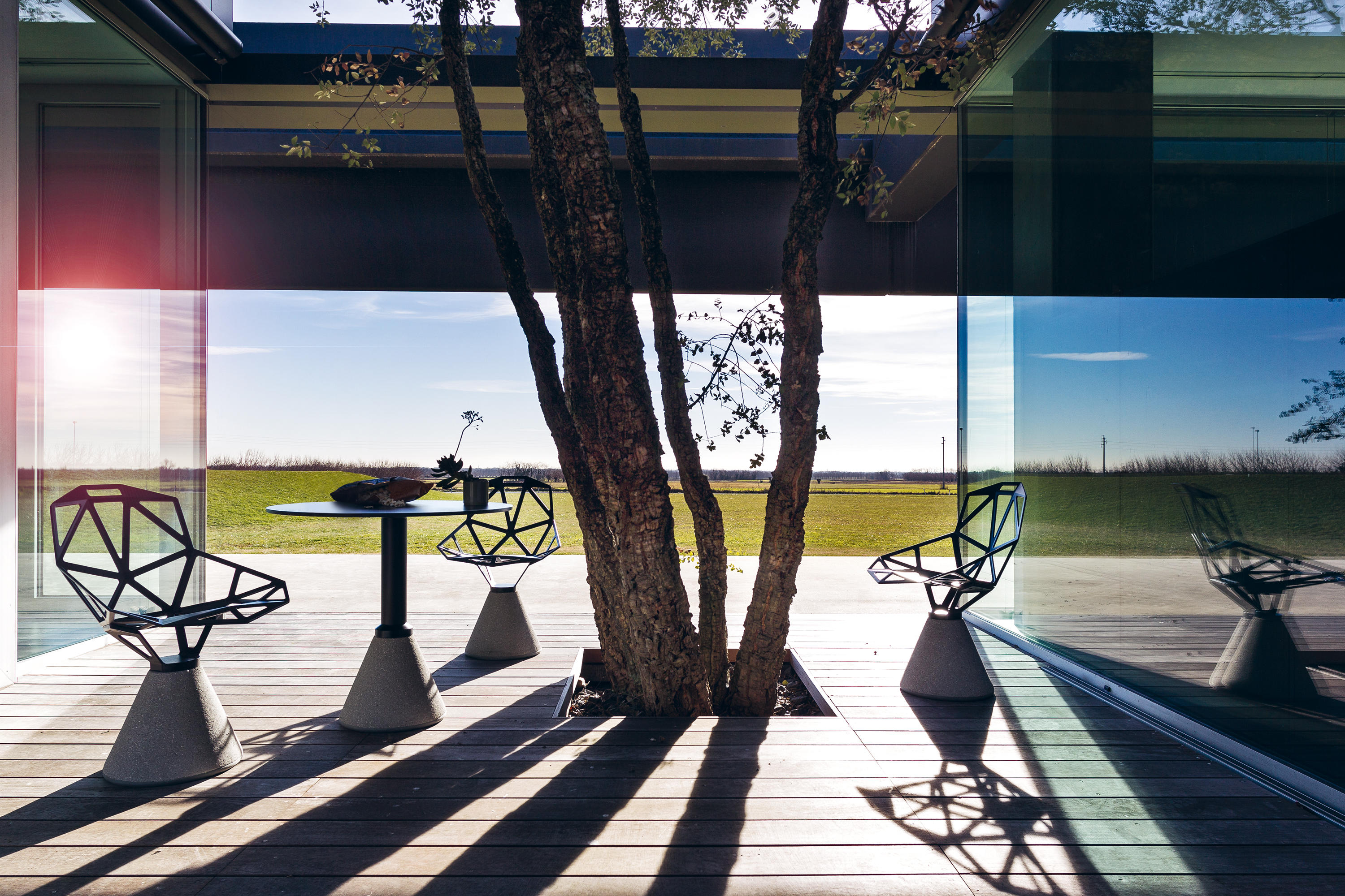 最受瞩目的德国设计师Konstantin Grcic 应邀为MAGIS 设计的Chair One(几何吧椅),是设计生涯中最具有标志的产品之一。办公椅体为模铸铝合金结构,经过氟化钛镀膜与塑料粉末涂布。椅子具有阻燃性、抗腐蚀性。适合室内及室外使用。以铝金属与钛金属制成的 Chair One,以多个平面以不同角度组合而成,建立起立体的外型。多个中空的三角型组合而成的座椅,不但令为用家带来强而有力的承托结构,而且还能在简单设计之中带出不一样的风格。这把椅子的惊人形象难免使人对它的舒适度产生疑问,但当你真正坐于其上,你会发现它实际上非常舒适,那些稀疏的网状结构能够极好地支撑不同体型的人体,后背上的把手也非常实用。当你知道Chair-One最初是被当作户外用椅而设计的,你会更加佩服Konstantin Grcic的缜密用心:极少的表面可以杜绝雨水,并且减少灰尘堆积,夸张的形态则令它能够在街道、建筑或自然的环境中拥有自己美学上的存在,而不是被环境所吞没。Konstantin Grcic花了三年时间设计Chair One,自2003年诞生以来,堪称Grcic精简主义风格的代表作。2006年,Chiar One为Konstantin Grcic赢得了德国政府的设计大奖。