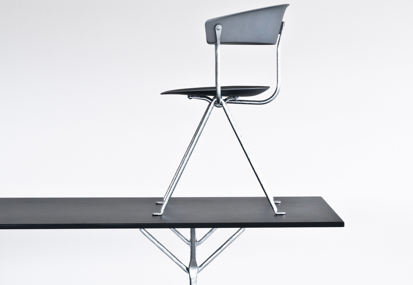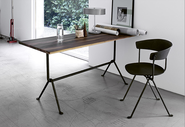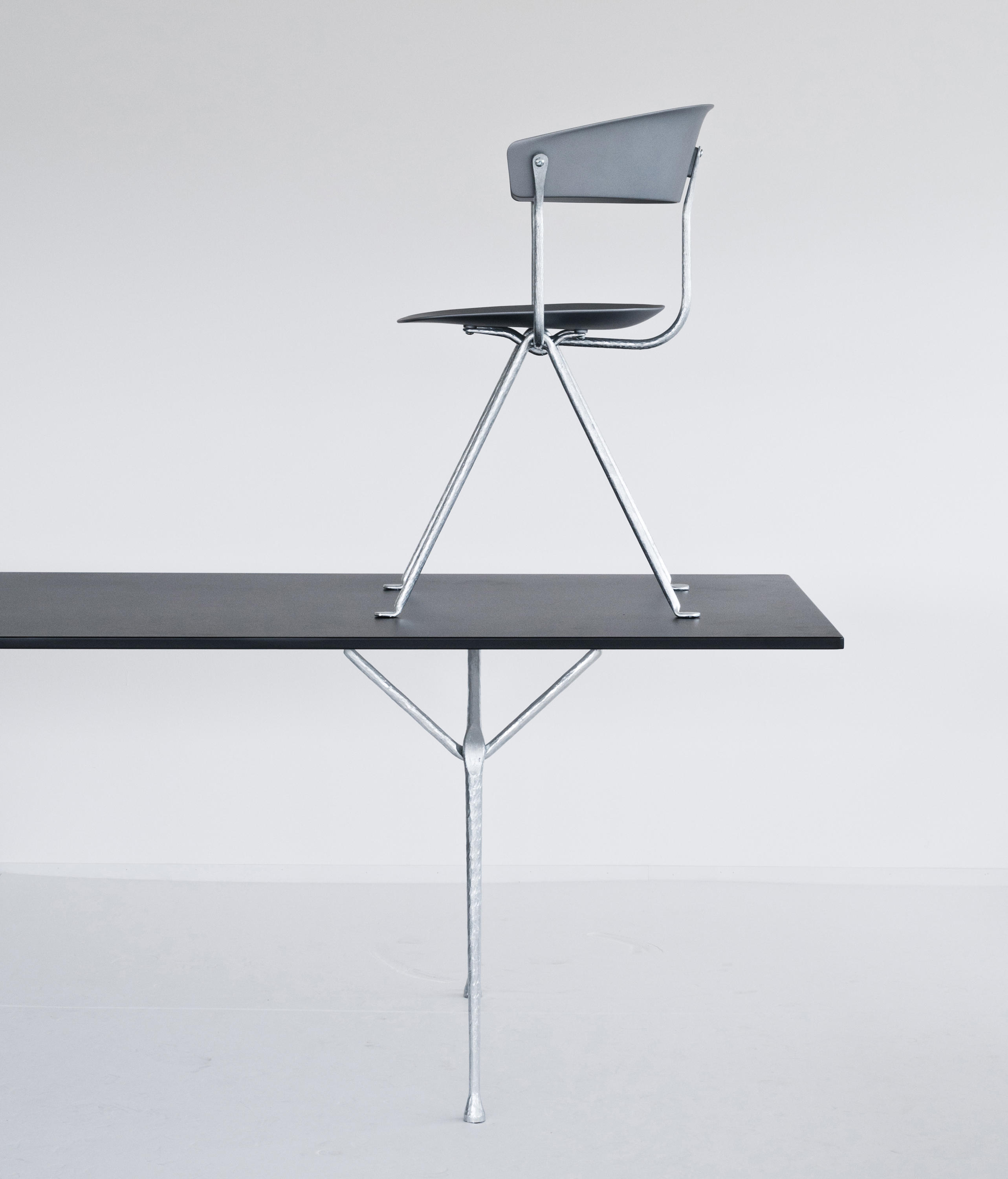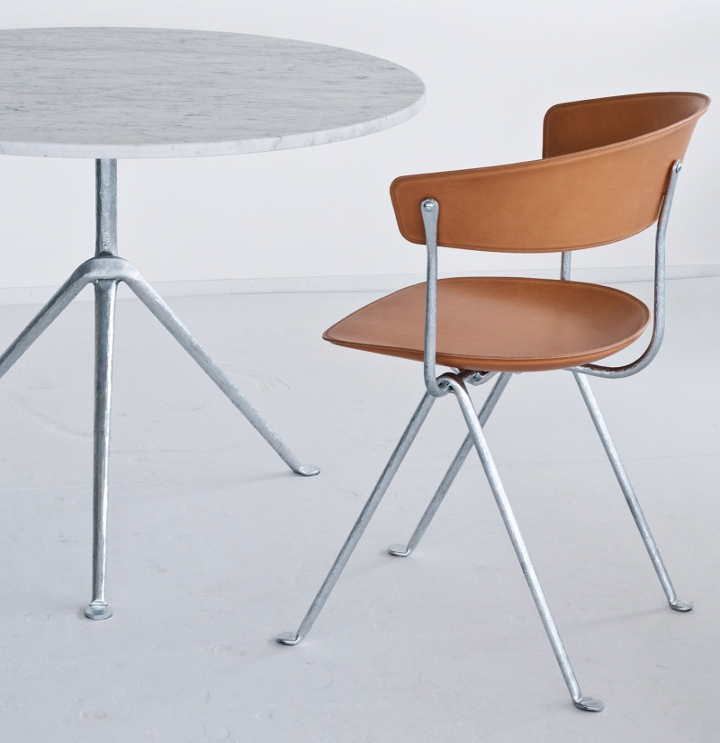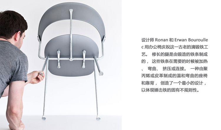 设计师Ronan和Erwan Bouroullec用办公椅庆祝这一古老的滴锻铁工艺。修长的腿是由锻造的铁条制成的,这些铁条在需要的时候被加热、弯曲、挤压或连接。一个轻微弯曲的座位和由聚丙烯或皮革制成的靠背被设置在顶部,创造了一个最小的设计来庆祝锤铁固有的不规则。