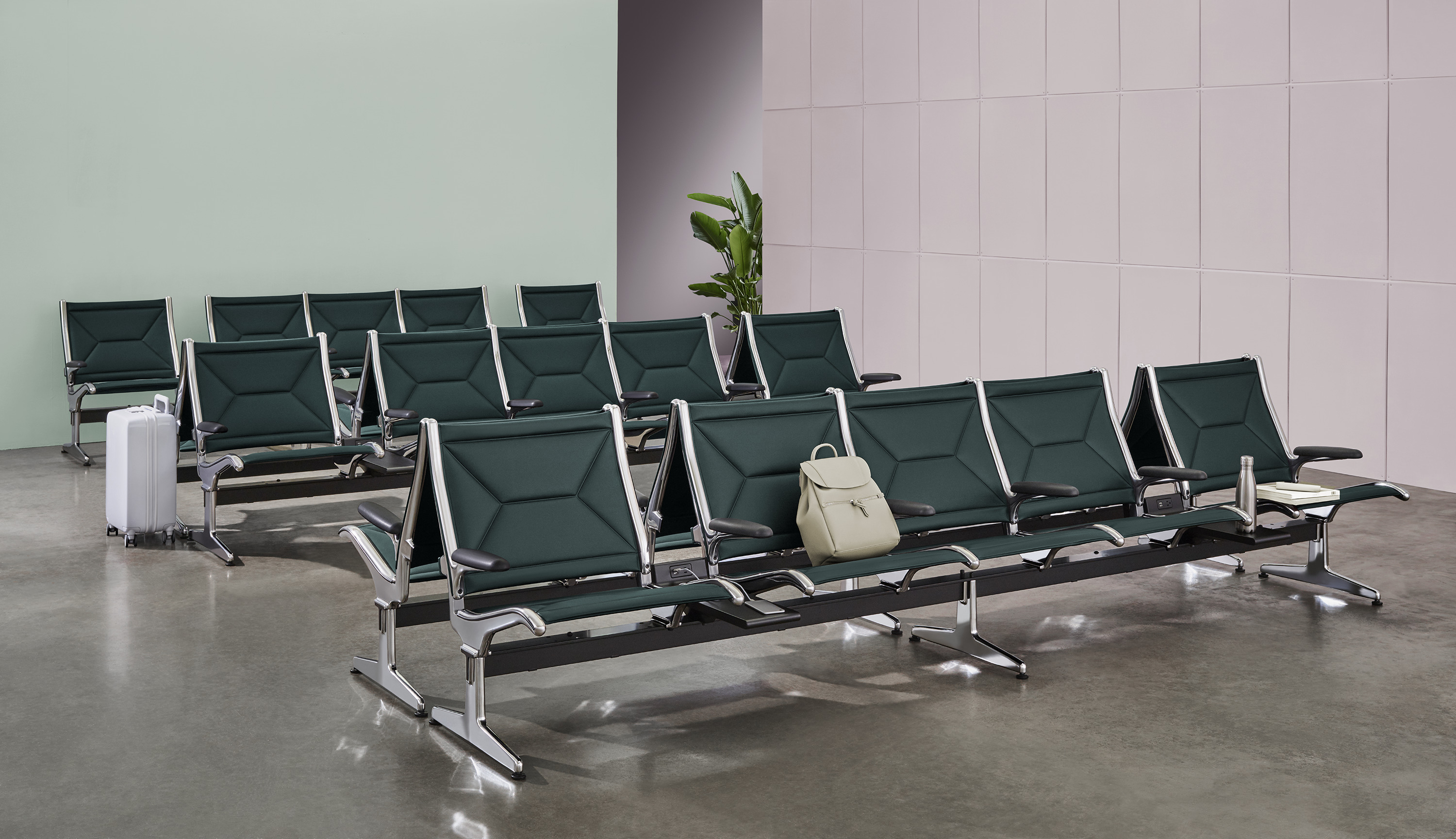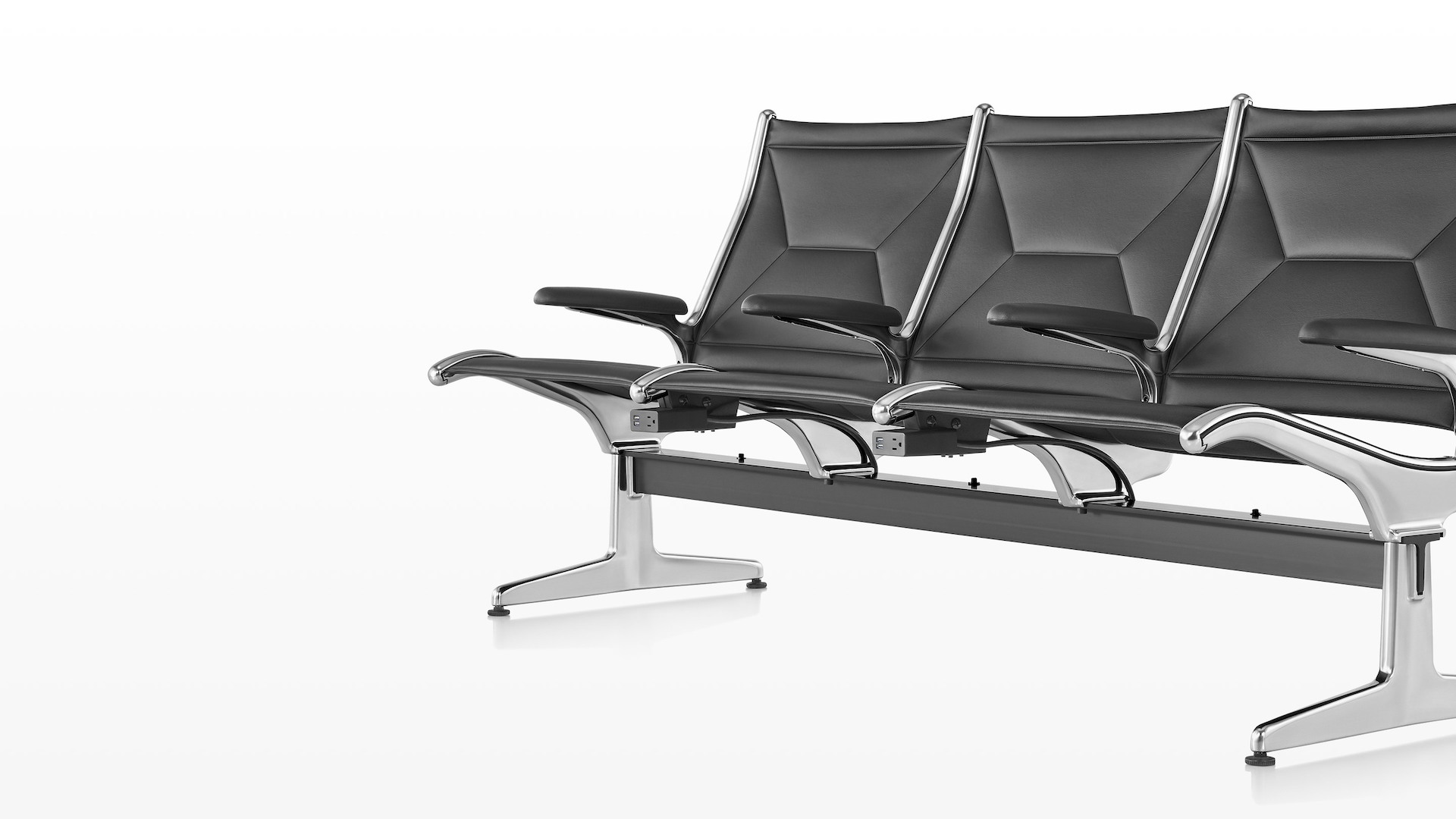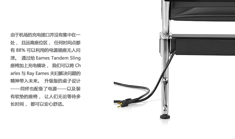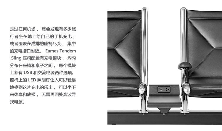 Eames Tandem Sling座椅最初设计于1962年,多年来一直为成千上万在机场、火车站和其他公共场合等候的旅行者提供了一方寸舒适之地,经受住了时间的检验。集成电源让人们可以放松身心,在最需要的时候接入自己的设备,边充电边享受,无需劳神费心。