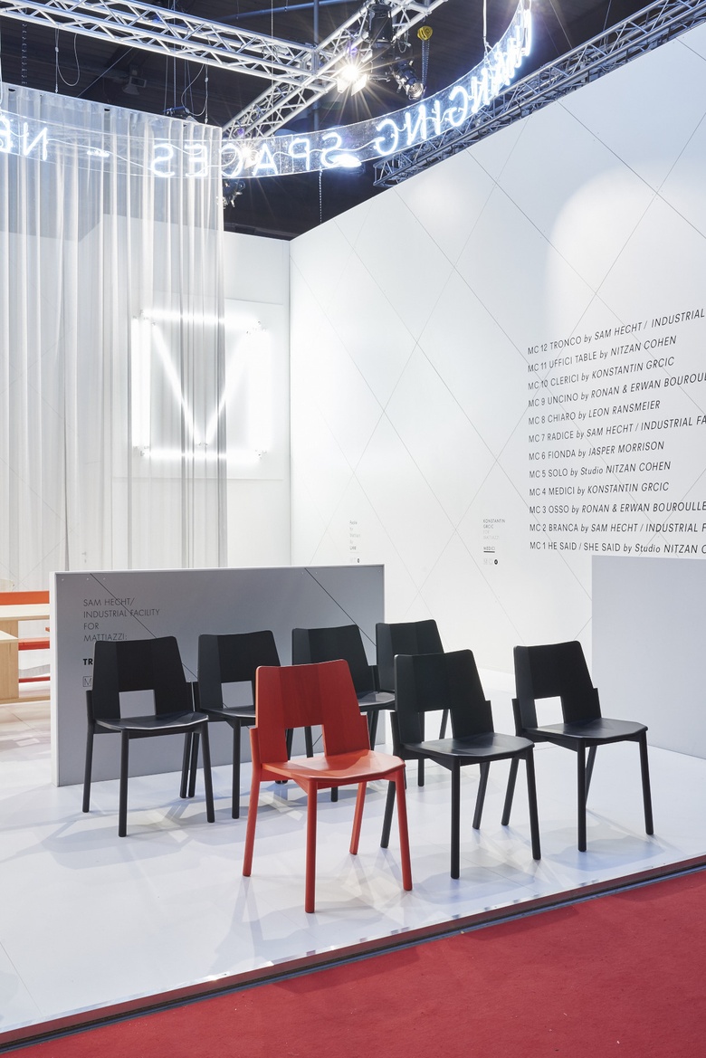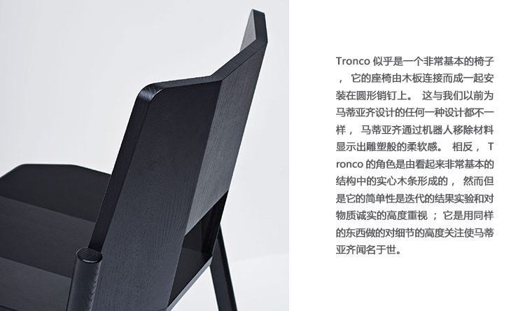 Tronco是一个非常基本的椅子,它的座椅由木板连接而成一起安装在圆形销钉上。这与我们以前为马蒂亚齐设计的任何一种设计都不一样,马蒂亚齐通过机器人移除材料显示出雕塑般的柔软感。相反,Tronco的角色是由看起来非常基本的结构中的实心木条形成的,然而但是它的简单性是迭代的结果