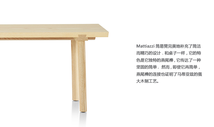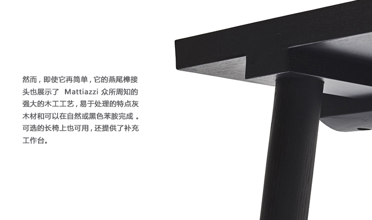 简易桌的设计是由于我们寻求在我们现在的Mattiazzi系列的12个产品系列之间架起一座桥梁的结果。我们正在寻找一张简单的(“简易”的)桌子,它可以和任何一个收藏品的椅子一起使用。这就是这个名字的来源,尽管我们可以用这个马蒂亚齐工艺的例子来命名它“Rondine”,或者更准确地说是“Coda di Rondine”。这种选择的灵感来源于它在我们矿区的家具中的使用,在那里我们注意到了它平淡无奇的、简单的美。它已经在那里使用了几个世纪,通常是为了确保