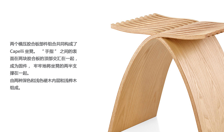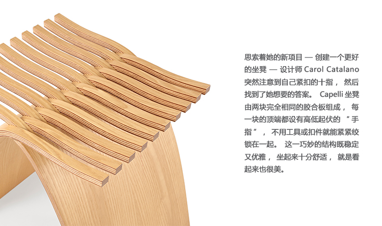 Catalano的“乐趣”成就了Capelli凳子。当她从自己的双手找到灵感之后,通过研究舒适就坐方面的人体工程学设计,她很快提出了几个坐凳设计想法。利用纸板和泡沫模型,她和Catalano Design设计室的工作人员不到两个月就将Capelli坐凳,从一个设计概念变成了值得在博物馆陈列的优质产品。
