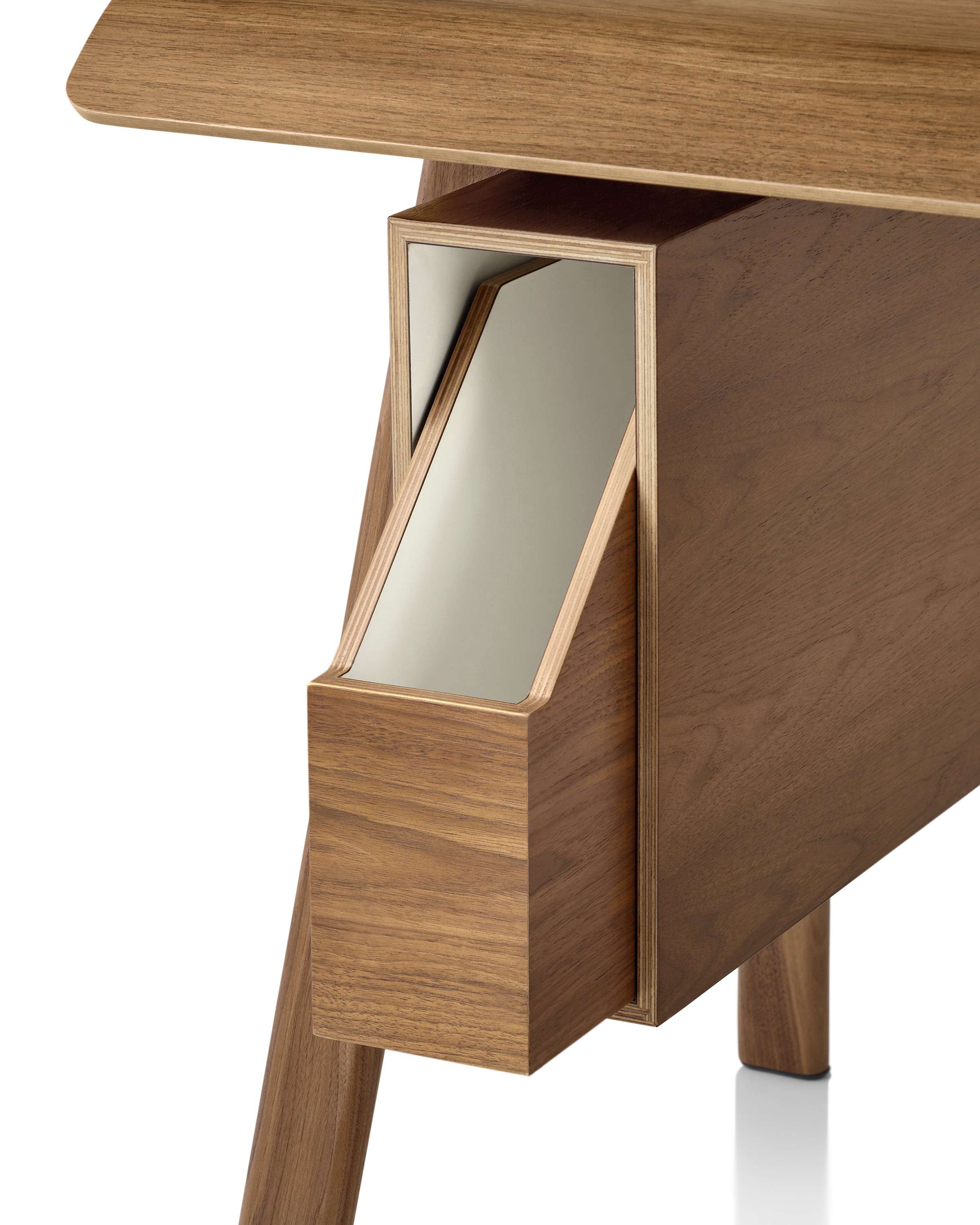 没有存储部件,Distil就是一张优雅的桌子。无论在竖直方向还是水平方向加上存储部件,Distil就变成了办公桌。通过巧妙的设计,使设备和充电器触手可及而又位于视线之外,Distil衬有层压板的存储单元安装在左侧或右侧。可拆卸的内置抽屉使桌面的面积在“盒中”增加了一倍,天鹅绒底面确保物品不会损坏内饰面。