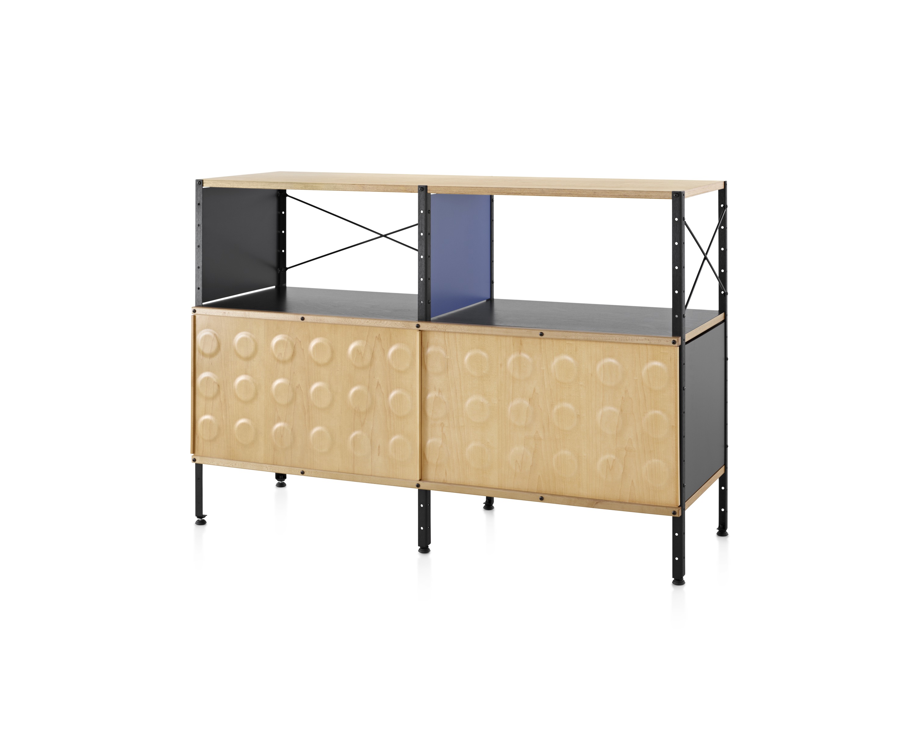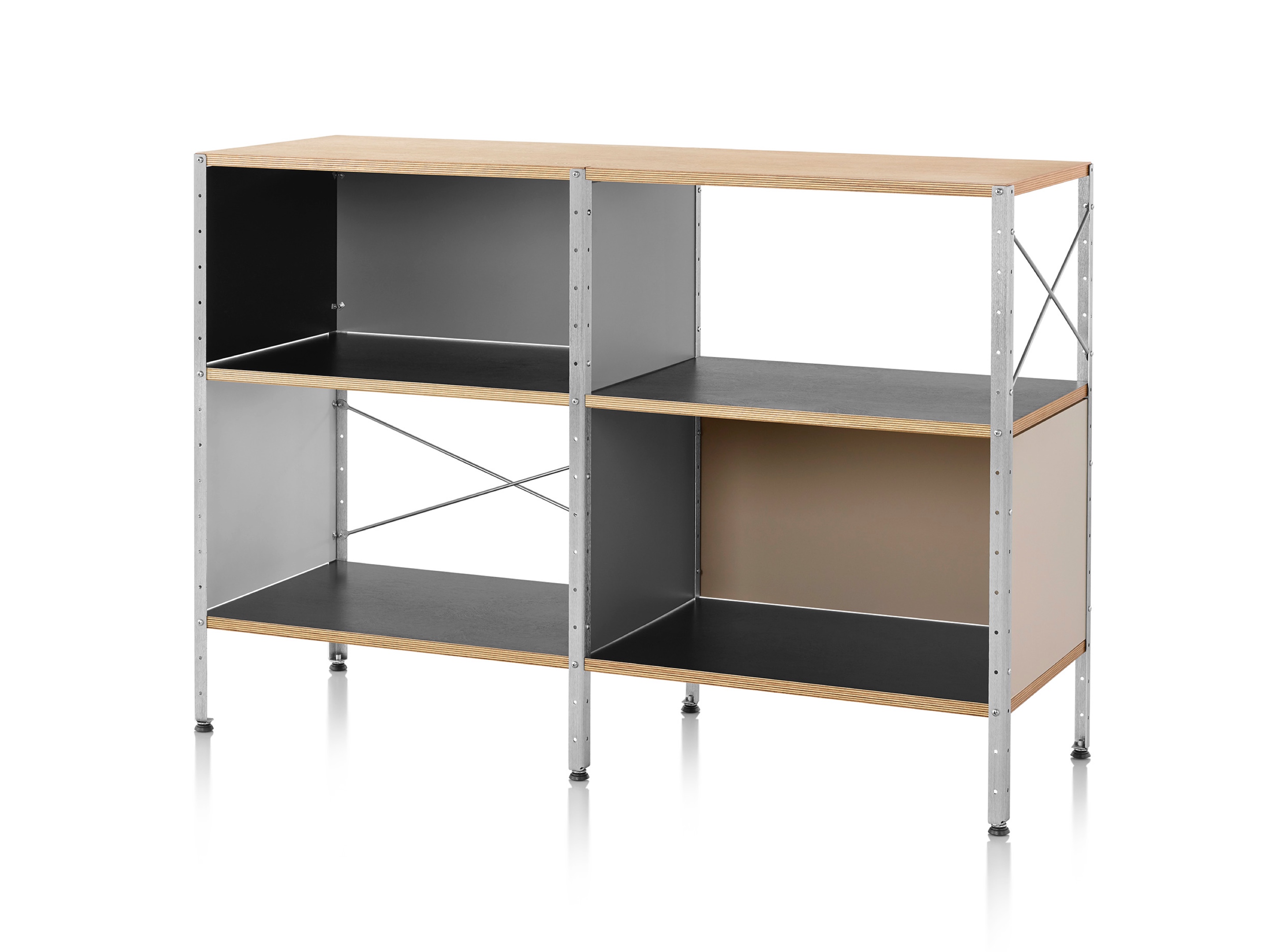 Eames存储单元由五种配置和四种大小的箱子、橱柜和抽屉组成。立柱、交叉支撑板和穿孔板要么是镀锌的,要么是黑色的;橱柜的正面是凹凸不平的胶合板;抽屉的正面和架子是模制的胶合板;箱体侧面和背面的面板是涂硬木的。可供您选择两种配色方案:中性色或亮色。
