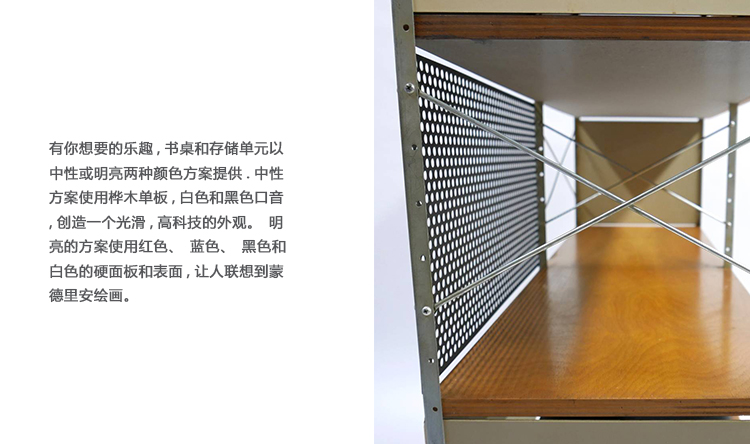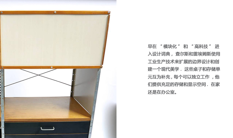 他们在底特律艺术学院为1949年的一次展览所做的工作,Eames Desk Units和Storage Units展示了“机器美学”和日本风格对当时的Eameses有重要影响。早在“模块化”和“高科技”进入语言之前,Charles和Ray Eames就以多种方式将标准化部分结合起来,创造出适合家庭和办公室各种用途的实用家具。