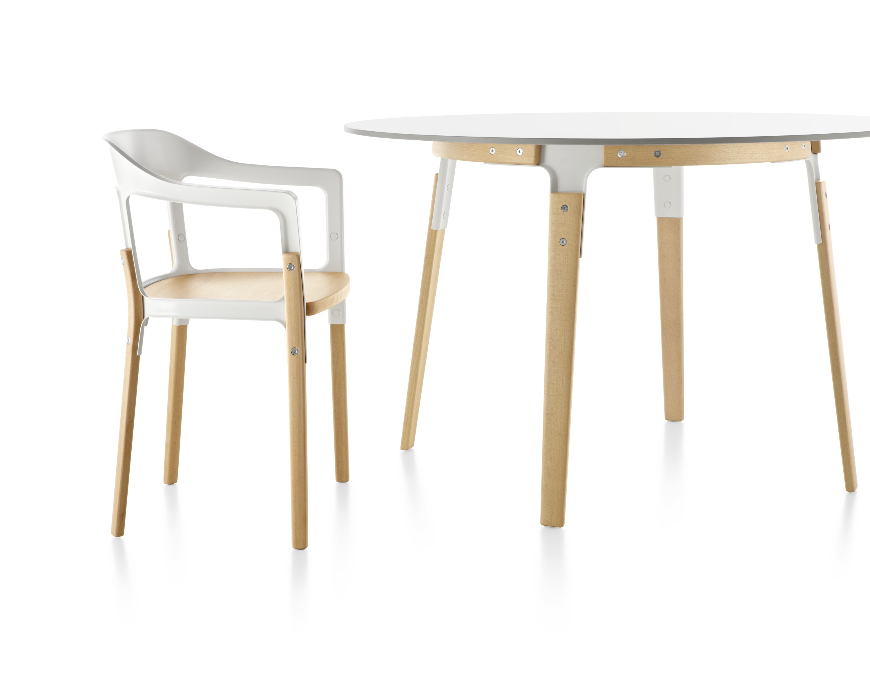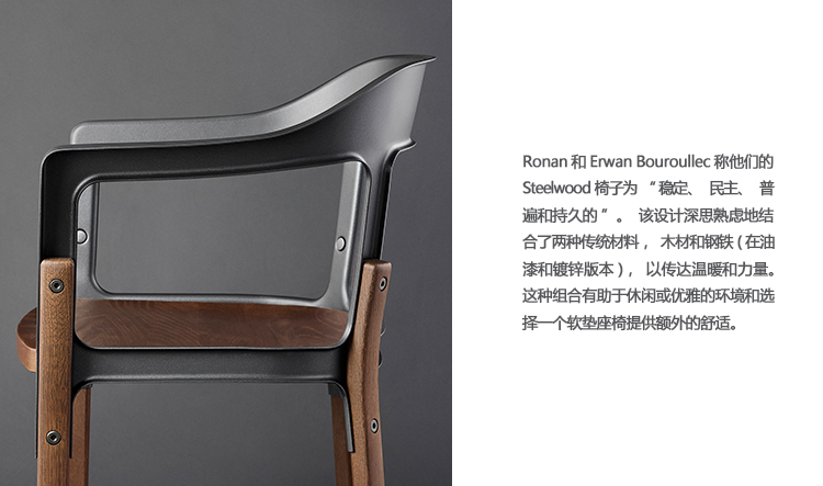 Ronan和Erwan Bouroullec称他们的Steelwood椅子“稳定、民主、普遍、持久”。“设计巧妙地结合了两种传统材料,木材和钢材(涂漆和镀锌版本)来传达温暖和力量。”这种组合有助于休闲或优雅的设置和选择的软垫座椅提供额外的舒适。