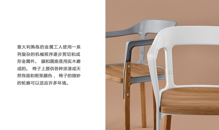 在意大利,熟练的金属工人使用一系列复杂的机械程序来逐渐剪切和成形金属件。腿和圆形座椅是用实木磨成的。提供了一系列的油漆或自然的装饰和框架颜色,椅子微妙的轮廓适应了许多环境。