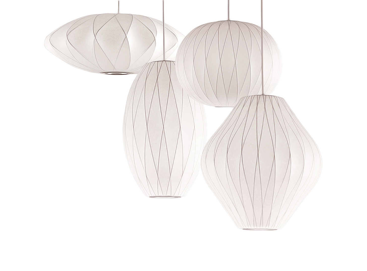 Nelson Cigar Crisscross Bubble Pendant雪茄形十字气泡吊灯可提供两种尺寸,与不锈钢吊线板配套,通过一根6英寸的吊绳悬挂在天花板上。George Nelson最初于1952年设计出气泡灯,当时他偶然发现了一款瑞典吊灯,打算买回去放到自己办公室里使用。但那款吊灯高昂的价格让他犹豫了,于是决定自行设计。其结果就是一系列简单的球状外形面世了,比如圆圆的苹果、宽大的杯托和造型优美的梨,等等。