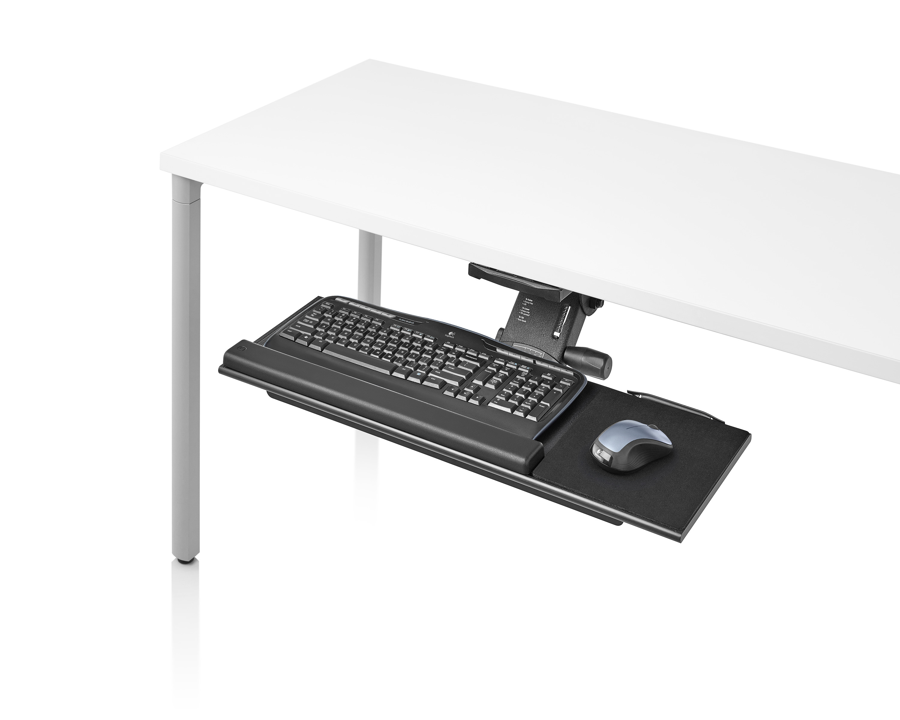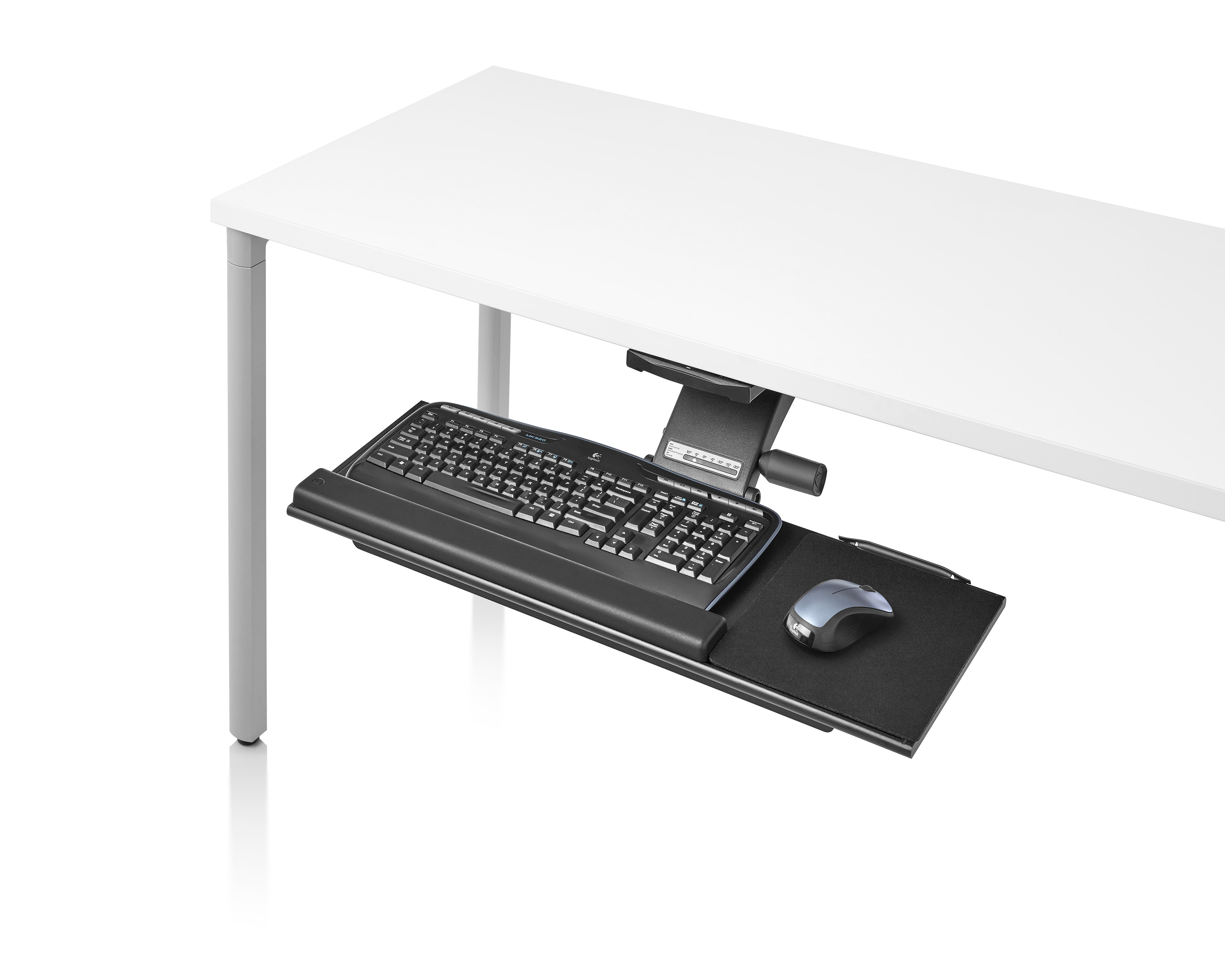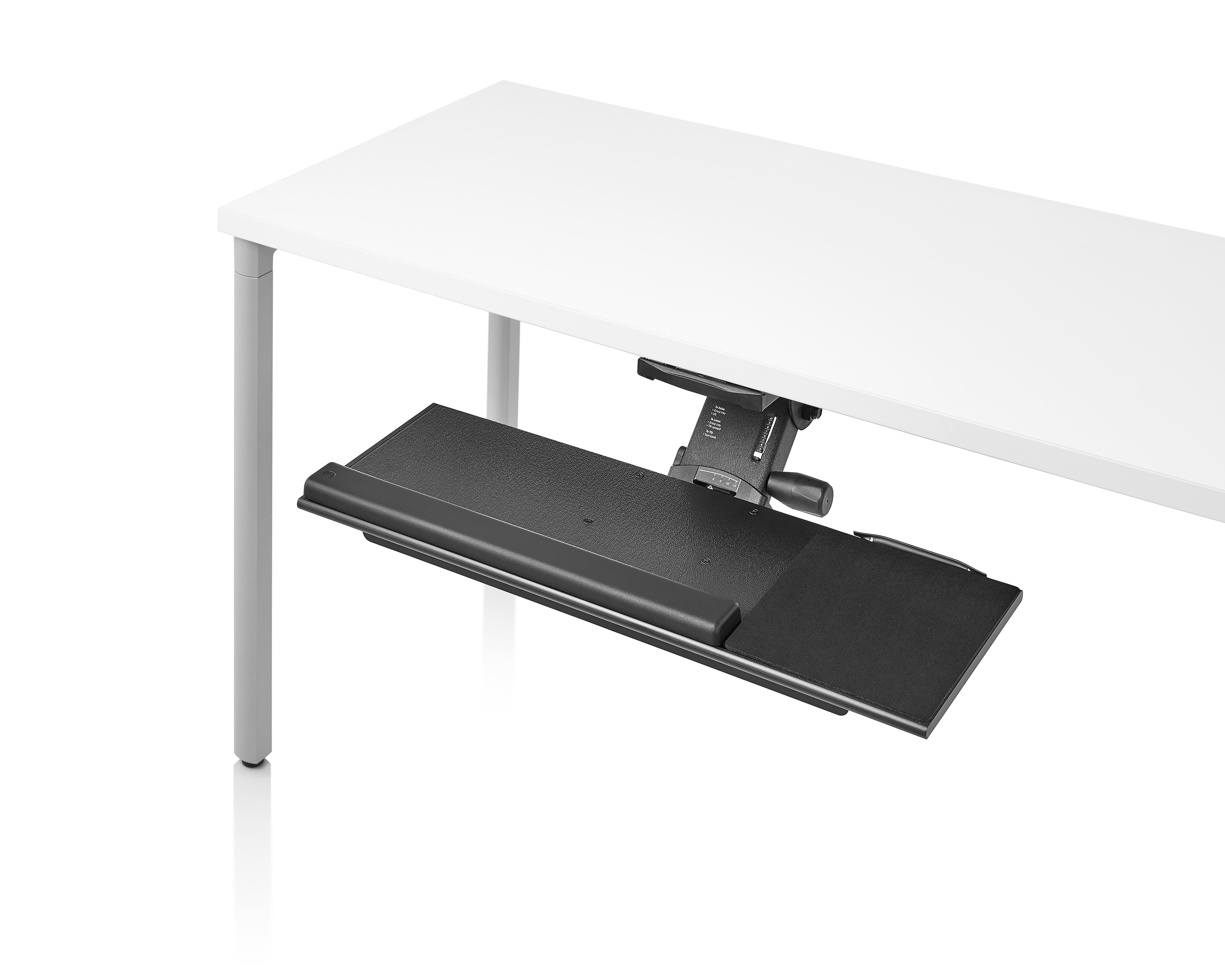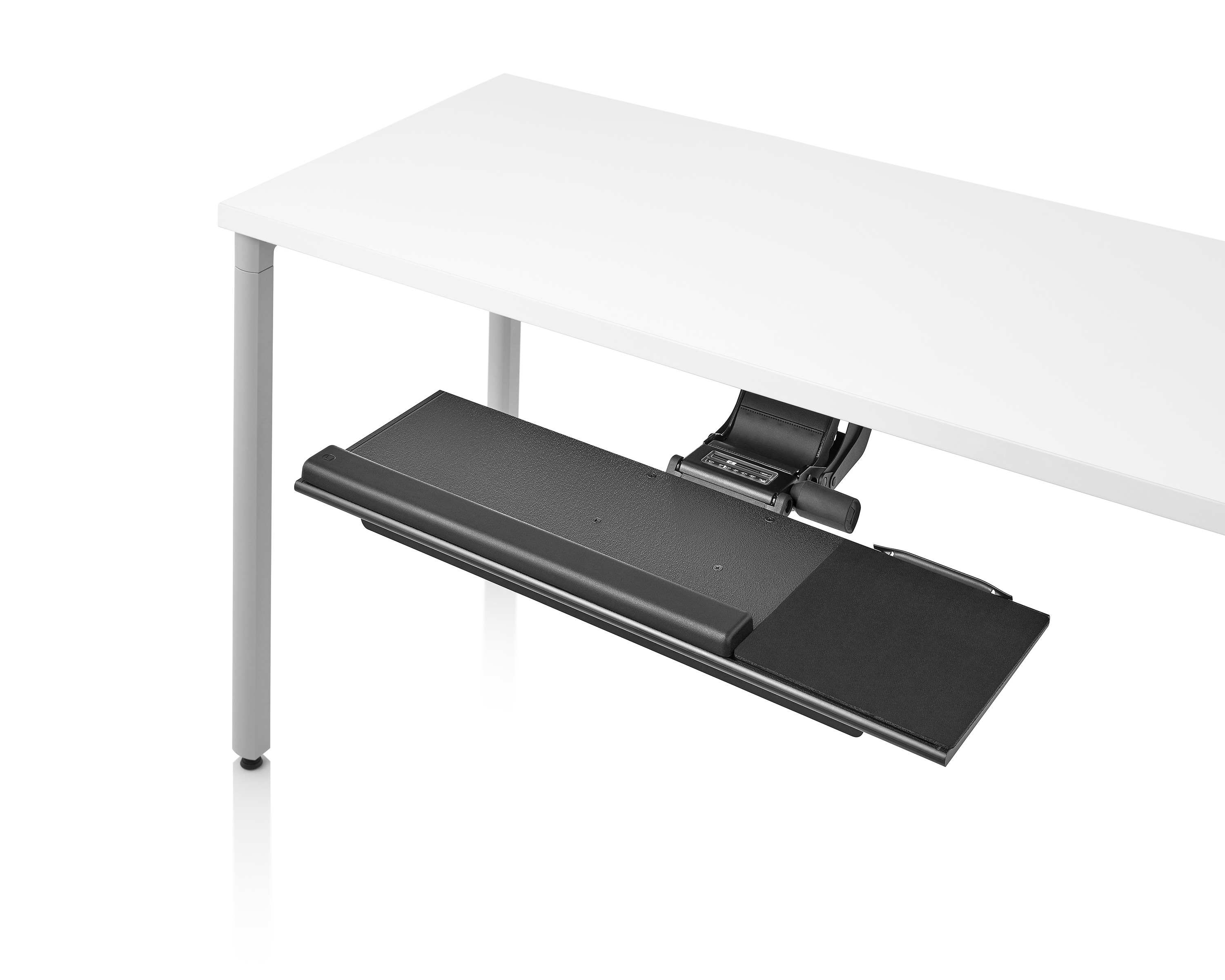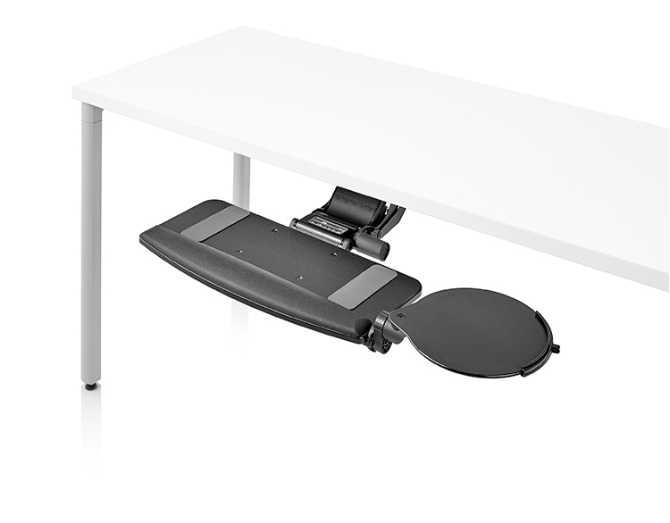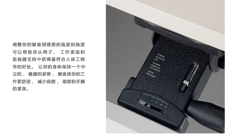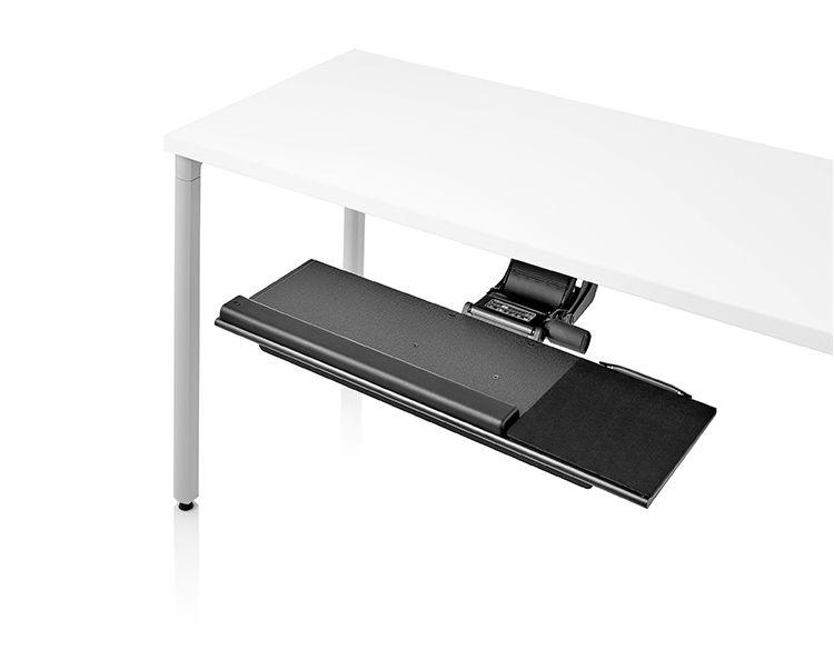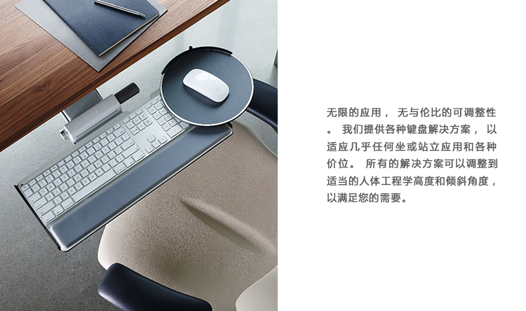 为了像你一样努力工作,我们的键盘支持连接到工作表面的底部,使你的键盘表面在适和你身体定位的高度和角度。高度和倾斜的调整范围很广,确保了所有人和家具的健康位置。当你需要打字的时候,机械装置就会伸出来,当你不使用时,机械装置就在工作表面下整齐的储存