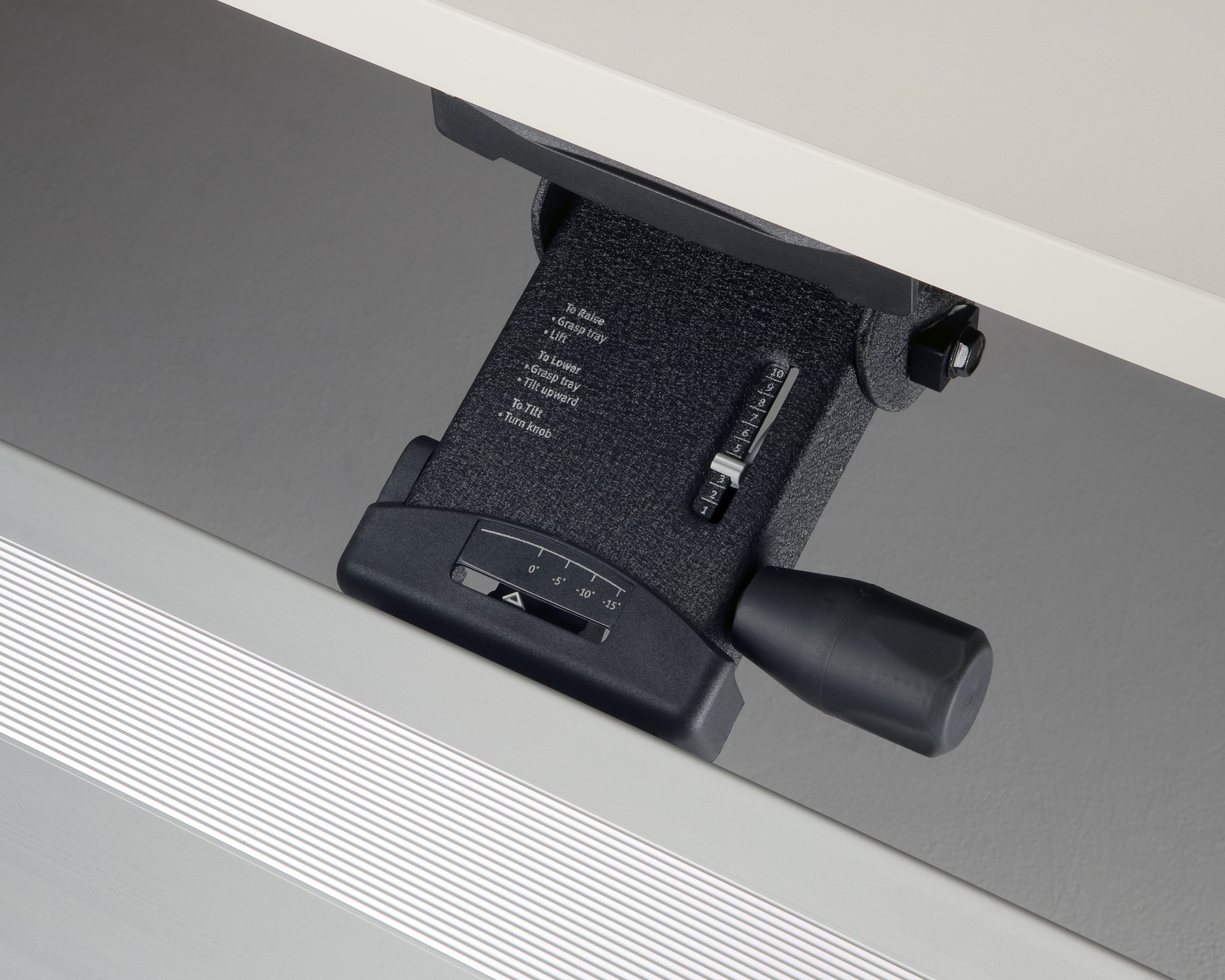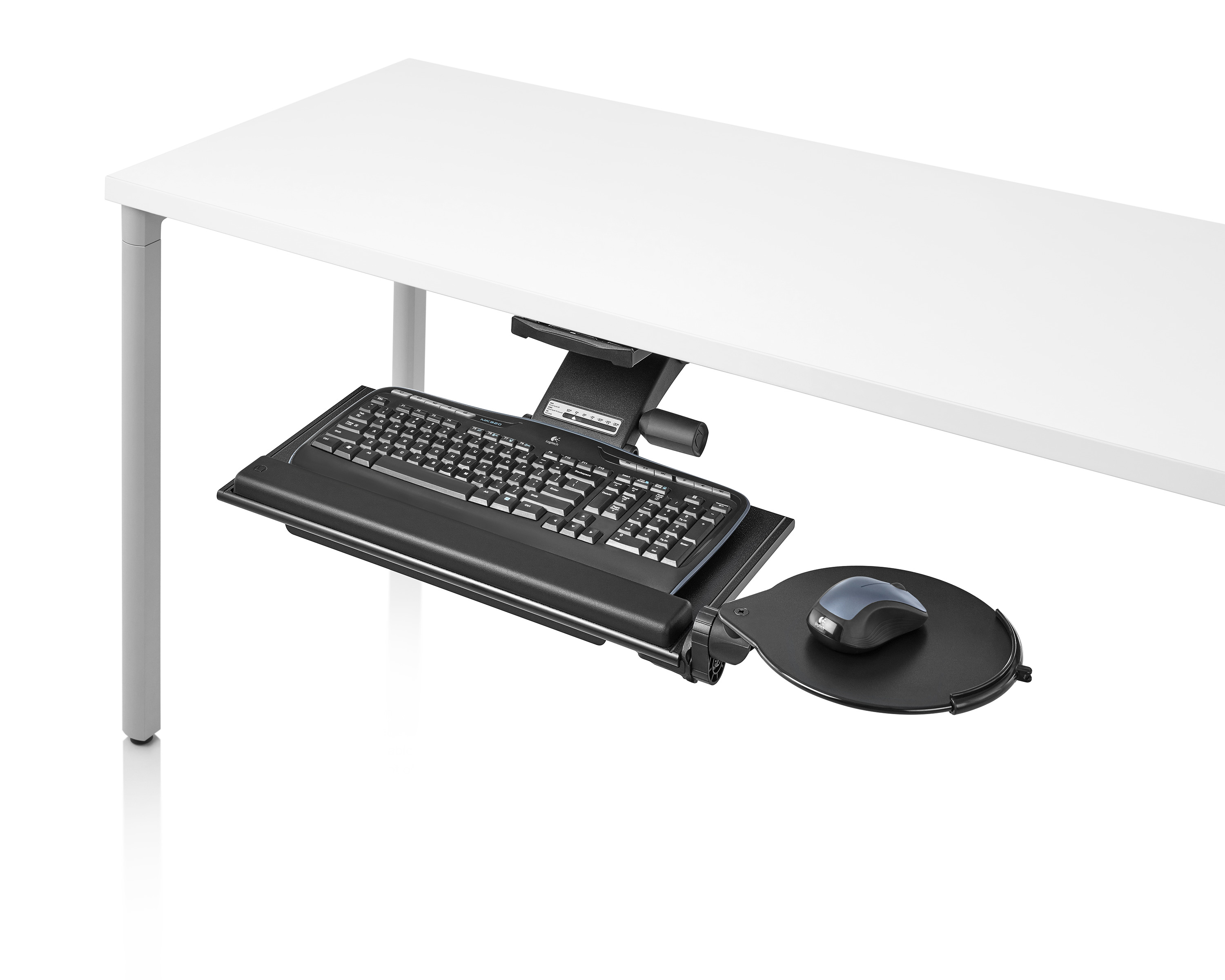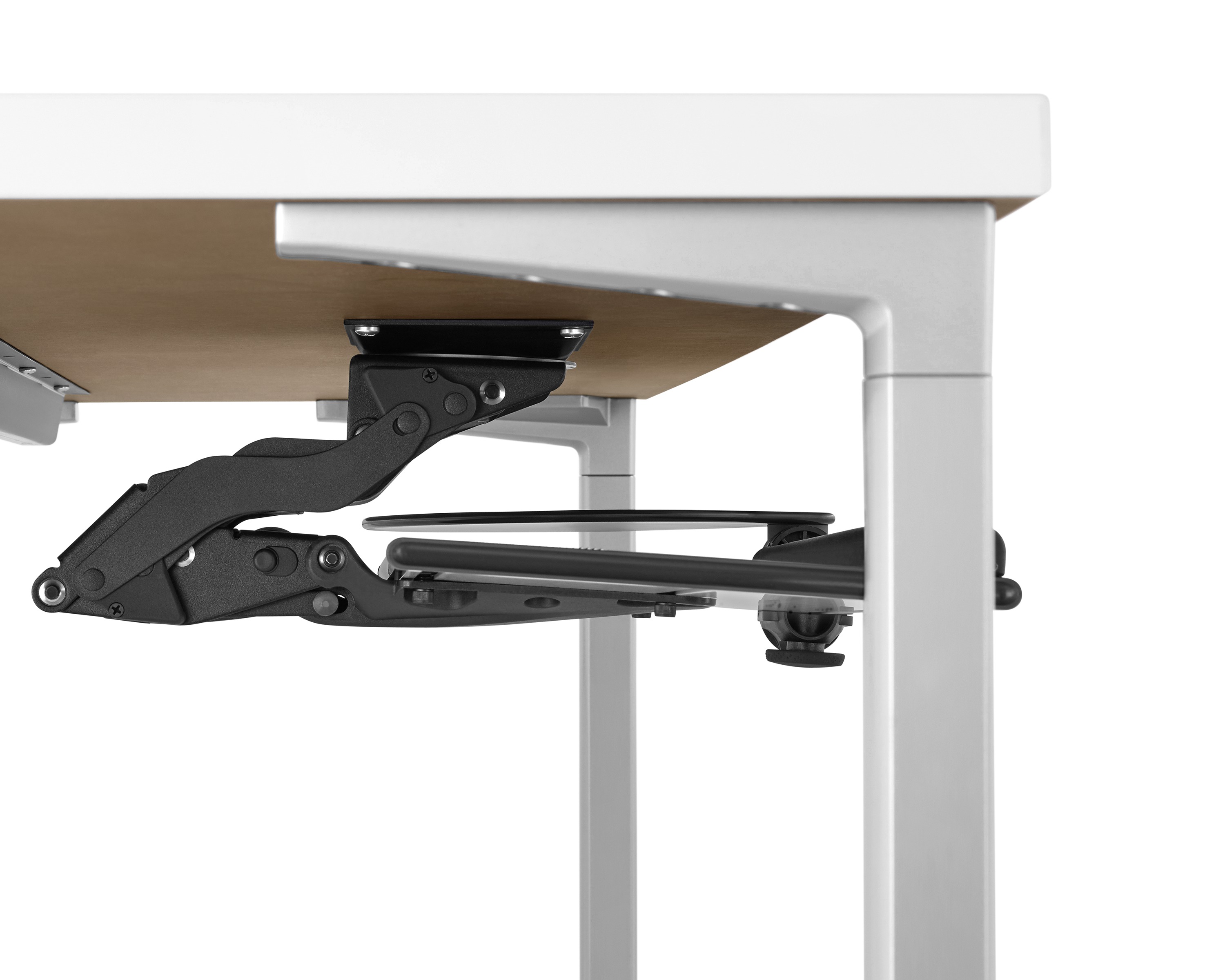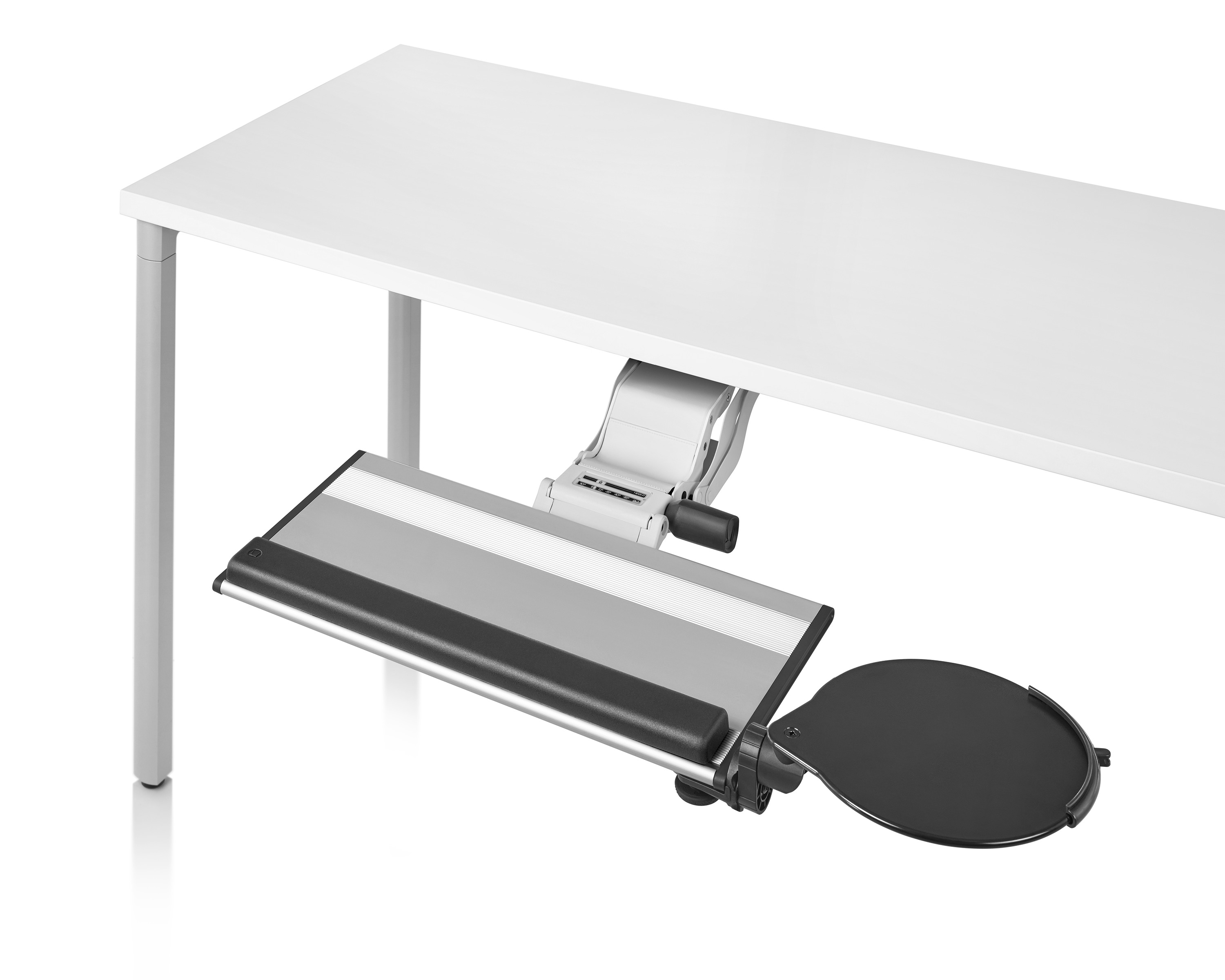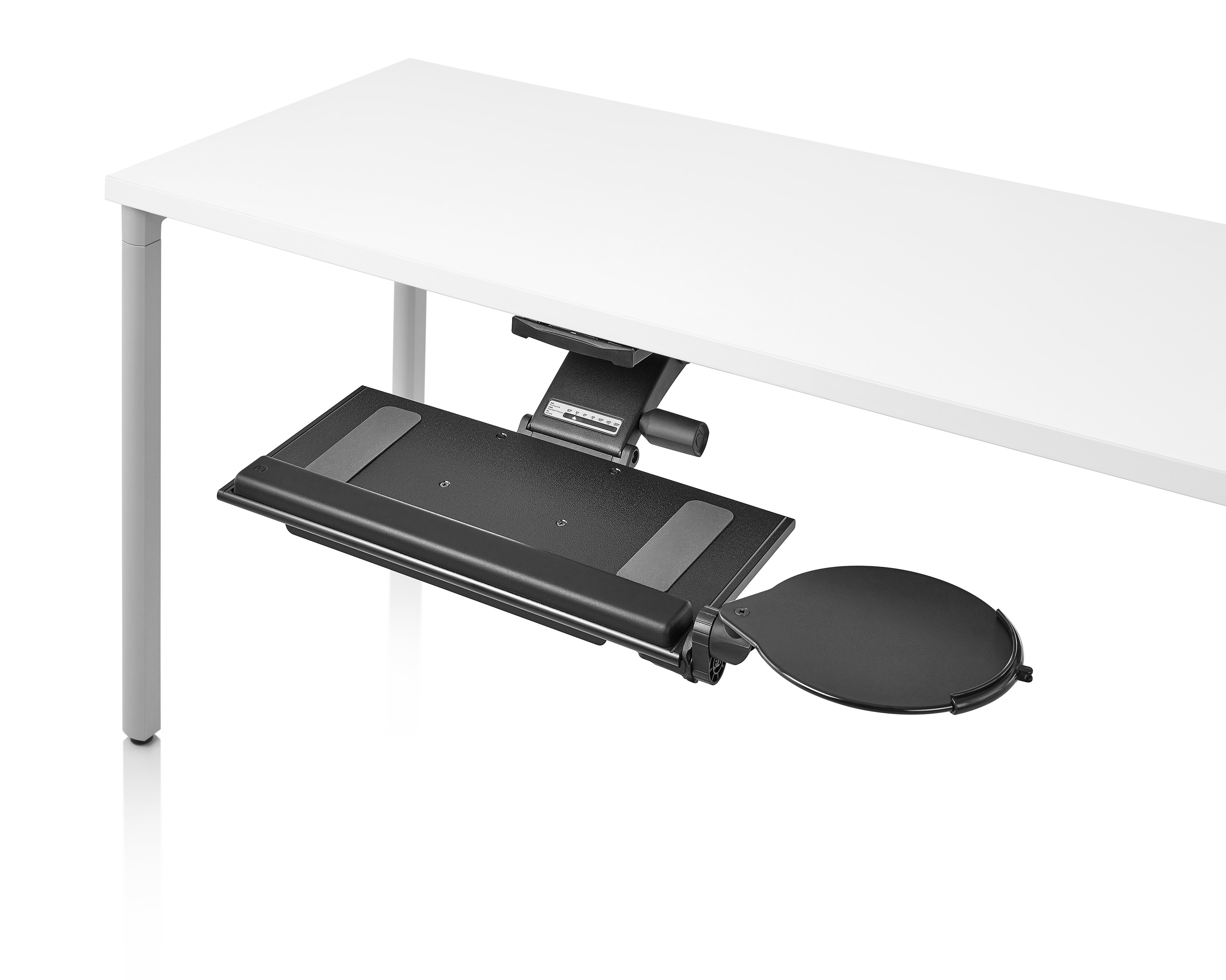 为了像你一样努力工作,我们的键盘支持连接到工作表面的底部,使你的键盘表面在适和你身体定位的高度和角度。高度和倾斜的调整范围很广,确保了所有人和家具的健康位置。当你需要打字的时候,机械装置就会伸出来,当你不使用时,机械装置就在工作表面下整齐的储存