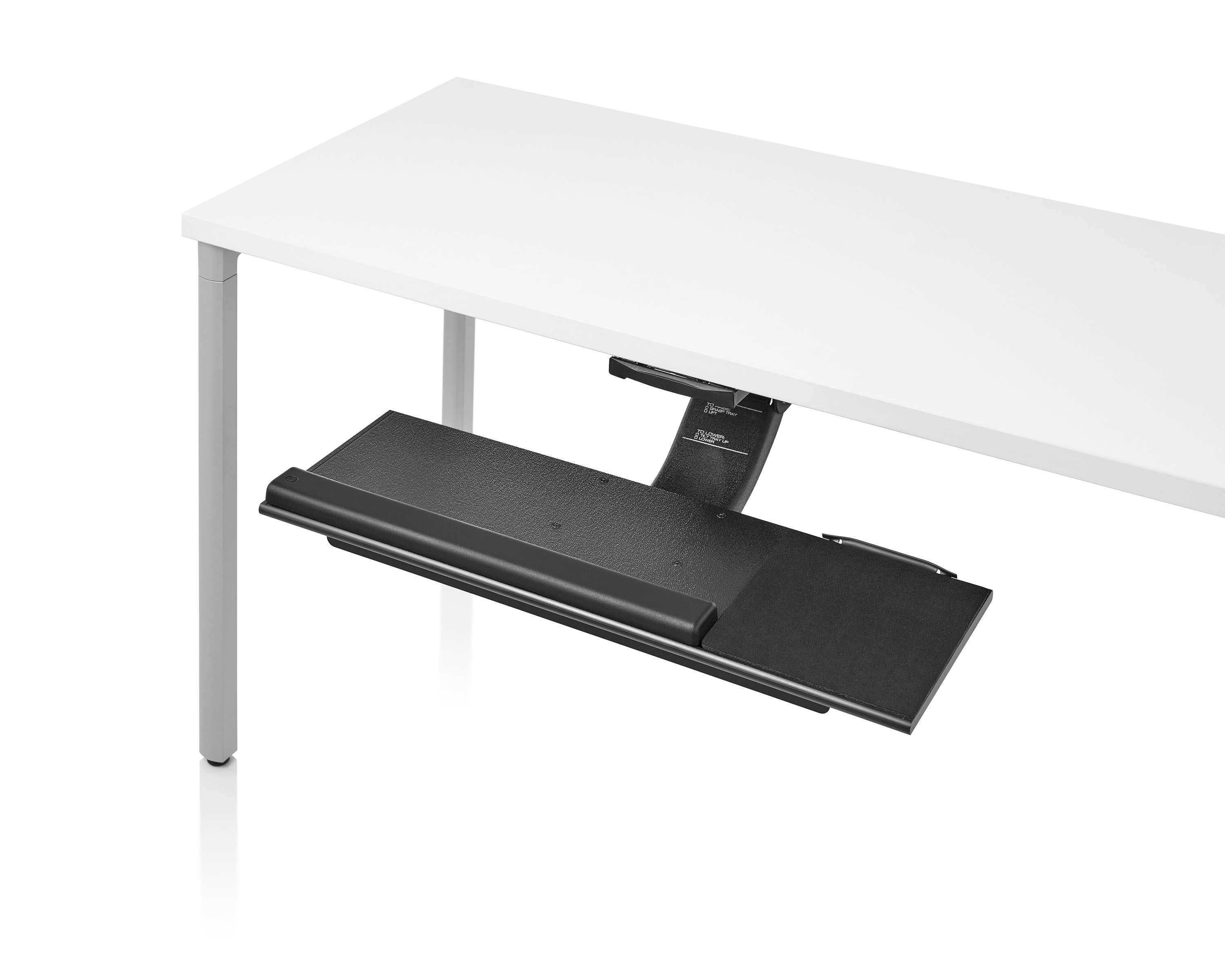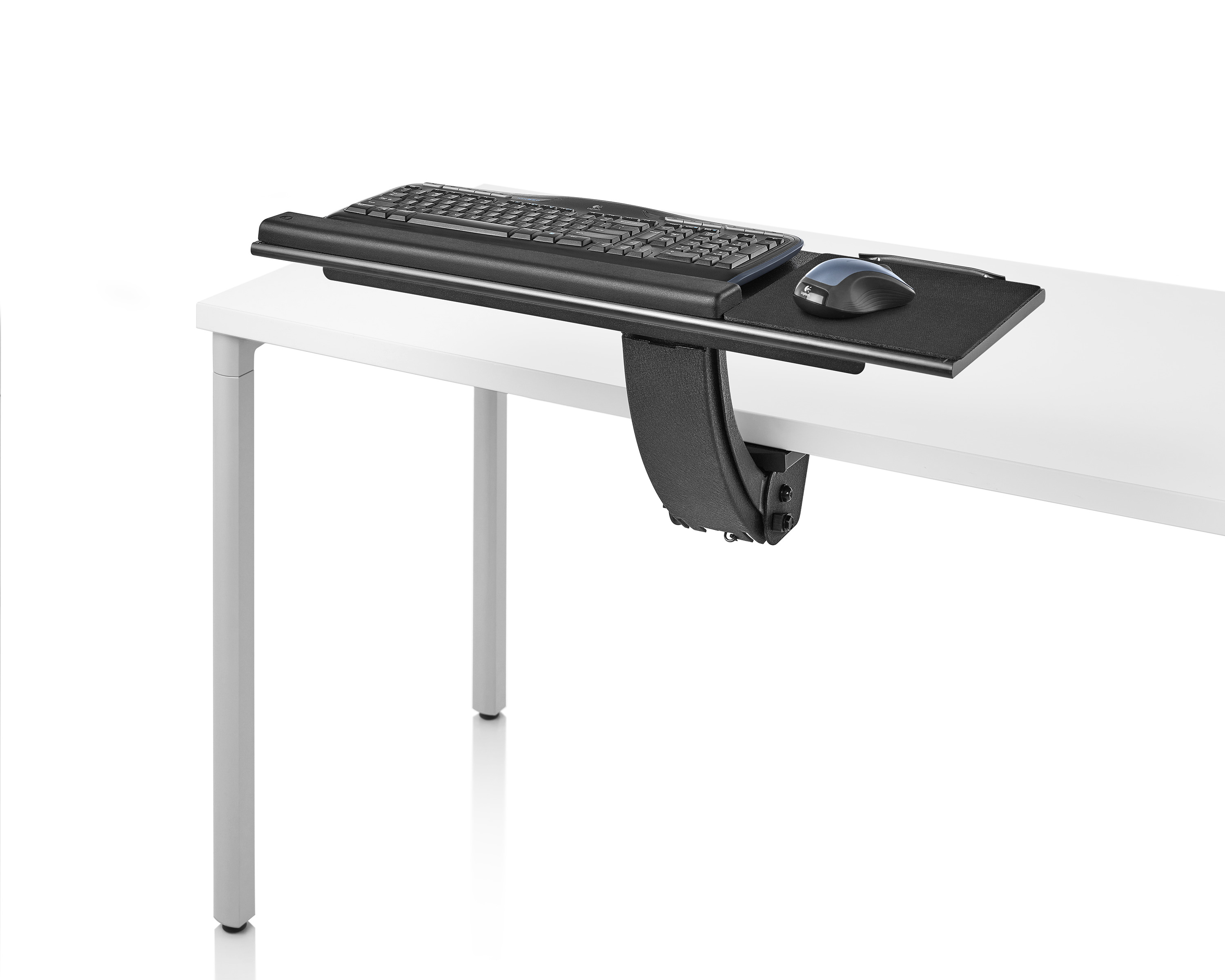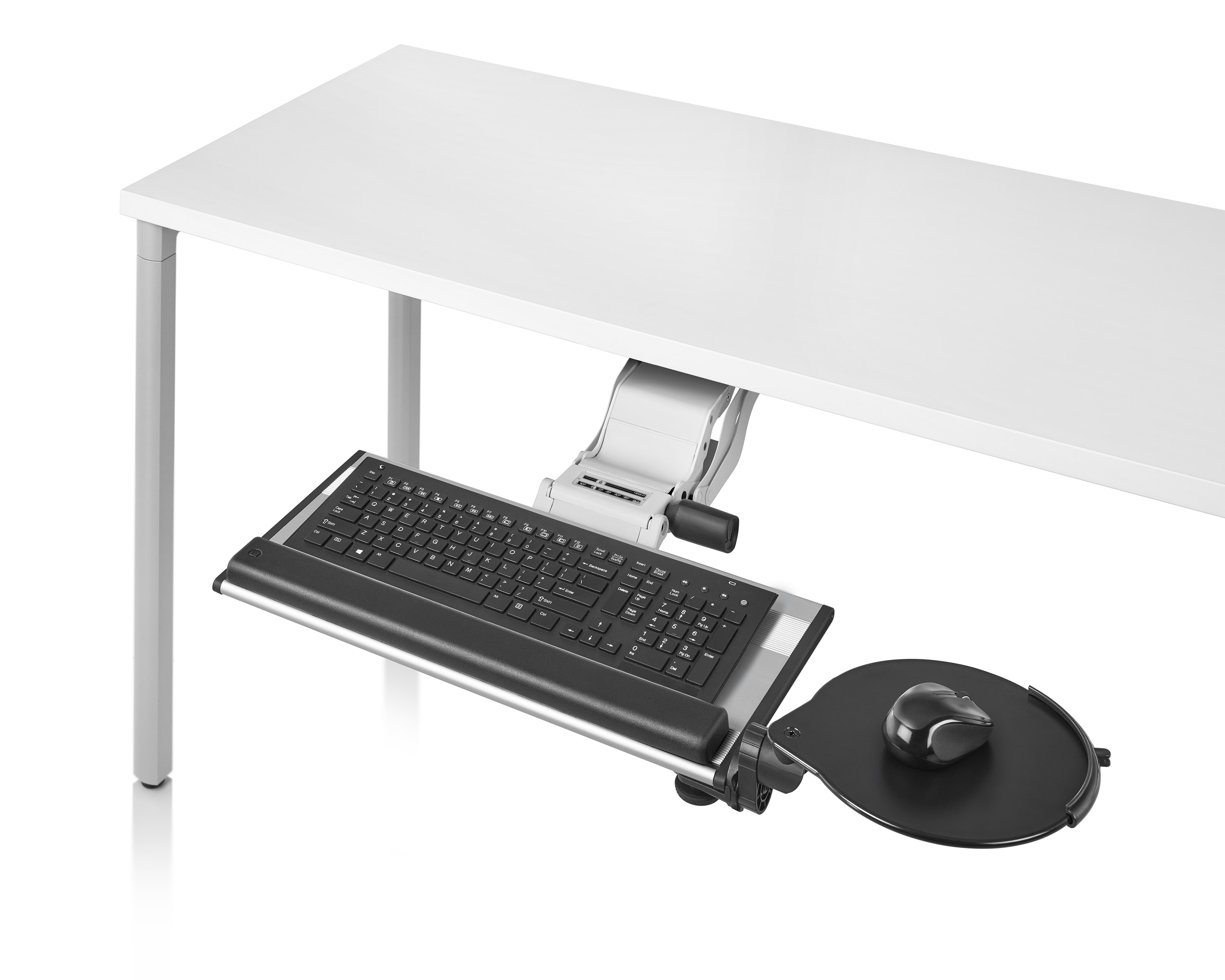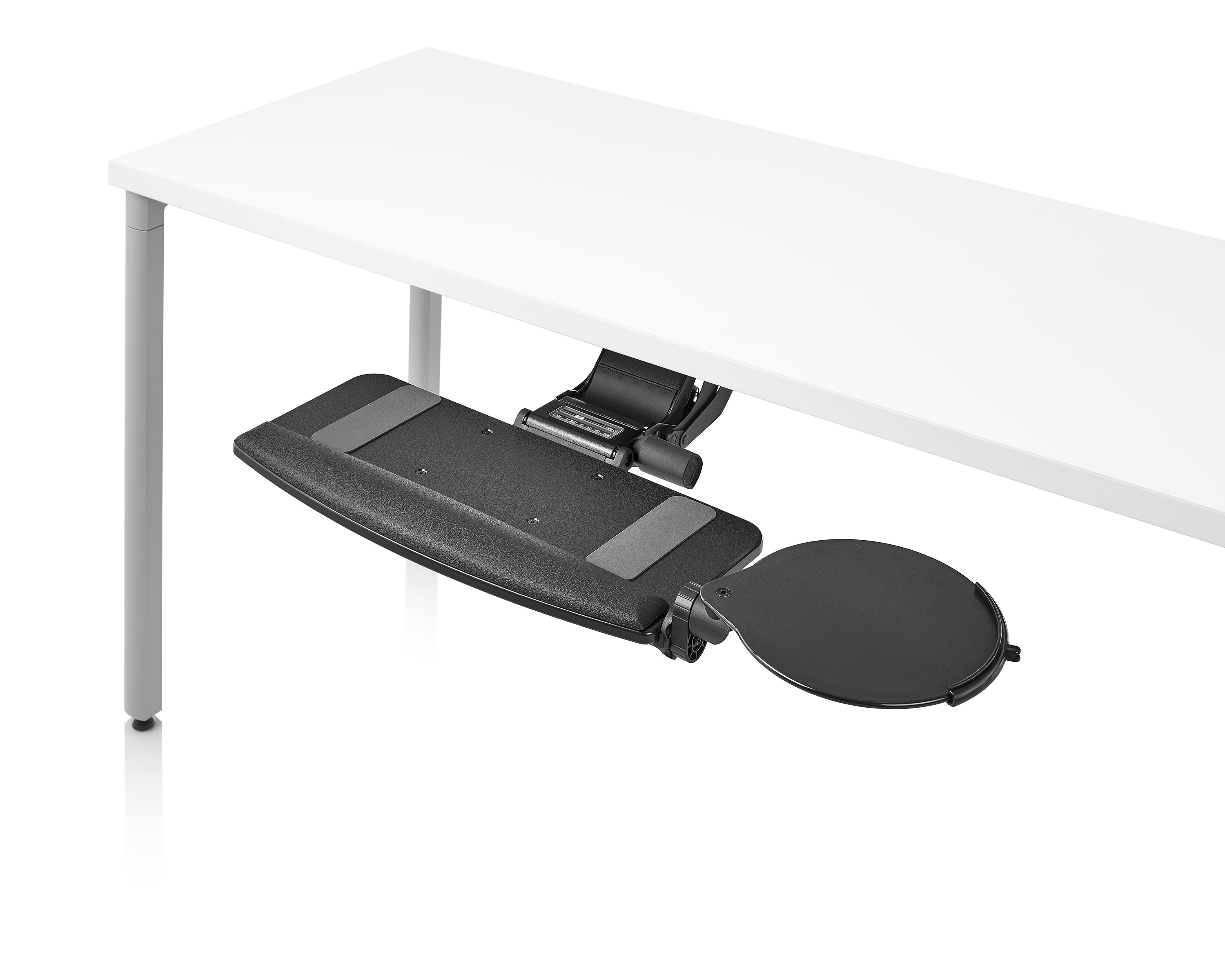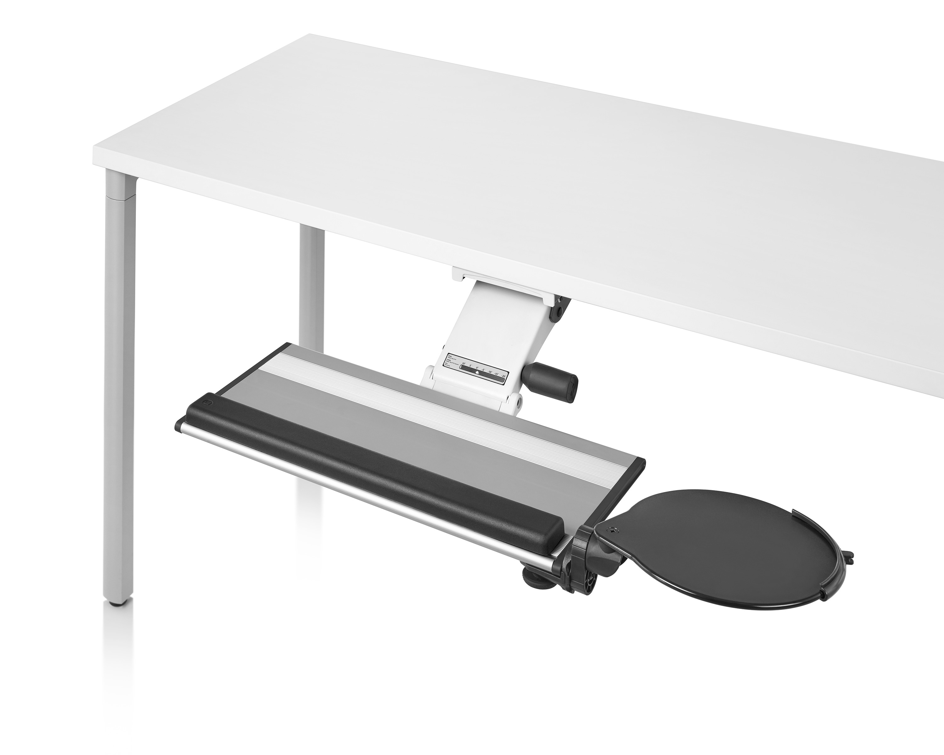 为了像你一样努力工作,我们的键盘支持连接到工作表面的底部,使你的键盘表面在适和你身体定位的高度和角度。高度和倾斜的调整范围很广,确保了所有人和家具的健康位置。当你需要打字的时候,机械装置就会伸出来,当你不使用时,机械装置就在工作表面下整齐的储存