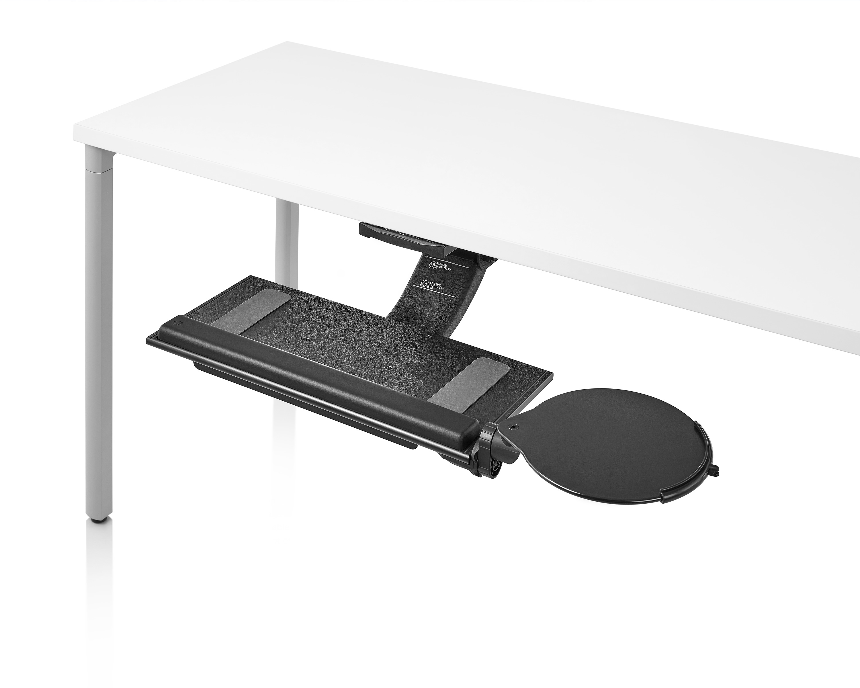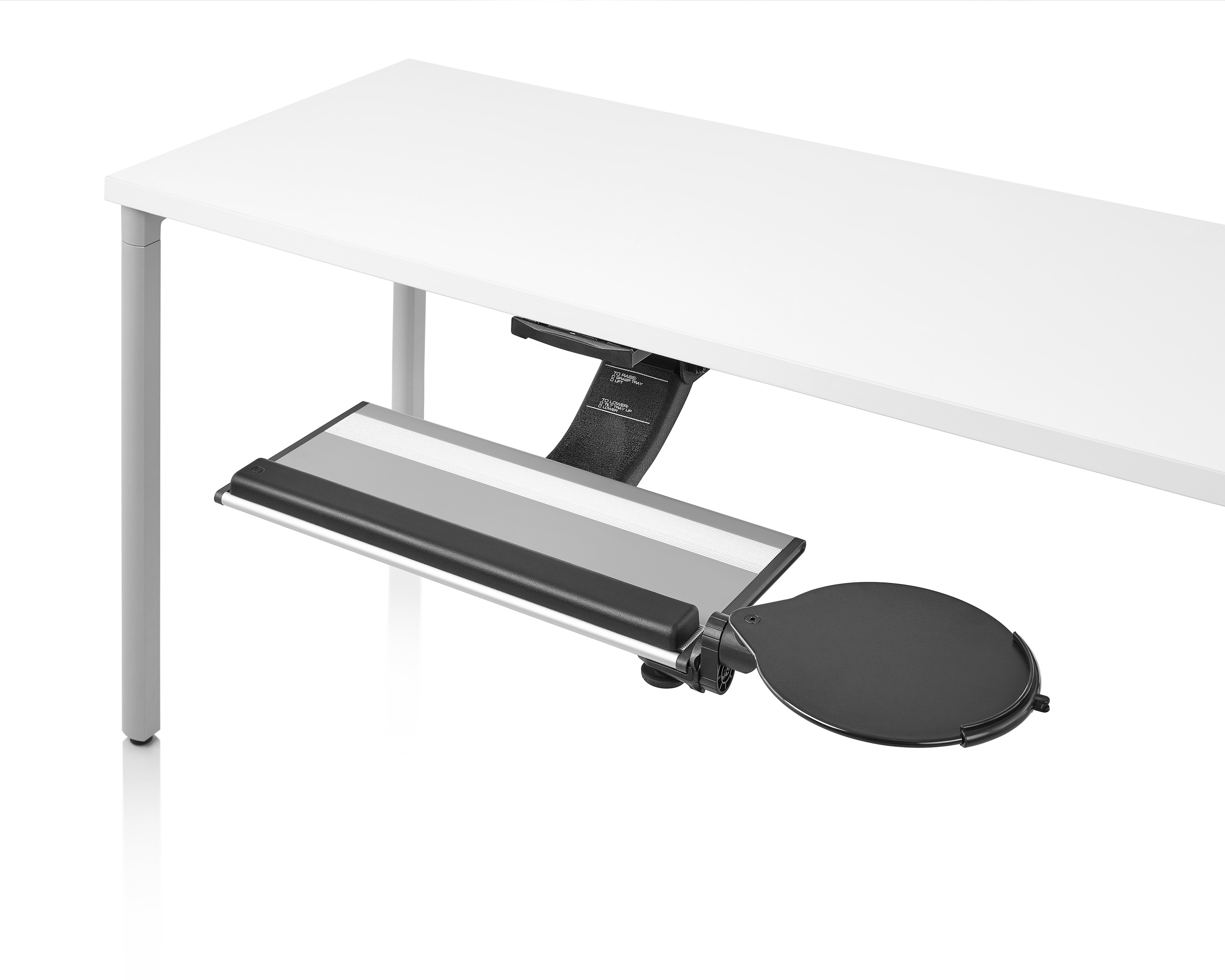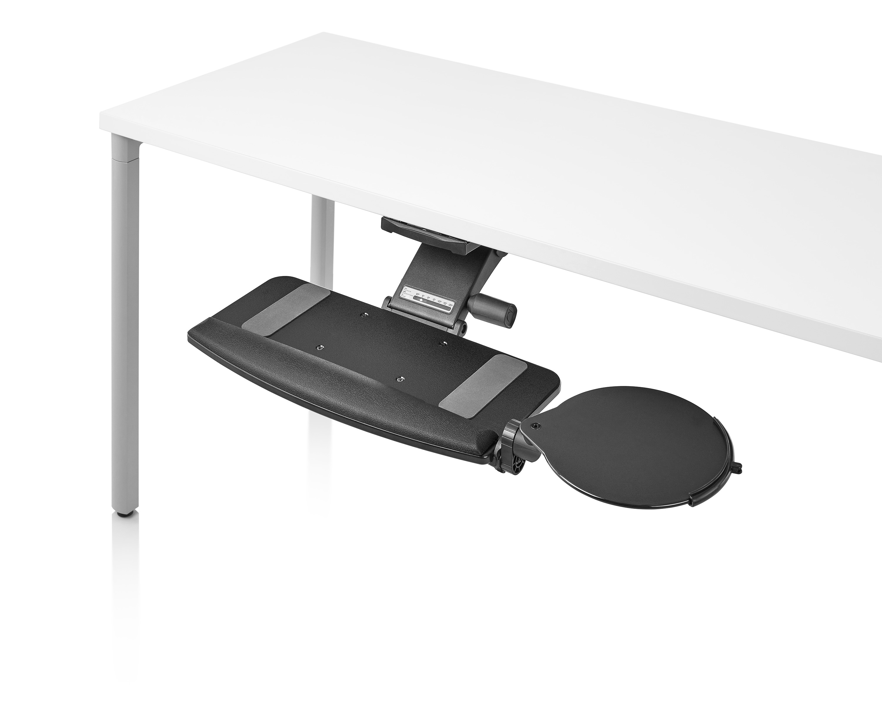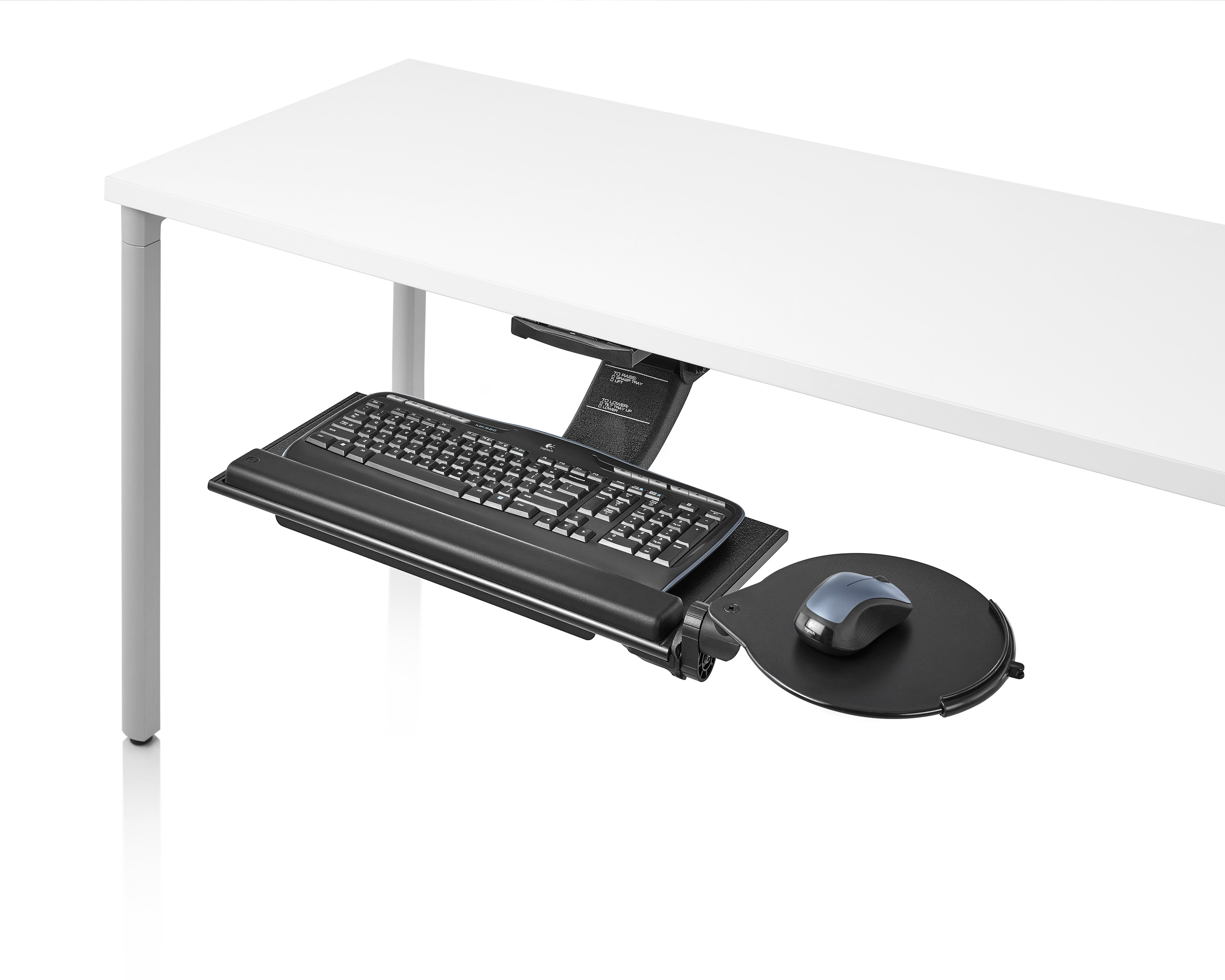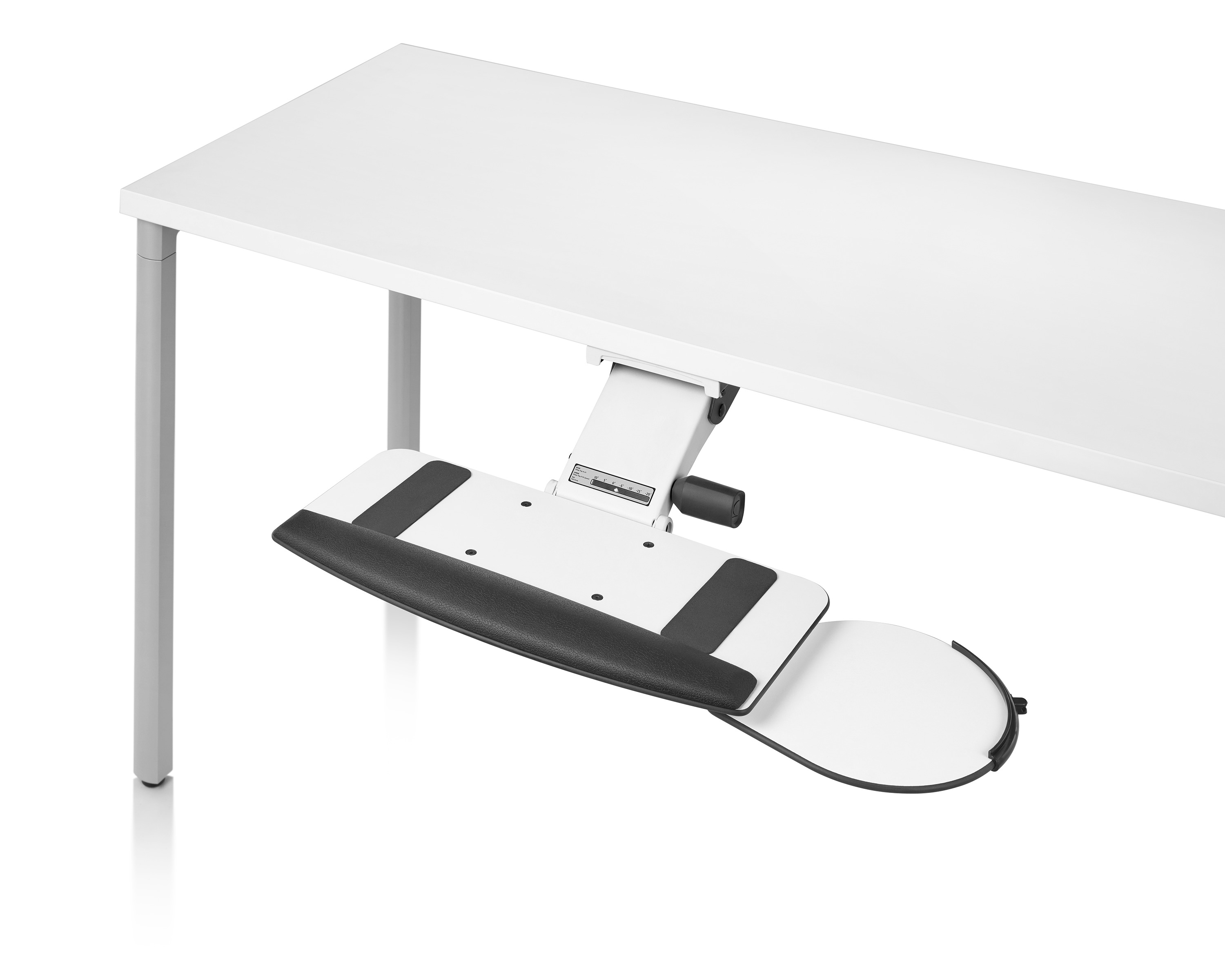 为了像你一样努力工作,我们的键盘支持连接到工作表面的底部,使你的键盘表面在适和你身体定位的高度和角度。高度和倾斜的调整范围很广,确保了所有人和家具的健康位置。当你需要打字的时候,机械装置就会伸出来,当你不使用时,机械装置就在工作表面下整齐的储存