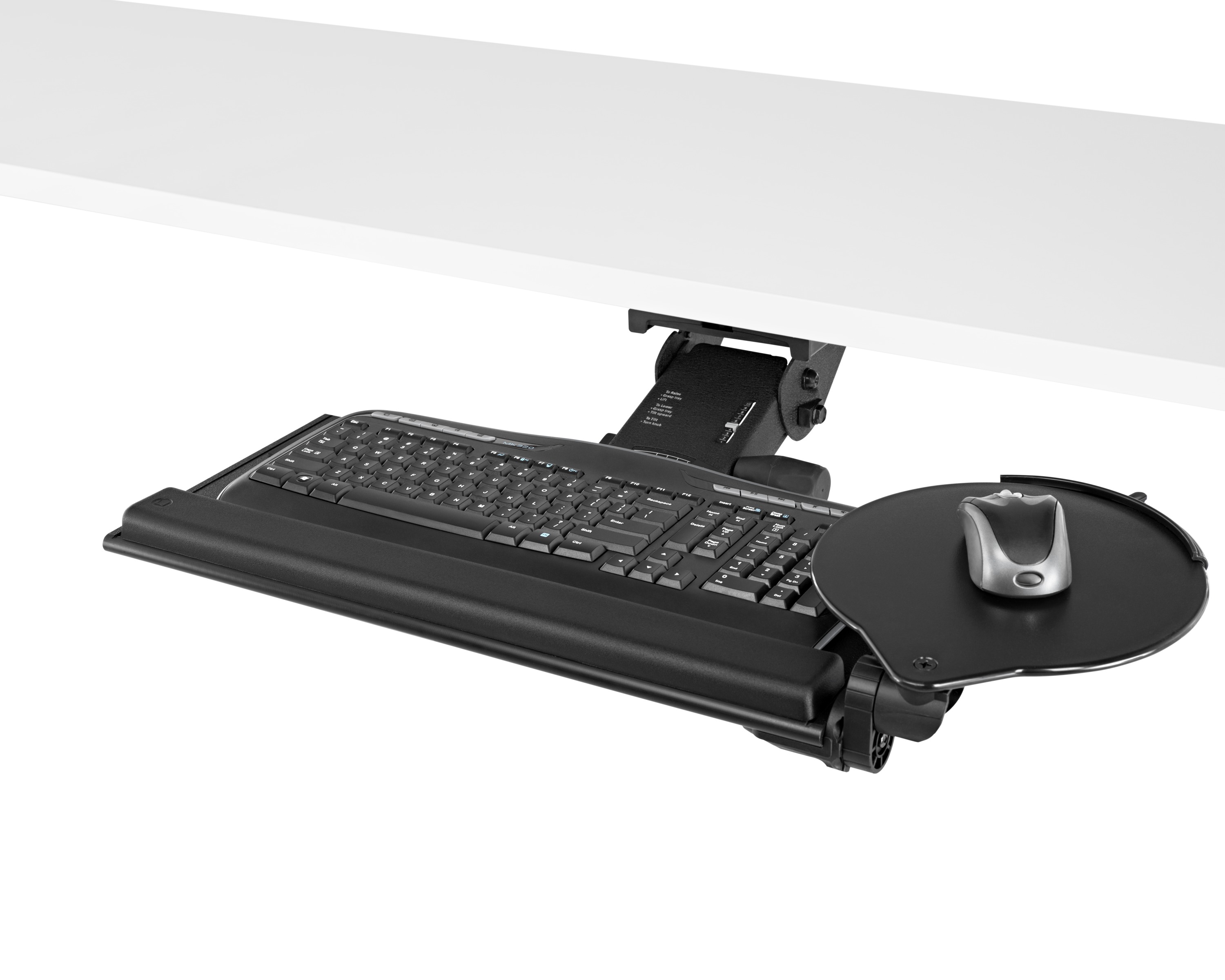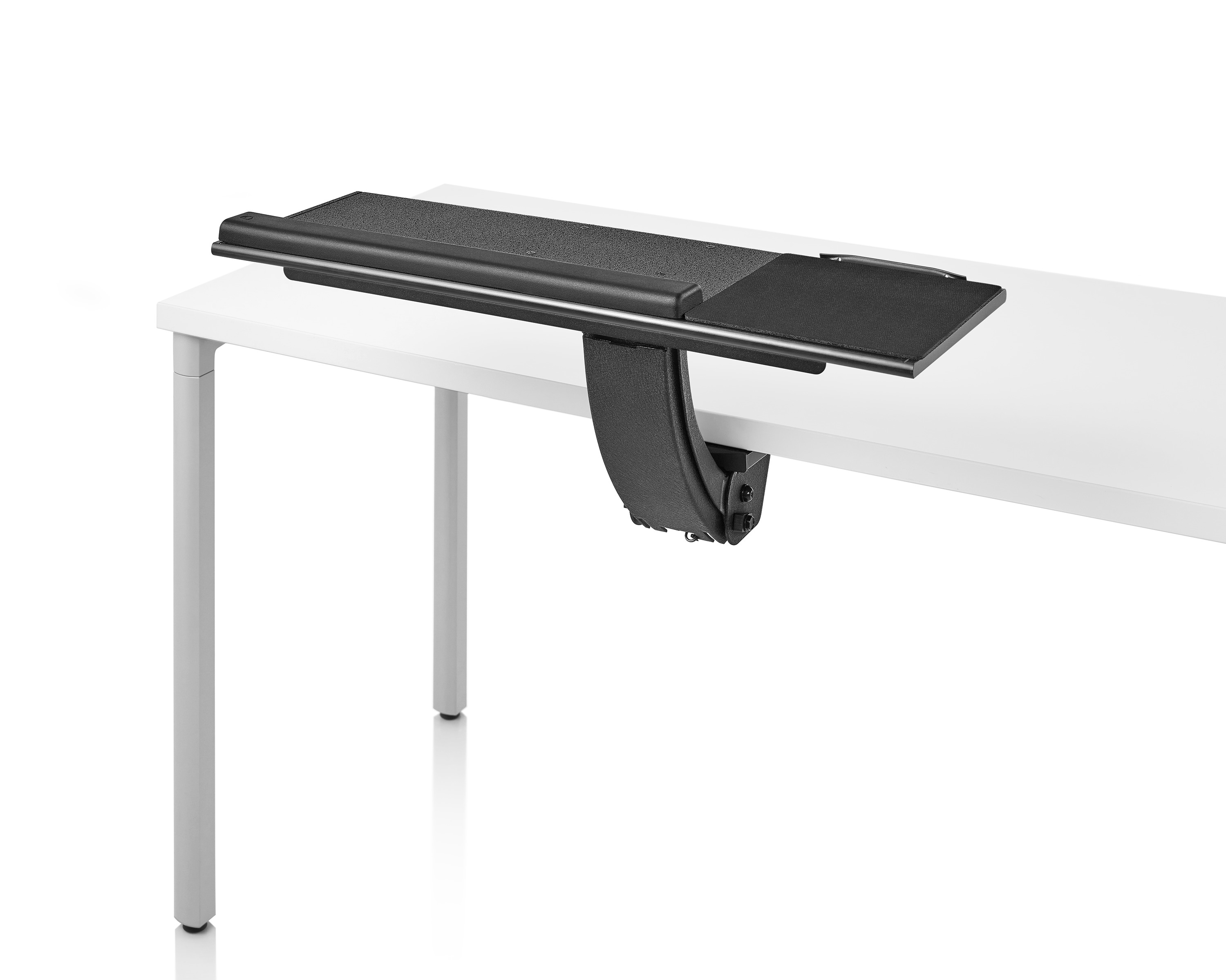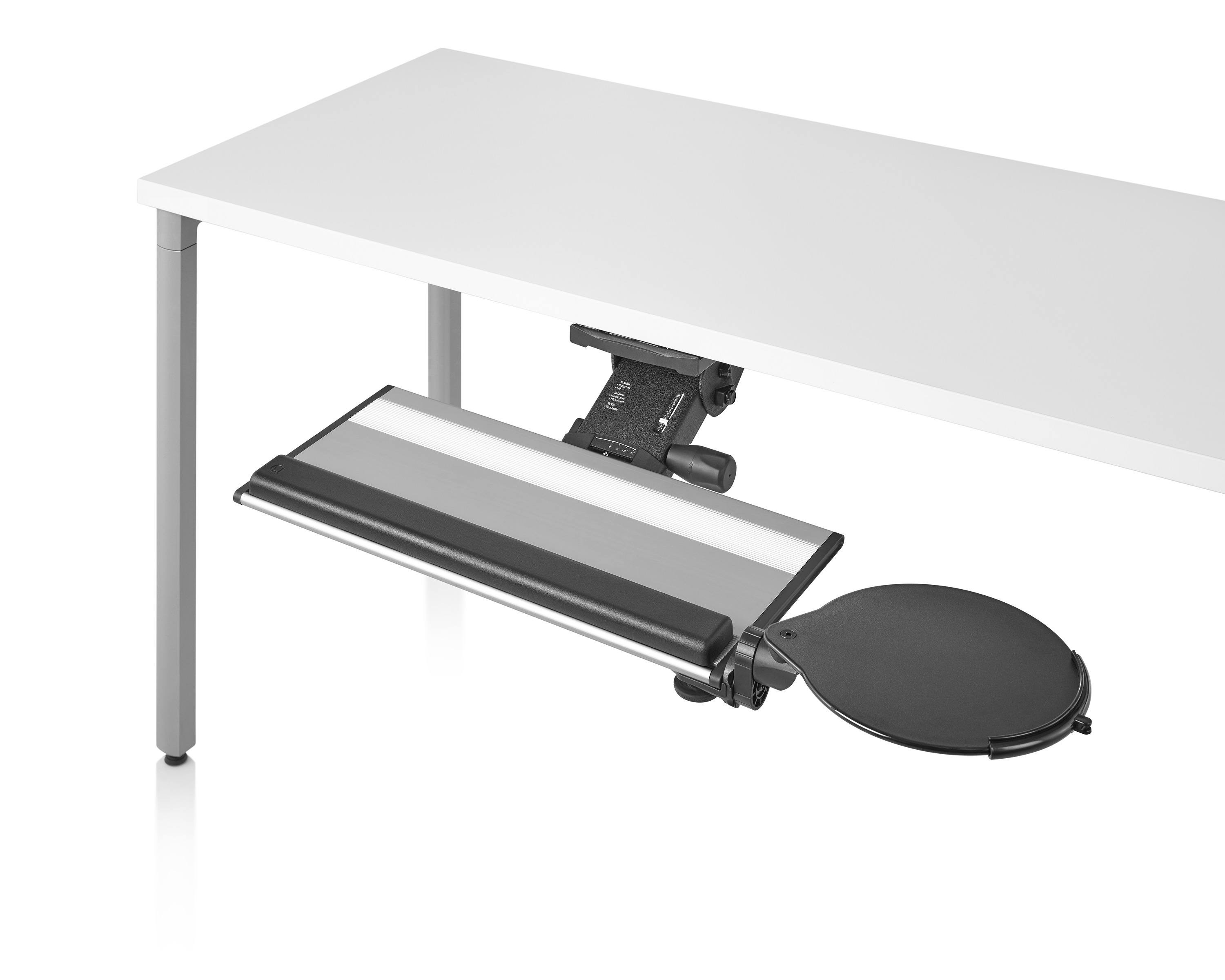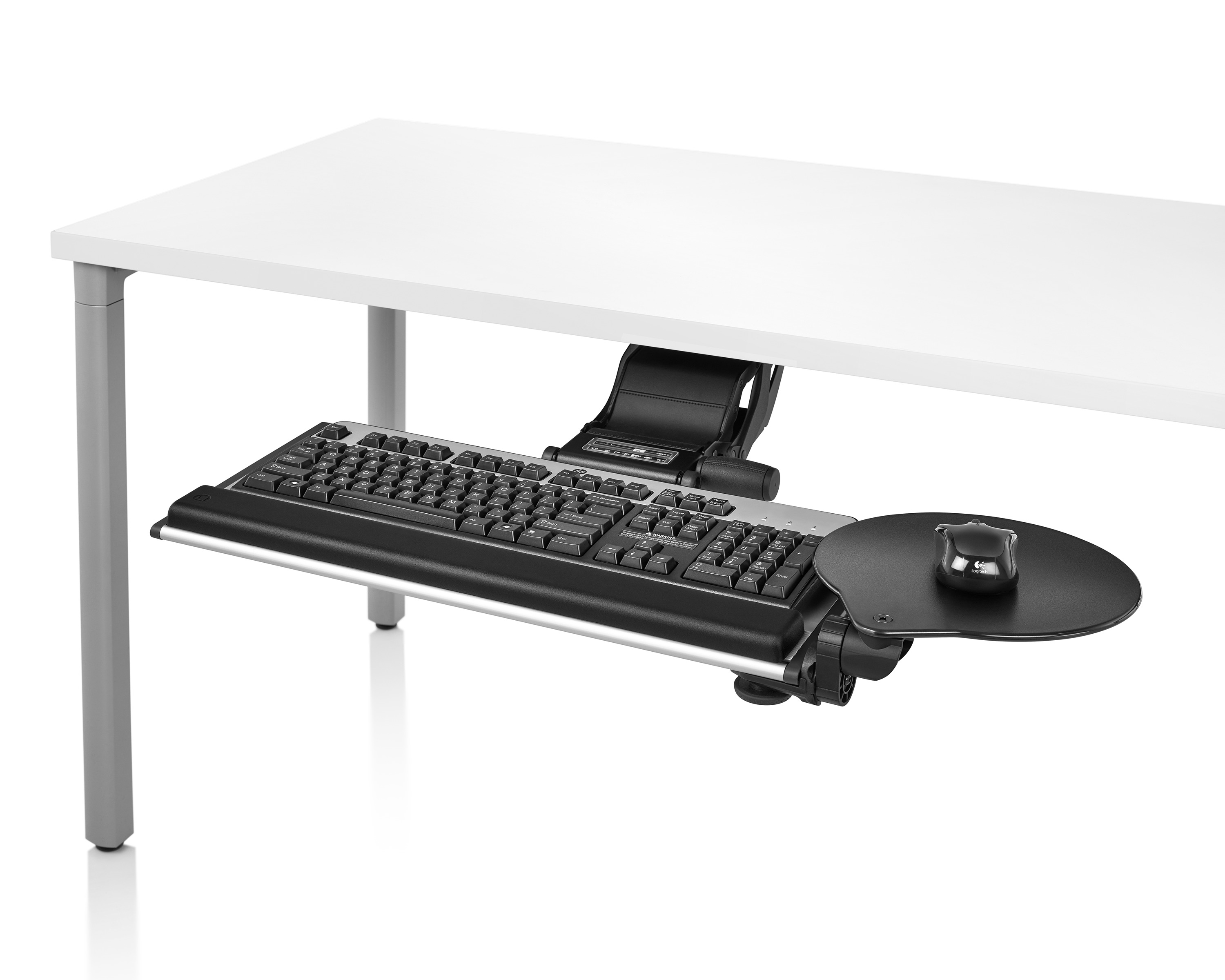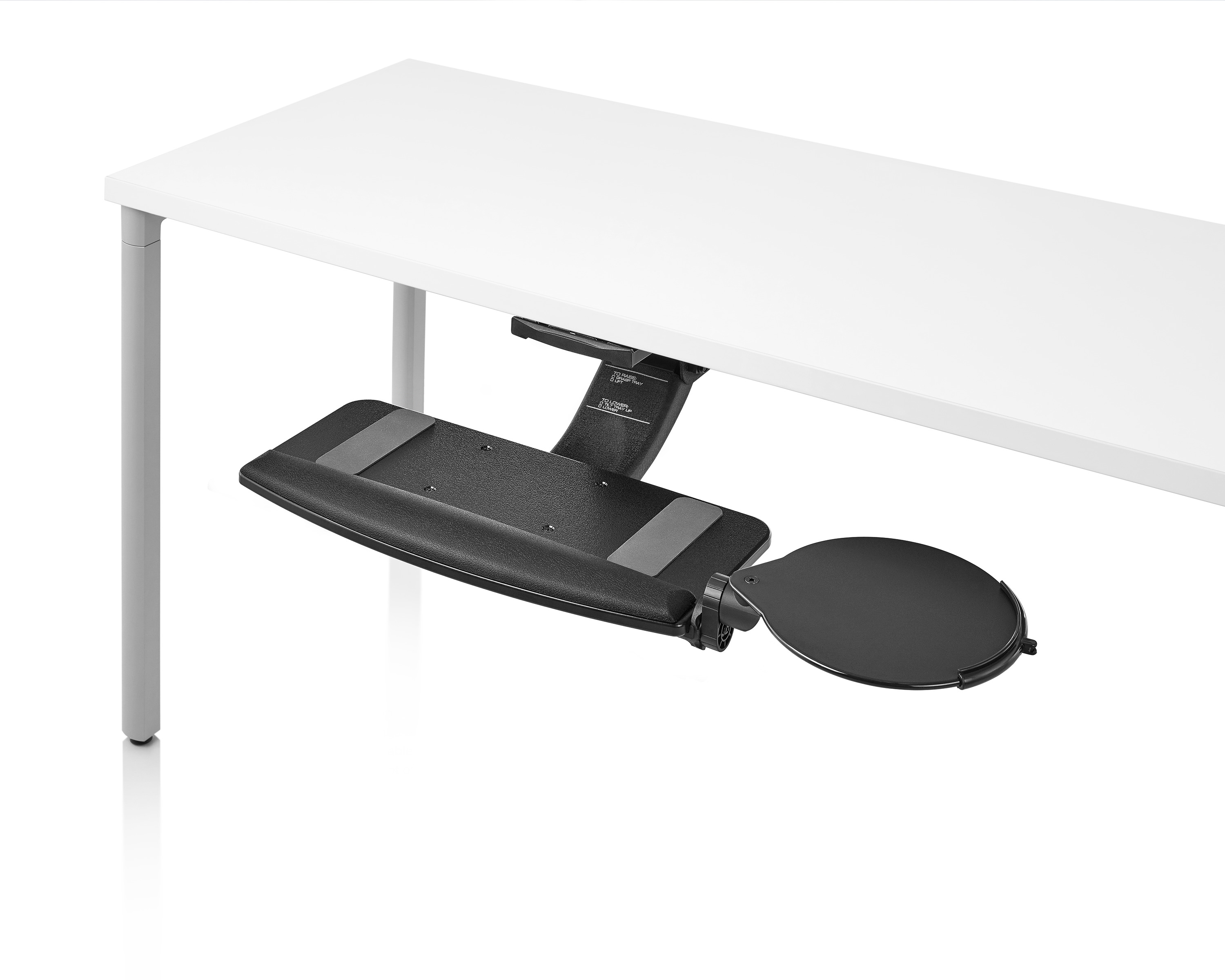 为了像你一样努力工作,我们的键盘支持连接到工作表面的底部,使你的键盘表面在适和你身体定位的高度和角度。高度和倾斜的调整范围很广,确保了所有人和家具的健康位置。当你需要打字的时候,机械装置就会伸出来,当你不使用时,机械装置就在工作表面下整齐的储存