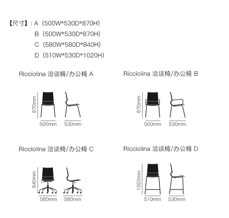 Ricciolina 洽谈椅/办公椅 系列尺寸/示意图