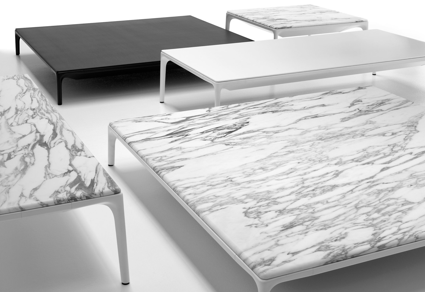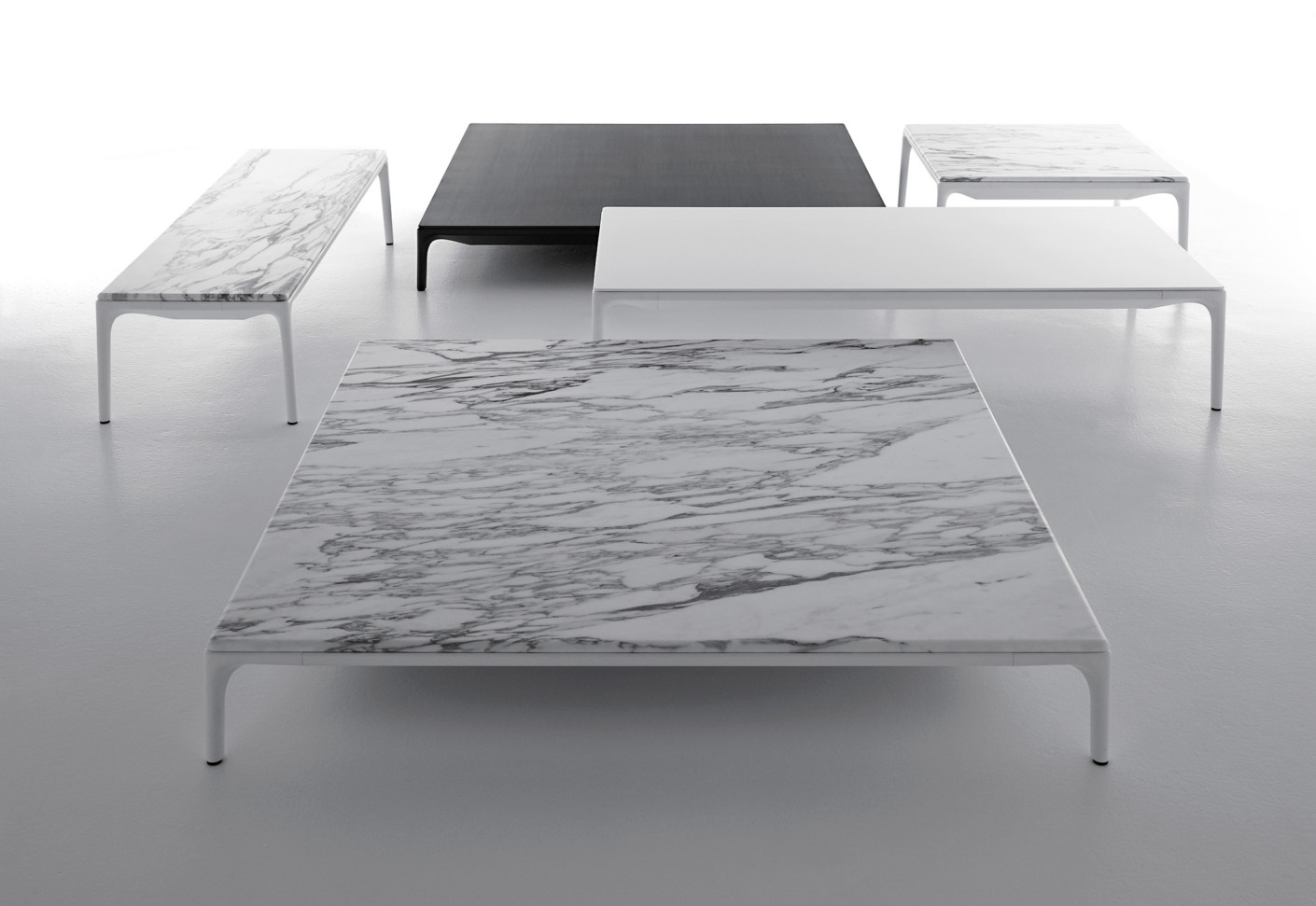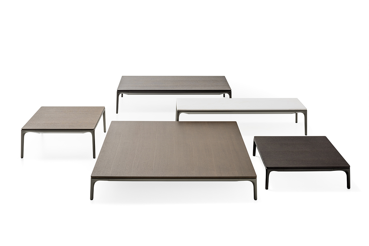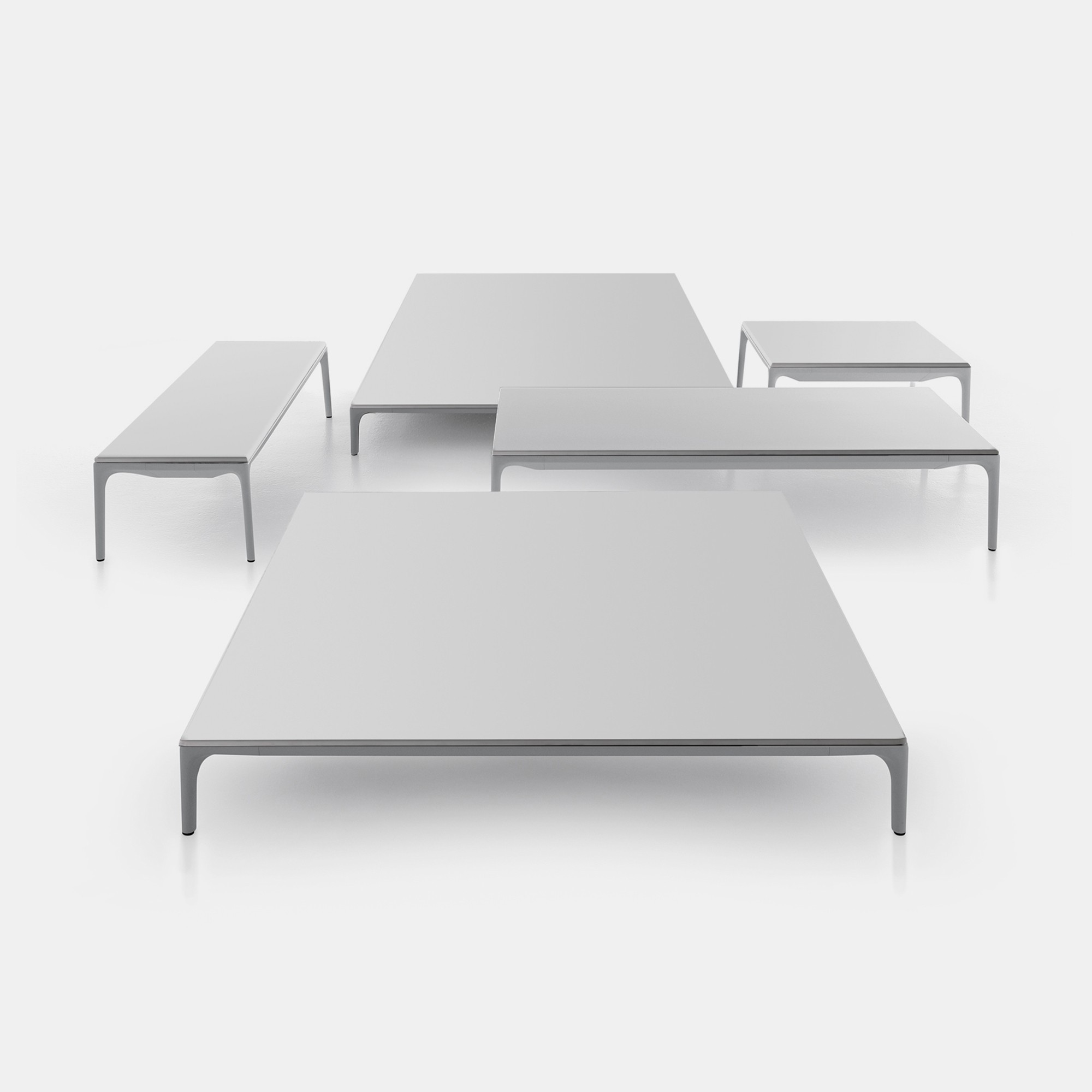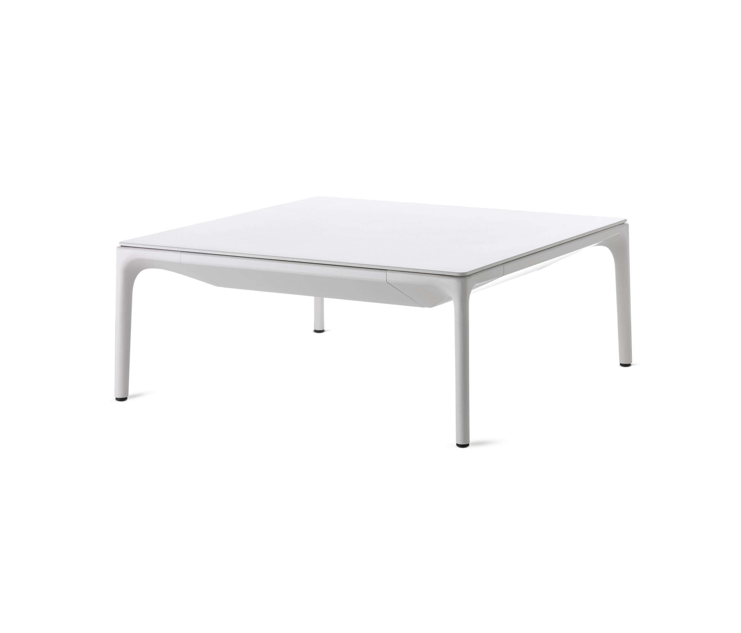 低咖啡桌,在矩形和正方形的形状 框架 在挤压铝和腿在压铸铝,涂漆无光泽白色。 上衣 在白色树脂,厚度9毫米 DIMS H 30厘米:44x150厘米,75x150厘米,75x75厘米和140x140厘米。H 19厘米:75x75厘米和140x140厘米
