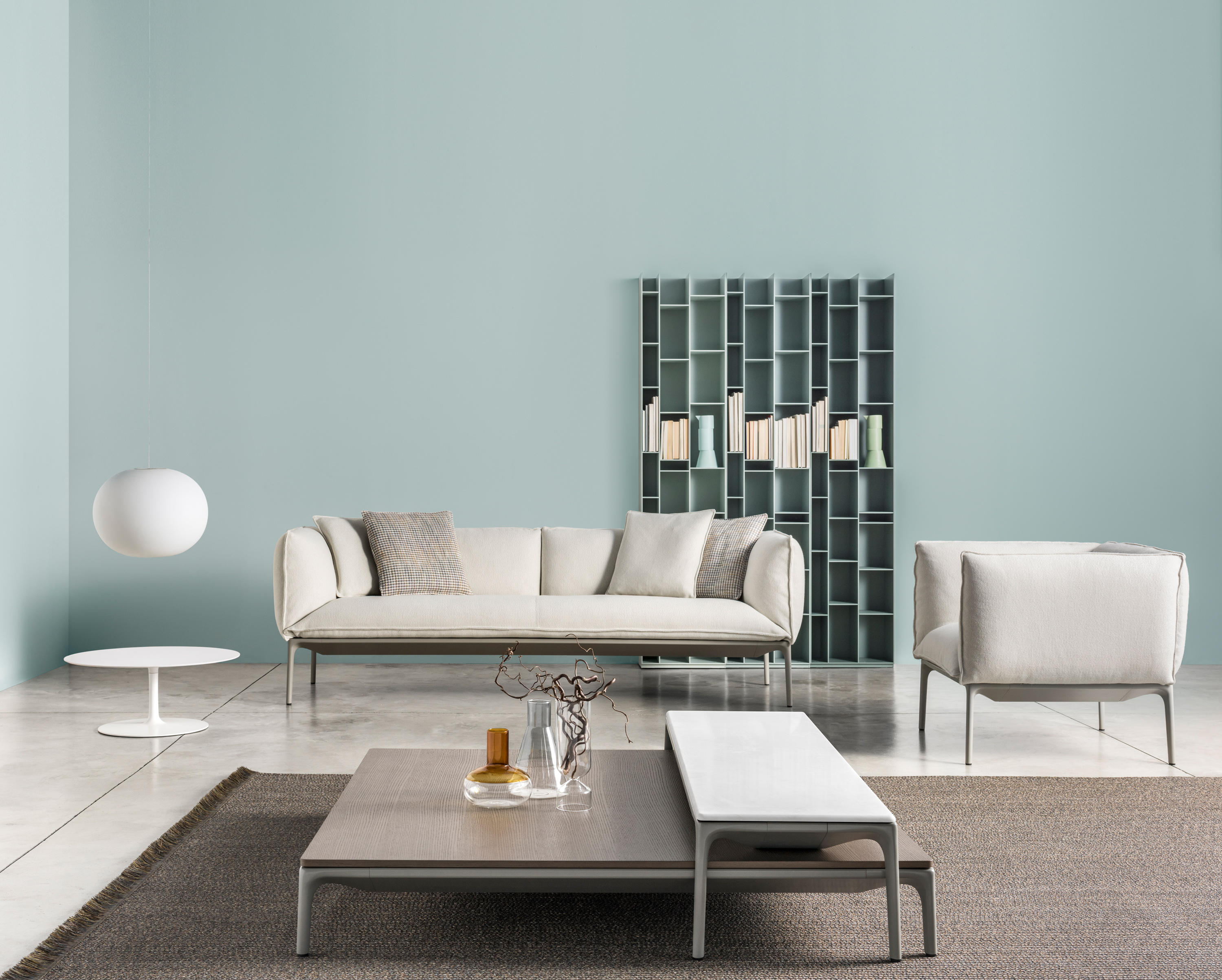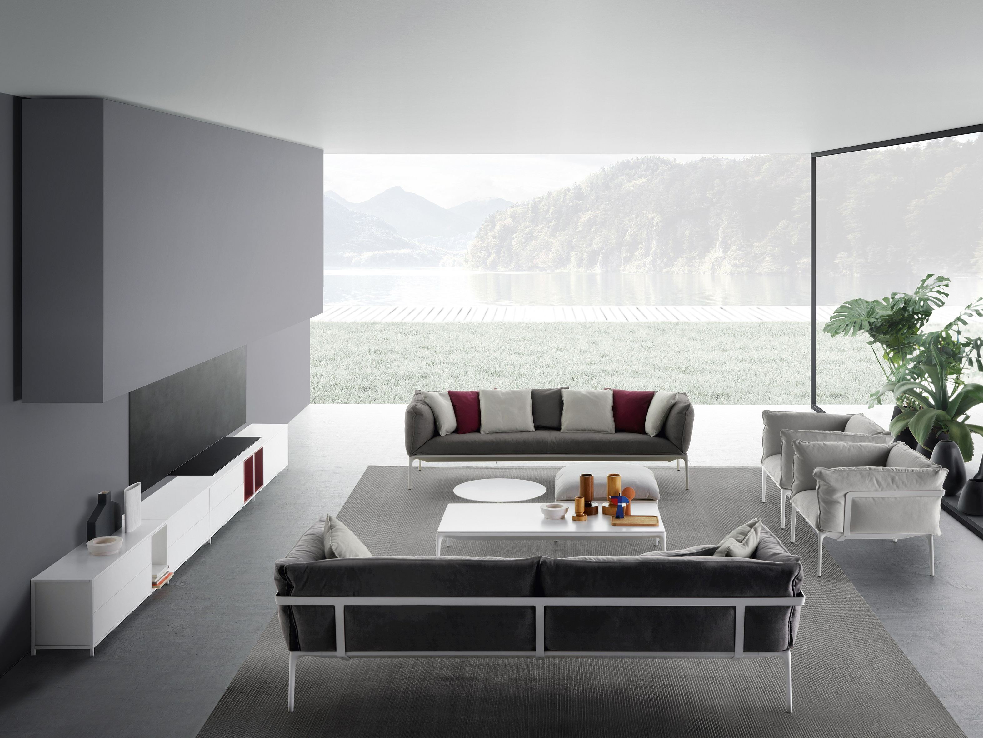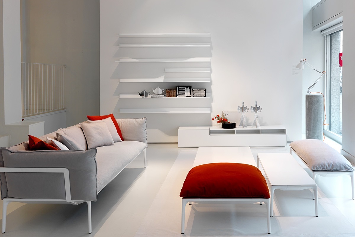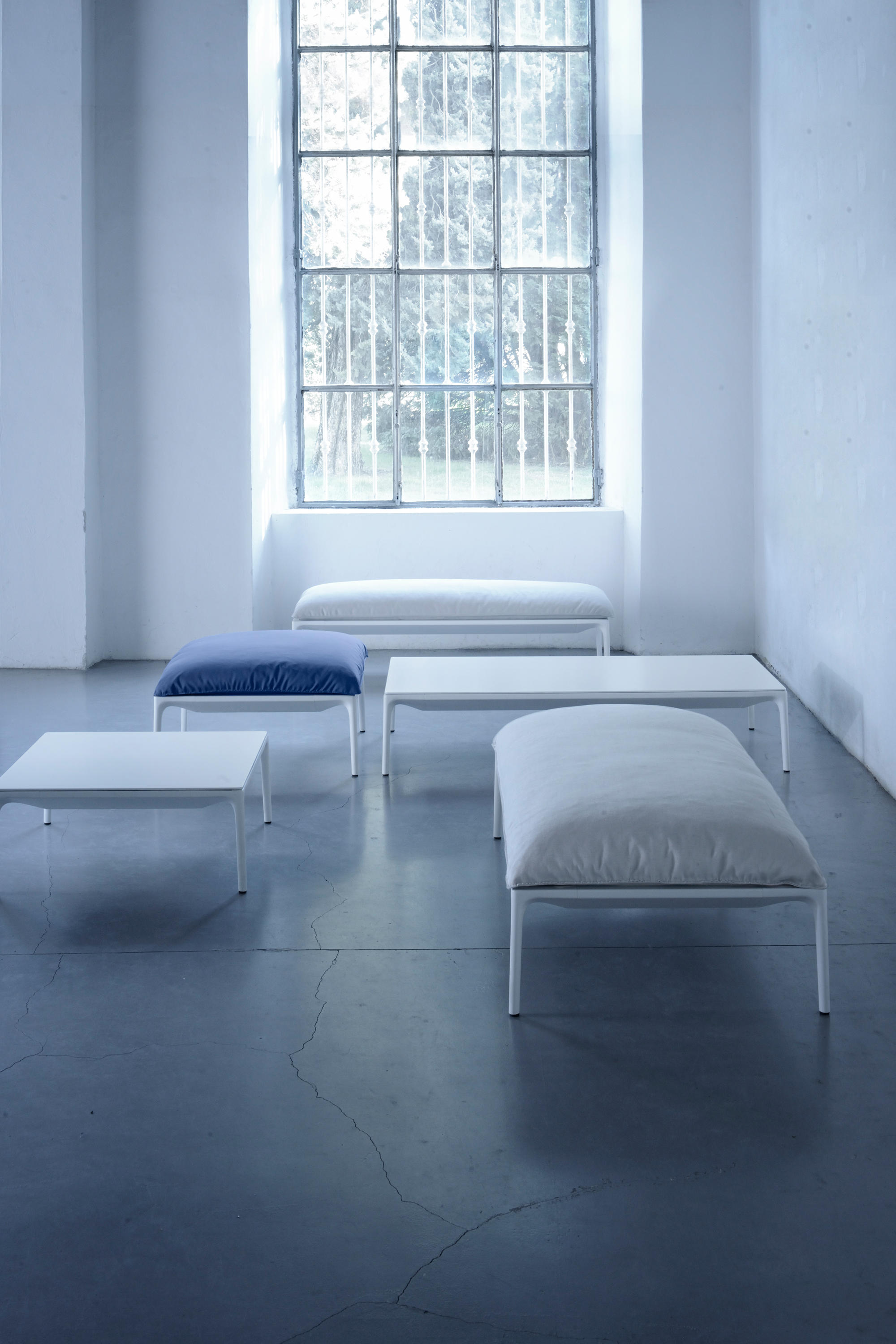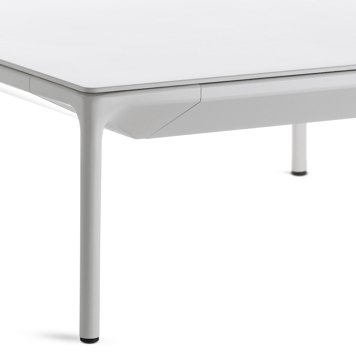 低咖啡桌,在矩形和正方形的形状 框架 在挤压铝和腿在压铸铝,涂漆无光泽白色。 上衣 在白色树脂,厚度9毫米 DIMS H 30厘米:44x150厘米,75x150厘米,75x75厘米和140x140厘米。H 19厘米:75x75厘米和140x140厘米