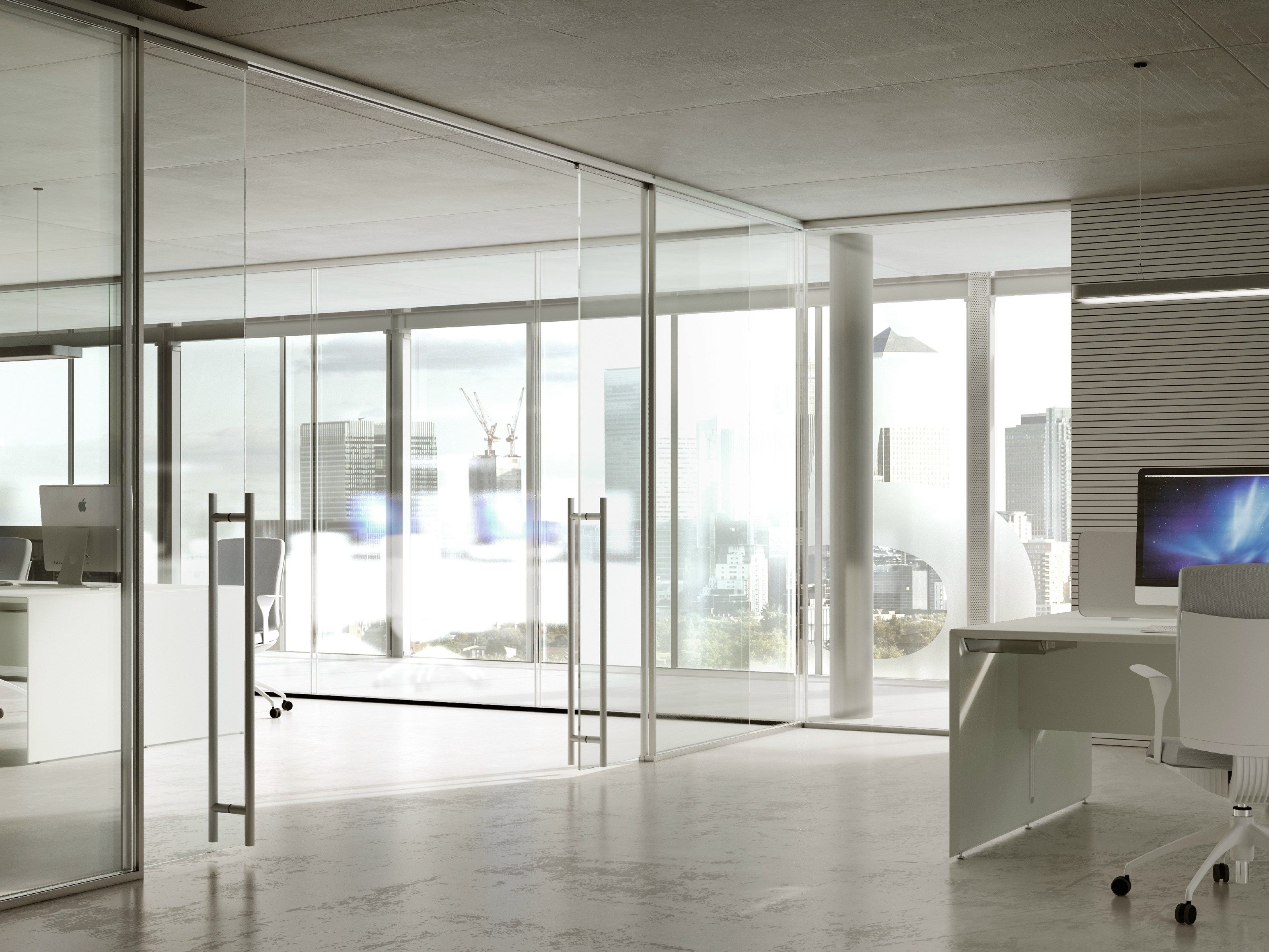 单层玻璃地板隔断墙。阳极氧化挤压铝结构型材,无涂层。具有0.38 mm PVB中间膜的5 + 5 mm夹层玻璃或具有1.52 mm隔音PVB中间膜的5 + 5 mm夹层玻璃均可使用。在标准版本中,使用透明玻璃。 明亮的空间。单层玻璃落地式结构由特定的阳极氧化铝部分组成,可让您在中心安装或偏移安装并与任一外表面齐平的单个玻璃板。使用结构性双面透明硅胶带或垂直透明的聚碳酸酯接缝将玻璃元件连接在一起,以确保平滑平齐的连接。一系列柔软的PVC密封条确保了稳定性和隔音性,这些密封条沿外部周边设置,固定了玻璃板。