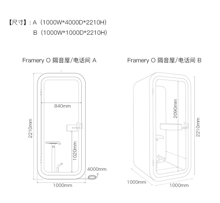 Framery O 隔音屋/电话间 系列尺寸/示意图