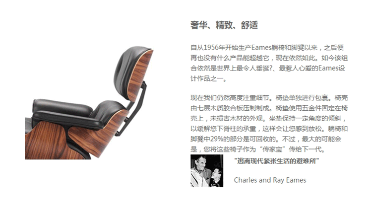 自从我们于1956年开始生产Eames躺椅和脚凳以来,之后便再也没有什么产品能超越它,现在依然如此。如今该组合依然是世界上最令人垂涎?、最惹人心爱的Eames设计作品之一。