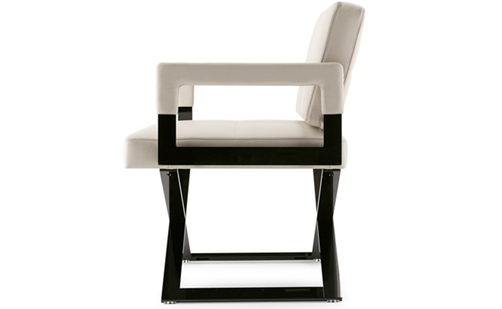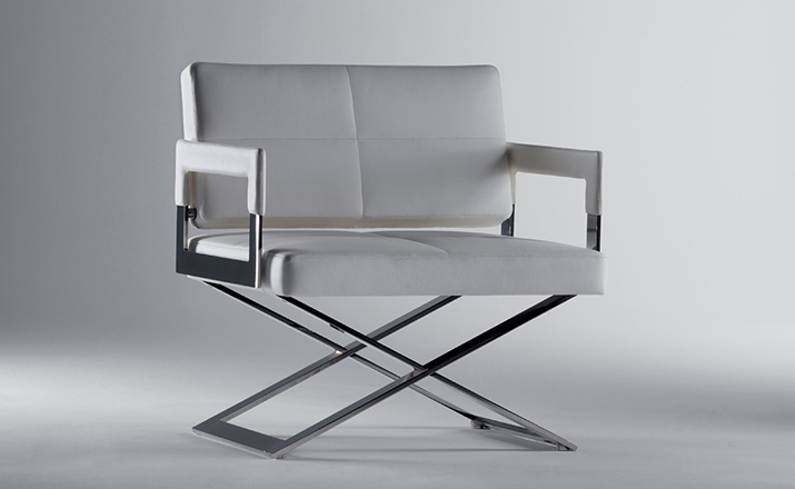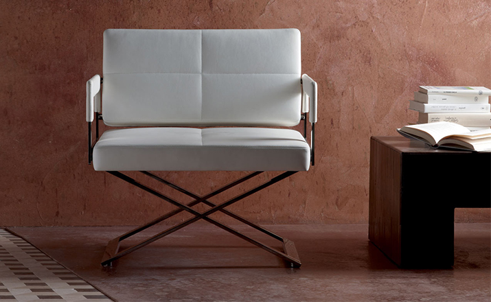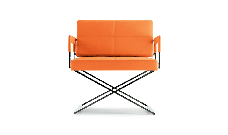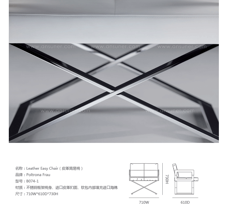 "Leather皮革椅系列家具线条干净简明,“X”交叉造型或者“H”造型脚架支撑着坐垫,新颖独特,由Jean-Marie Massaud设计。它采用外露的金属架,有三种不同的做工,座椅为聚氨酯泡沫材料,靠背较低,坐垫宽敞。有两种面料可供选择:天然皮革和纺织面料。两种款式都有皮革和染色纺织面料的扶手和同款的靠枕。沙发椅的造型形式严谨,它的特点和个性特征与Poltrona Frau现代室内家居的设计非常统一协调。