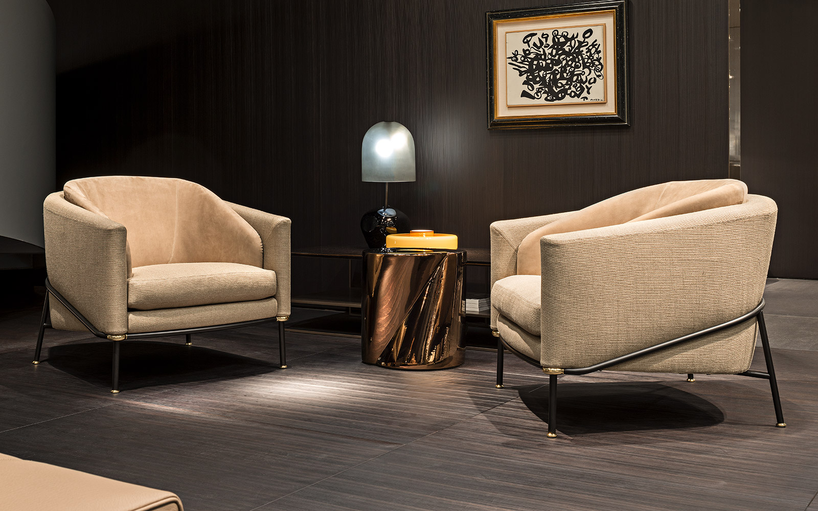 Fil Noir沙发系列的名称源于一个物品,那就是线条——连续性的象征。线条赋予沙发形状和具象:不仅创造出整体造型,还提供支撑并环抱其中。线条体现出简约的材料之选:亚光黑色漆面的金属管。沙发边角的亮光金色、黑镍金属色或浅铜色的圆环为这一严谨的材料之选平添一份柔和的装饰效果,与冷峻的结构形成巧妙的对比。