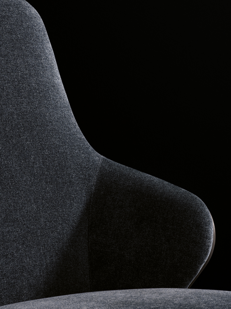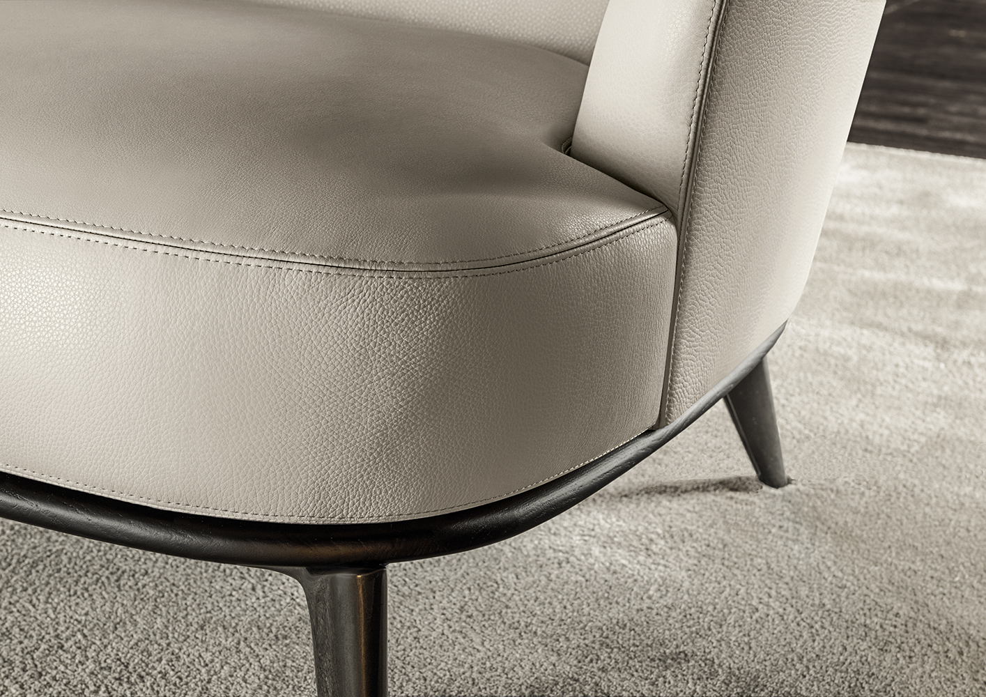 莱斯利“餐厅”小扶手椅展现出圆润而又迷人的造型和同名扶手椅的平衡比例。其特点在于冷模注塑而成的弧形靠背,搭配柔软的填充物。一丝不苟的覆面工艺打造完美的外观效果。Leslie “Dining”可以完全采用织布覆面或者皮革覆面,也可以选择混搭,靠背为织布覆面,坐垫则包覆皮革,体现两种材料之间的完美对比效果。Leslie “Dining” 小扶手椅有三种样式:Pewter色漆面的钢制固定基座,或是Pewter色漆面的压铸铝支撑腿。旋转式基座也采用Pewter色漆面的压铸铝支撑腿。
