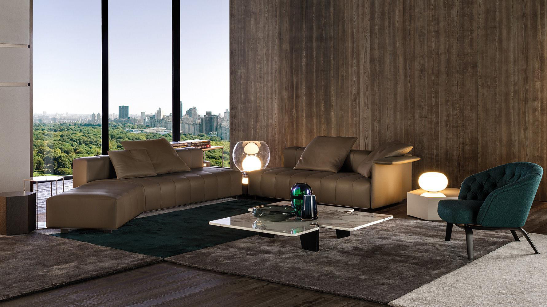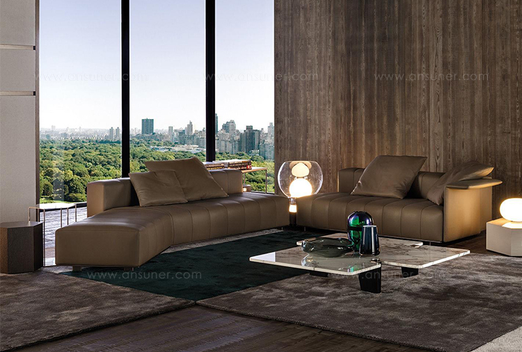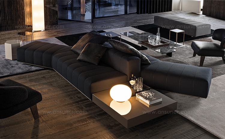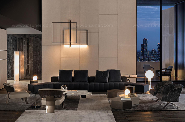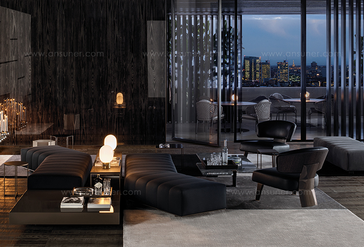 弗里曼“裁缝”项目的理念和原创性在其衍生系列弗里曼“休息室”中也有所体现。弗里曼“休息室”沙发纵深度有所降低,不仅更易搭配较小的居住空间,还可以用在接待场所,如等候室、前台区域、行政办公室。单组沙发的特点在于采用规则图形纹样的优雅缝线设计,可以自由随性地组合沙发,打造灵动的造型。“Wing”扶手拥有轻盈的线条,这要得益于采用聚氨酯为基材的泡沫金属框架。精致的包覆材料展现出公司运用复杂面料进行剪裁加工的实力。皮革和织物面料的各个部件通过浅铜色人造皮革束带和双缝线工艺连接在一起,打造出独特的纵深效果。