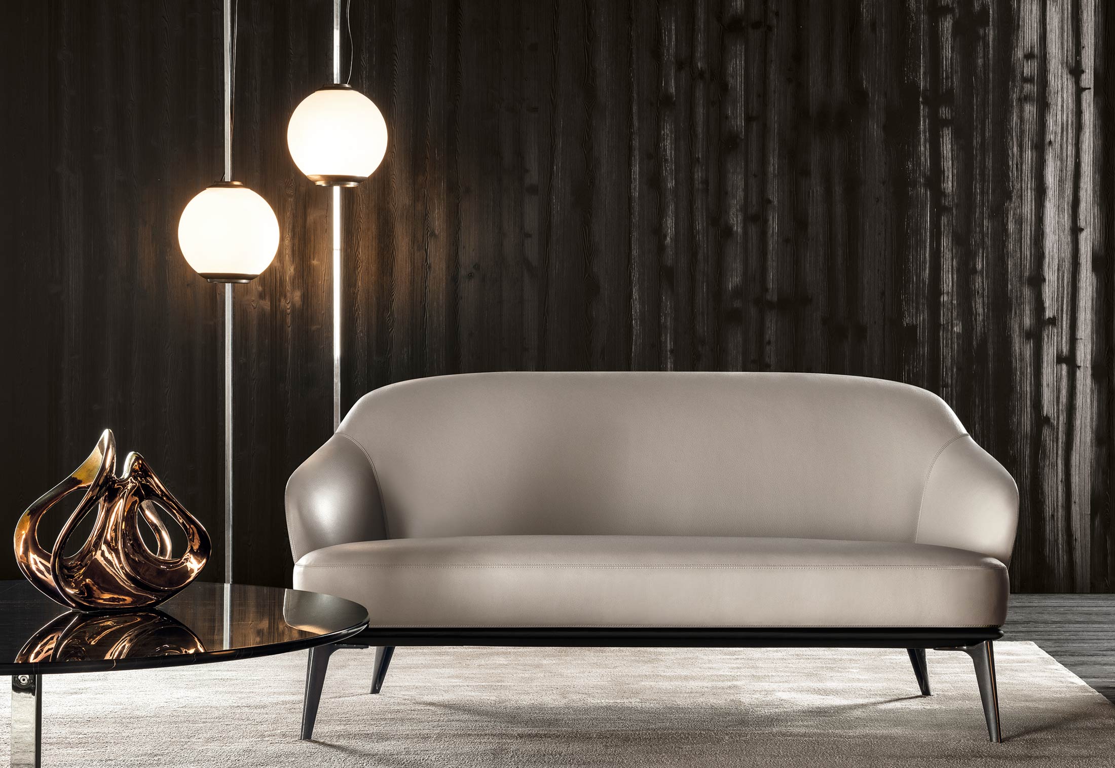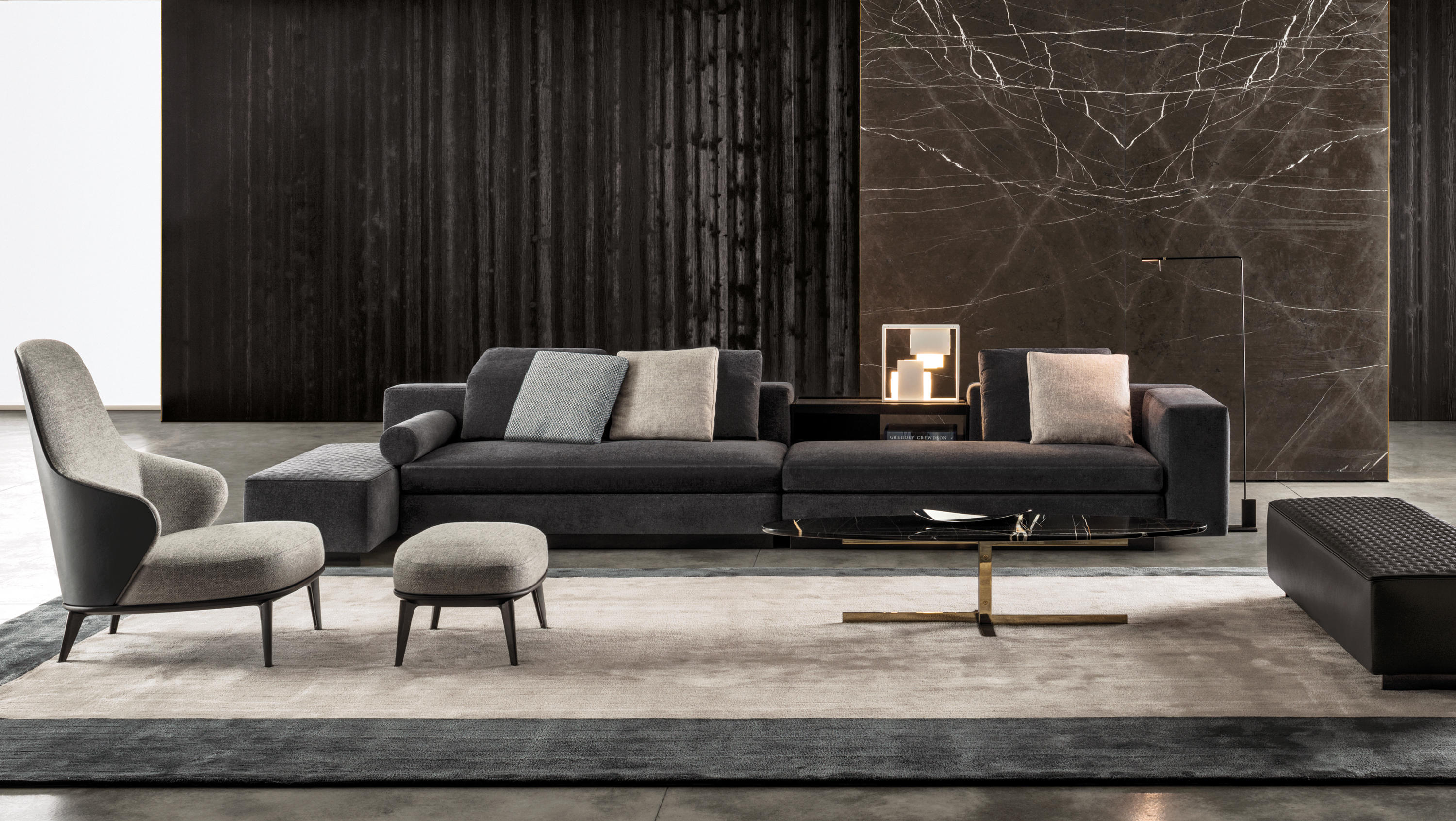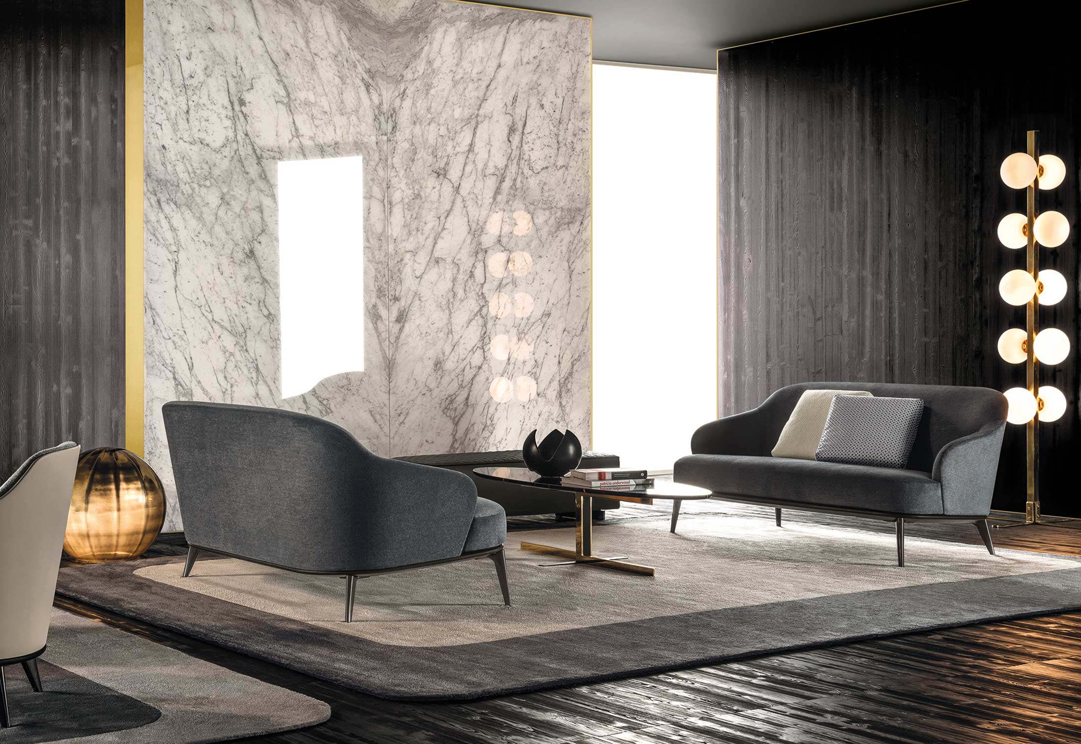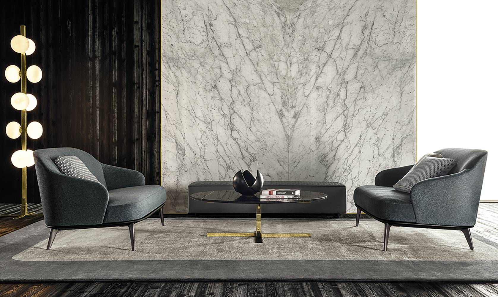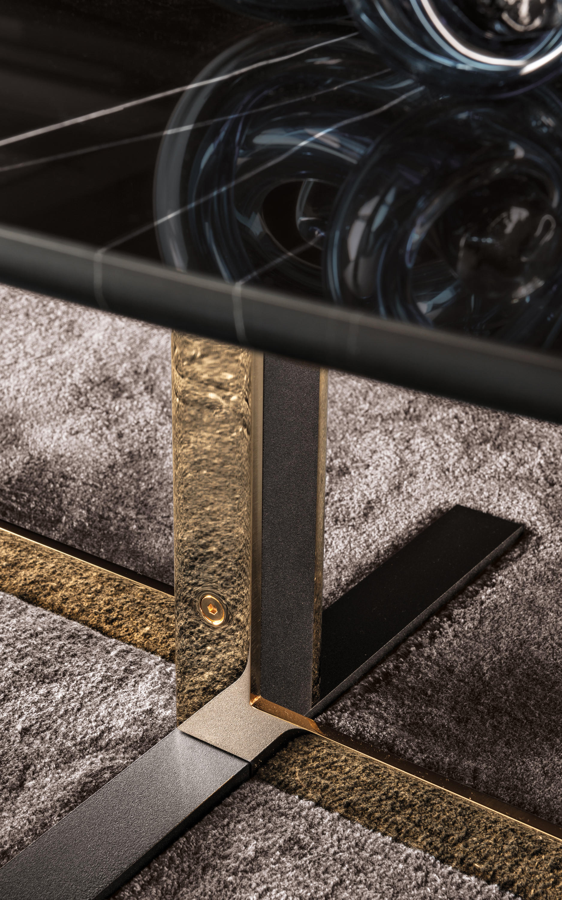 如果说Catlin边柜的设计崇尚简洁,那么材质的选择则旨在打造非凡的视觉和触觉效果。金属基座有着精致的十字形地面支撑腿,其中包括颇有趣味的组合:黑色压花搭配铬色或金色的抛光表面,打造出多种多样的风格。材料的搭配体现出非凡的优雅感,台面可以选择两种珍稀名贵的大理石,Arabescato Purple或Sahara Noir,两者都拥有抛光表面。