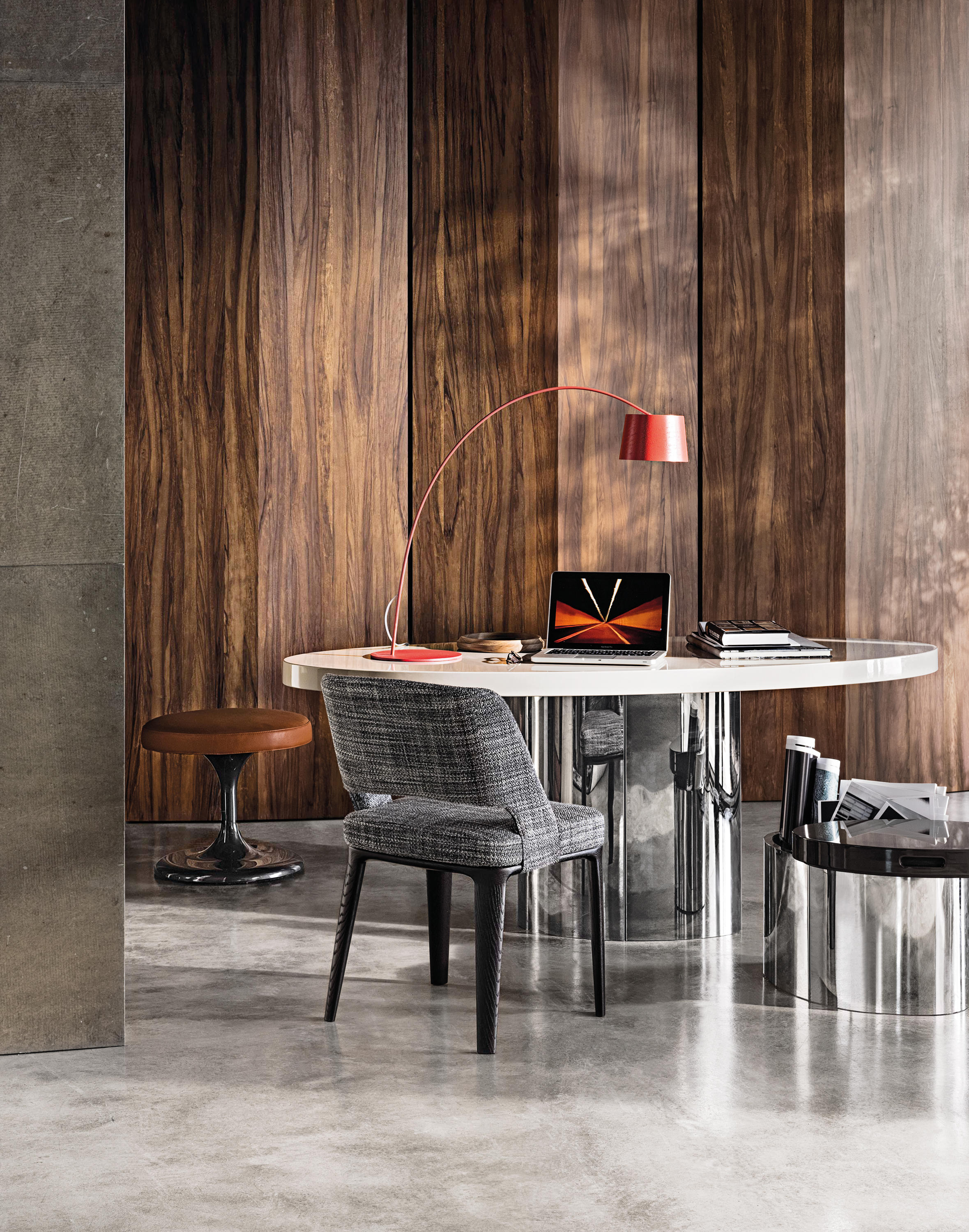 体积与造型的游戏,大胆的不对称性,一切似乎是对地心引力的挑战。这就是Raymond的美学理念。这款产品有两种高度可供选择,61厘米和74厘米。椭圆的造型是基座和台面的主题元素,基座采用镀铬金属制成,台面的亮光漆色彩缤纷:白色,Sand色,紫色,绿色和花岗石色。