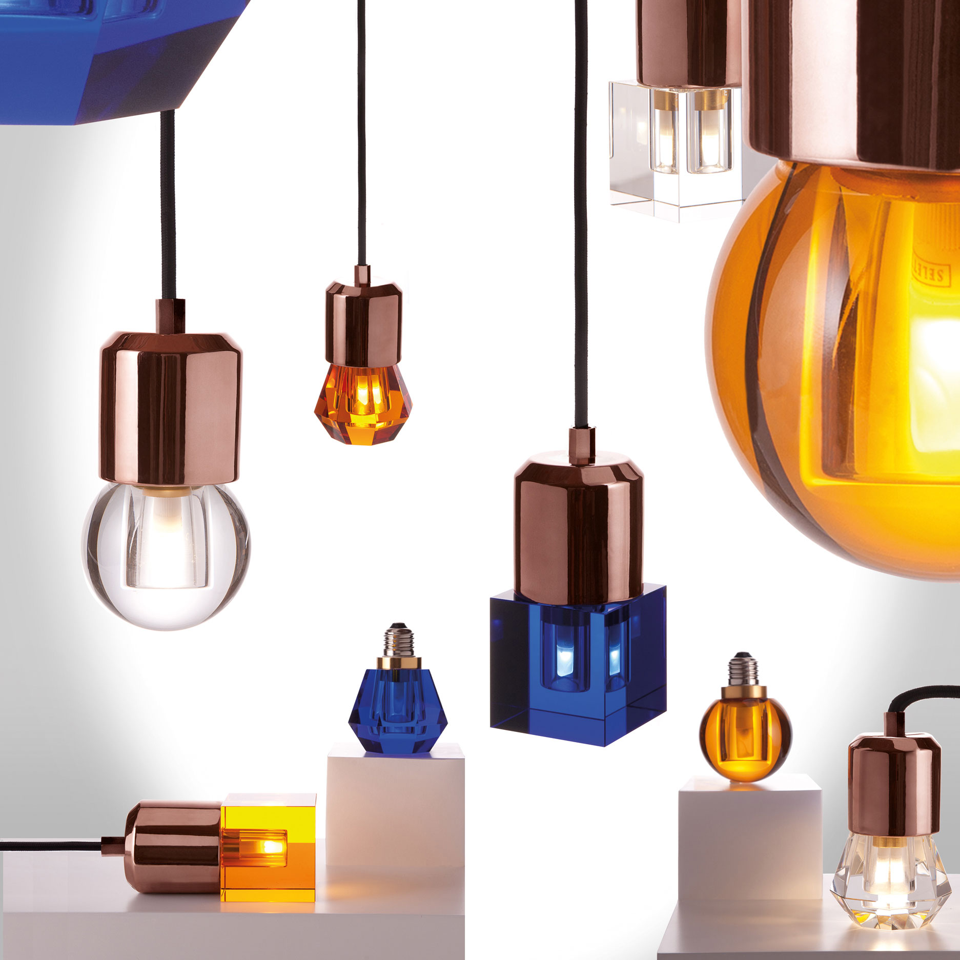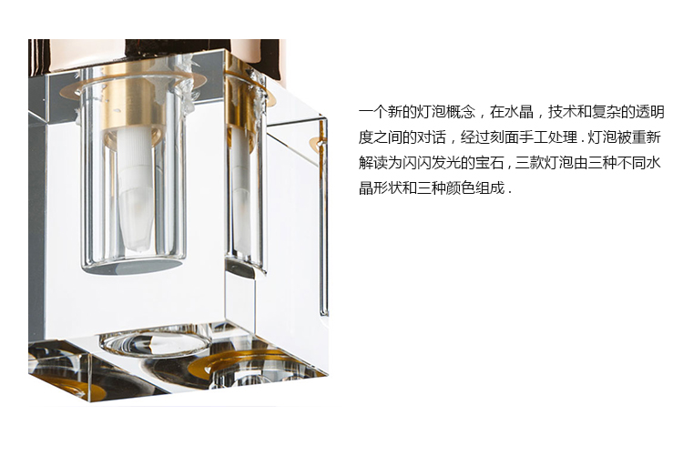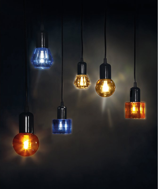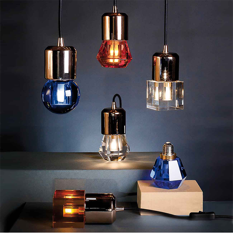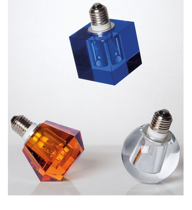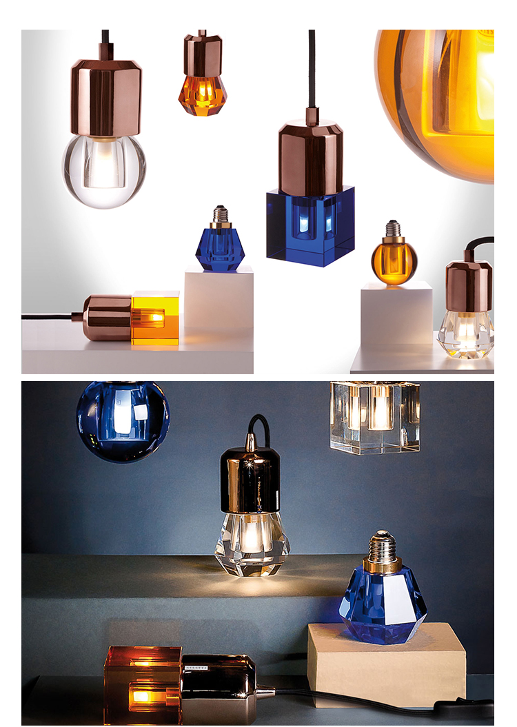 一个新的灯泡概念,在水晶,技术和复杂的透明度之间的对话,经过刻面手工处理.灯泡被重新解读为闪闪发光的宝石,三款灯泡由三种不同水晶形状和三种颜色组成.