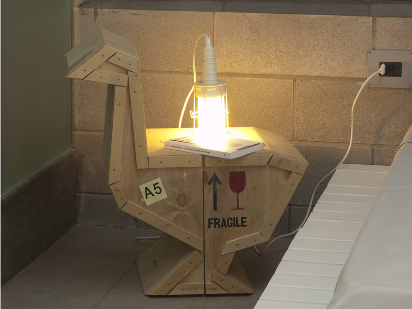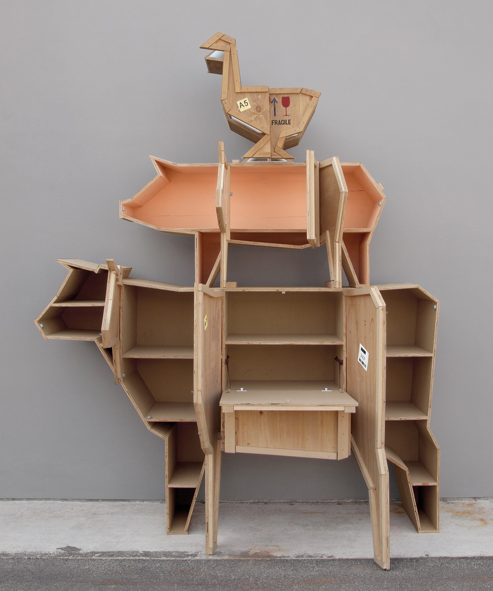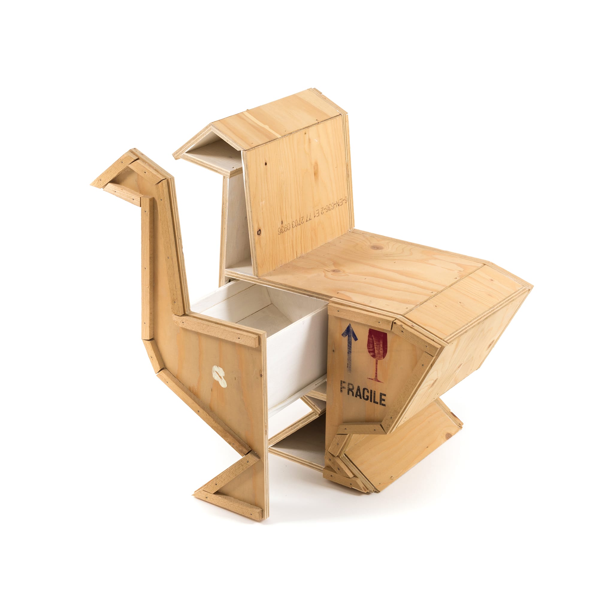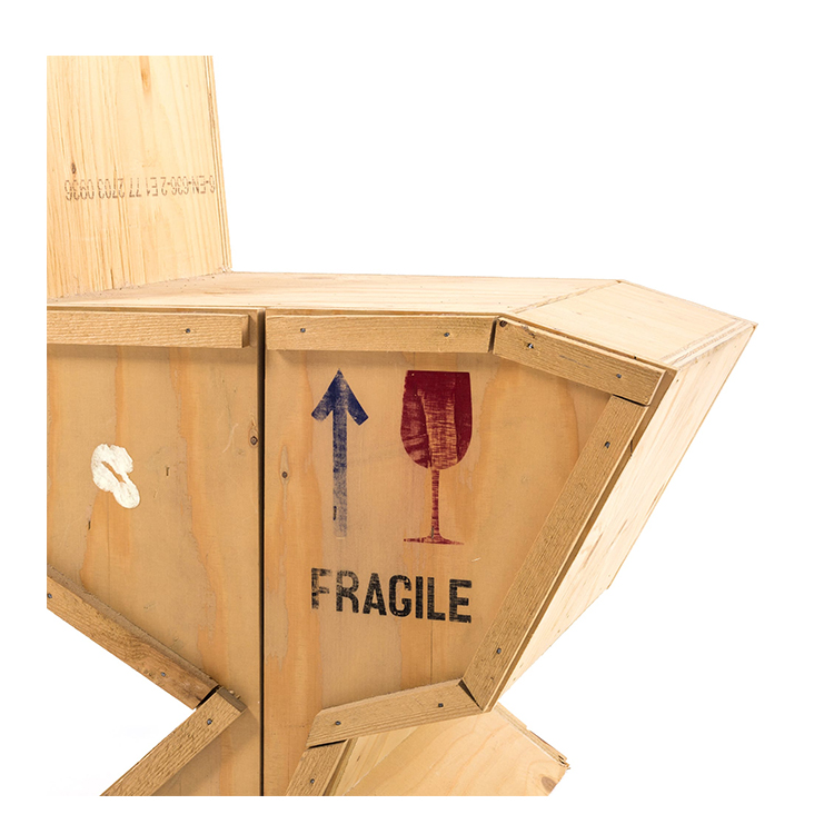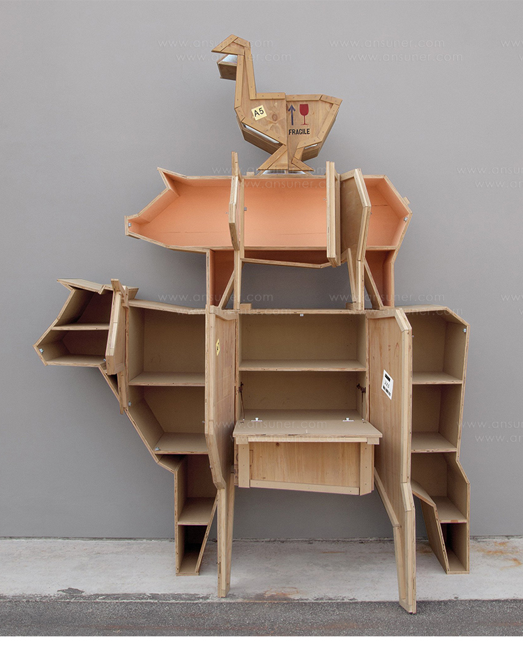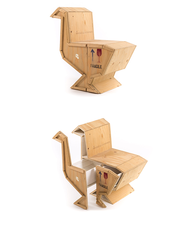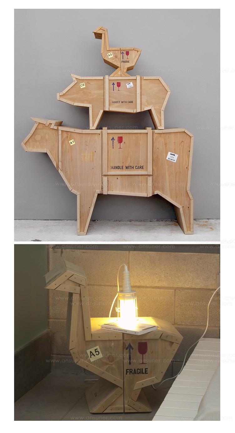 讽刺是一件严肃的事情,如果在微笑的同时让我们思考。动物板条箱协会很有趣,但同时也让我们对人类与自然的关系感到敏感。这件家具作品代表了一种荒谬的形象,动物们被运来运去。可能吗?为了更好地表达这个概念,我们选择了三种典型的农场动物,一头牛,一头猪和一只鸭子。每一个可见的瑕疵都是这件作品的特色,为了尊重原作的诗意,这些作品都是用同样的工艺制作而成,用于真正的运输板条箱。