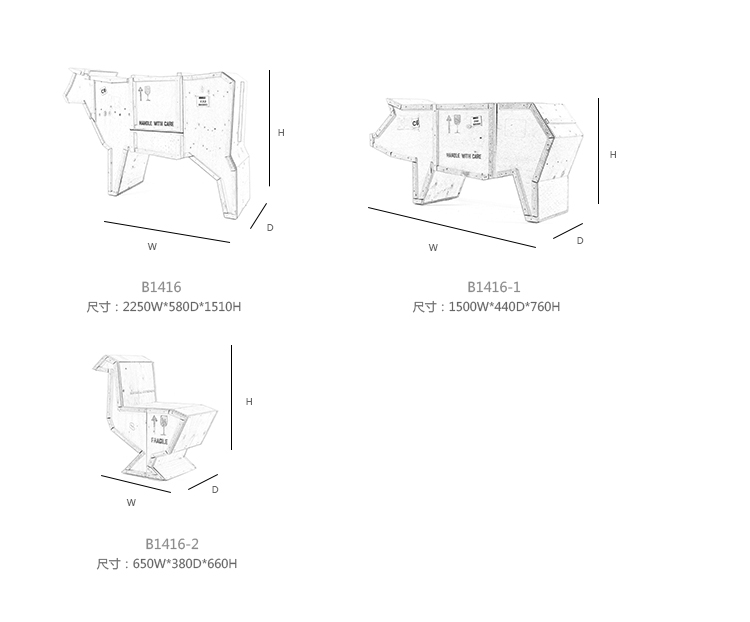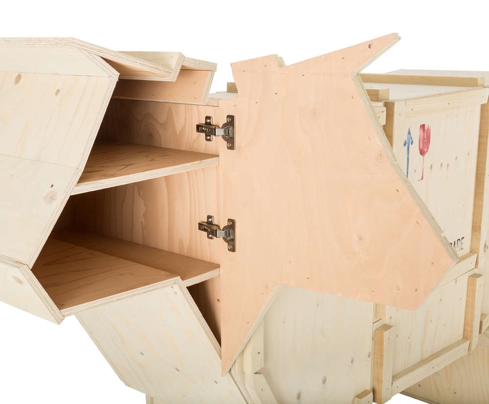 讽刺是一件严肃的事情,如果在微笑的同时让我们思考。动物板条箱协会很有趣,但同时也让我们对人类与自然的关系感到敏感。这件家具作品代表了一种荒谬的形象,动物们被运来运去。可能吗?为了更好地表达这个概念,我们选择了三种典型的农场动物,一头牛,一头猪和一只鸭子。每一个可见的瑕疵都是这件作品的特色,为了尊重原作的诗意,这些作品都是用同样的工艺制作而成,用于真正的运输板条箱。