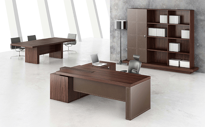 卡罗是木配皮的经典搭配,体现一般现代感和稳重的气质,文件柜分为单边门、全空格、中间皮推拉门、全部皮门几种,每种搭配都有一种不同的稳重美感在里面。会议台加长则有大气稳重之美,小款有精细优雅特质。根据办公场地,可任意配出满意的效果。
