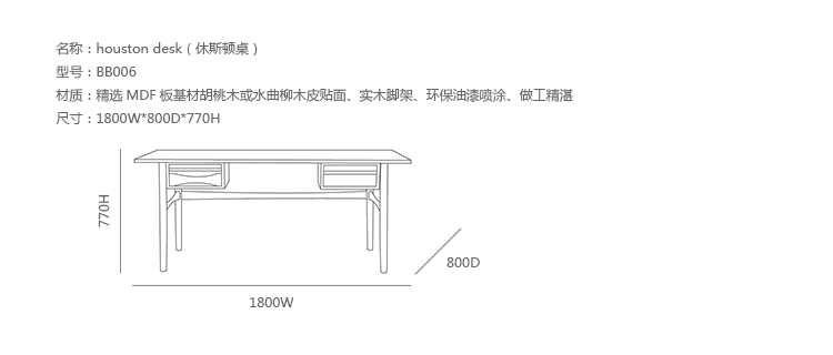 houston desk(休斯顿桌)有着迷人的中世纪设计风格,这张漂亮的家具有着舒适的触感,多个抽屉,数吨的存空间,经济实用。制作采用精选MDF板基材胡桃木或水曲柳木皮贴面、实木脚架、环保油漆喷涂,做工精湛,品质一流。