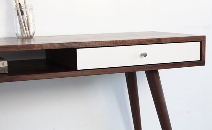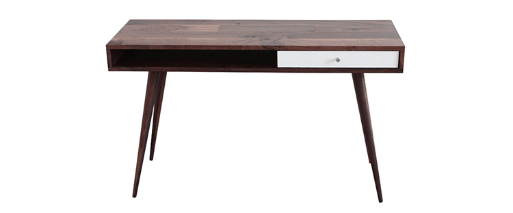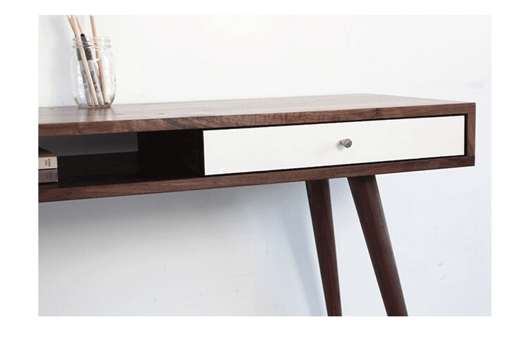 walnut laptop desk(胡桃笔记本电脑桌),中世纪风格,核桃实木精心制作,对于那些在家里工作的人来说,其可以舒舒服服地放在一个小办公室或公寓卧室,设有一个抽屉和开放空间以存放您的平板电脑或其他设备。制作采用精选MDF板基材、进口胡桃或樱桃木皮贴面、实木脚架、彩色装饰边、环保净味油漆喷涂、做工精湛。
