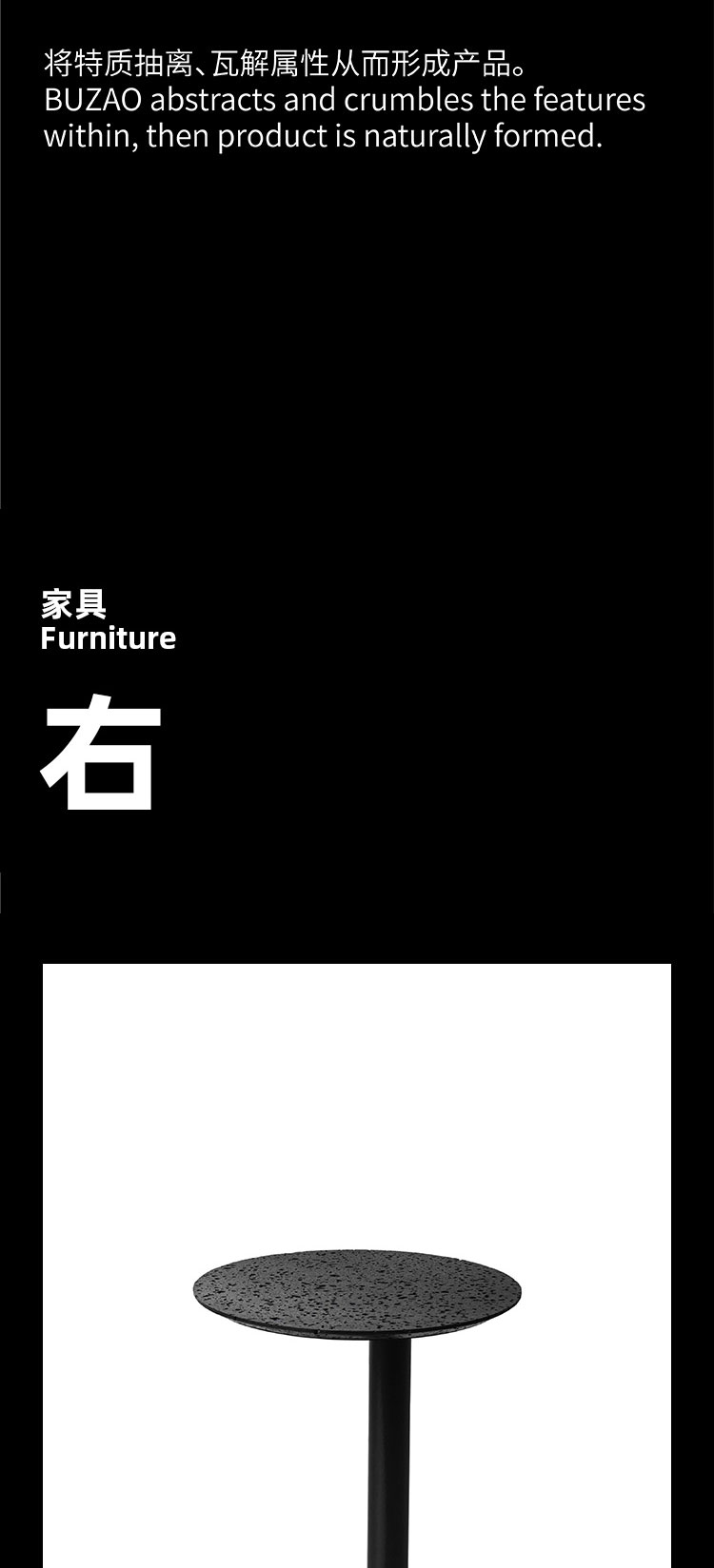 洞黑系列,洞悉秘密,来自地心的喷发。极想把洞石的芳华寂寞倾述出来,呈现于日常并使用它。尝试将洞石塑造各种形态,原材,呈浅灰色;亚光,颜色渐渐加黑;抛光,纯黑了。三种状态,魅力各异。深入践行,洞石的特性愈显,吸音、防水、防火、保温、隔热,耐酸碱、耐腐蚀、耐沾污、耐霉变,且无污染,无放射性。惊喜不断,质量很轻的洞石,居然强度很高,轻、硬,可塑性强,气孔式的通透,赋予了极简中的奢华。触目的拙,爱不释手。