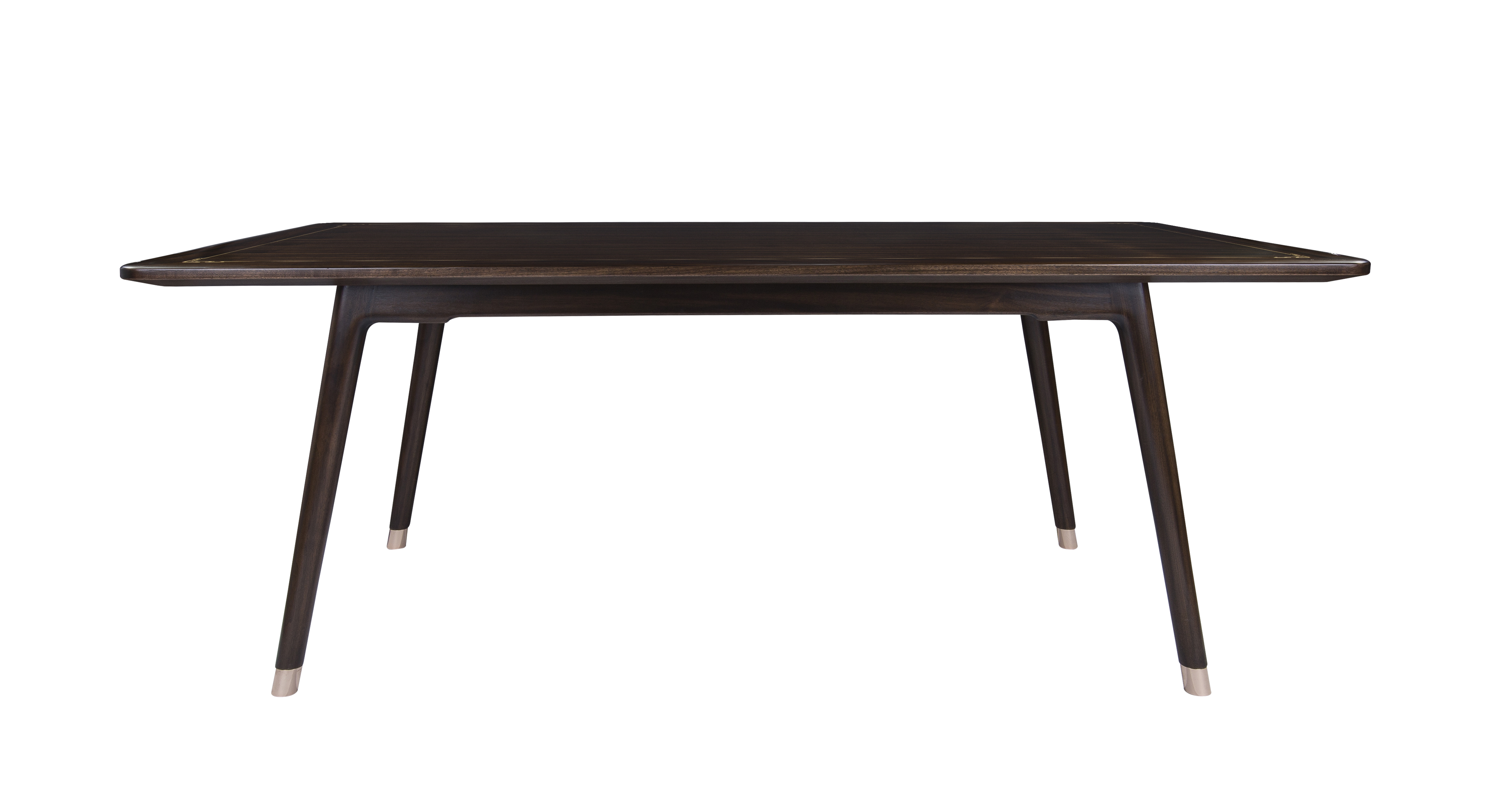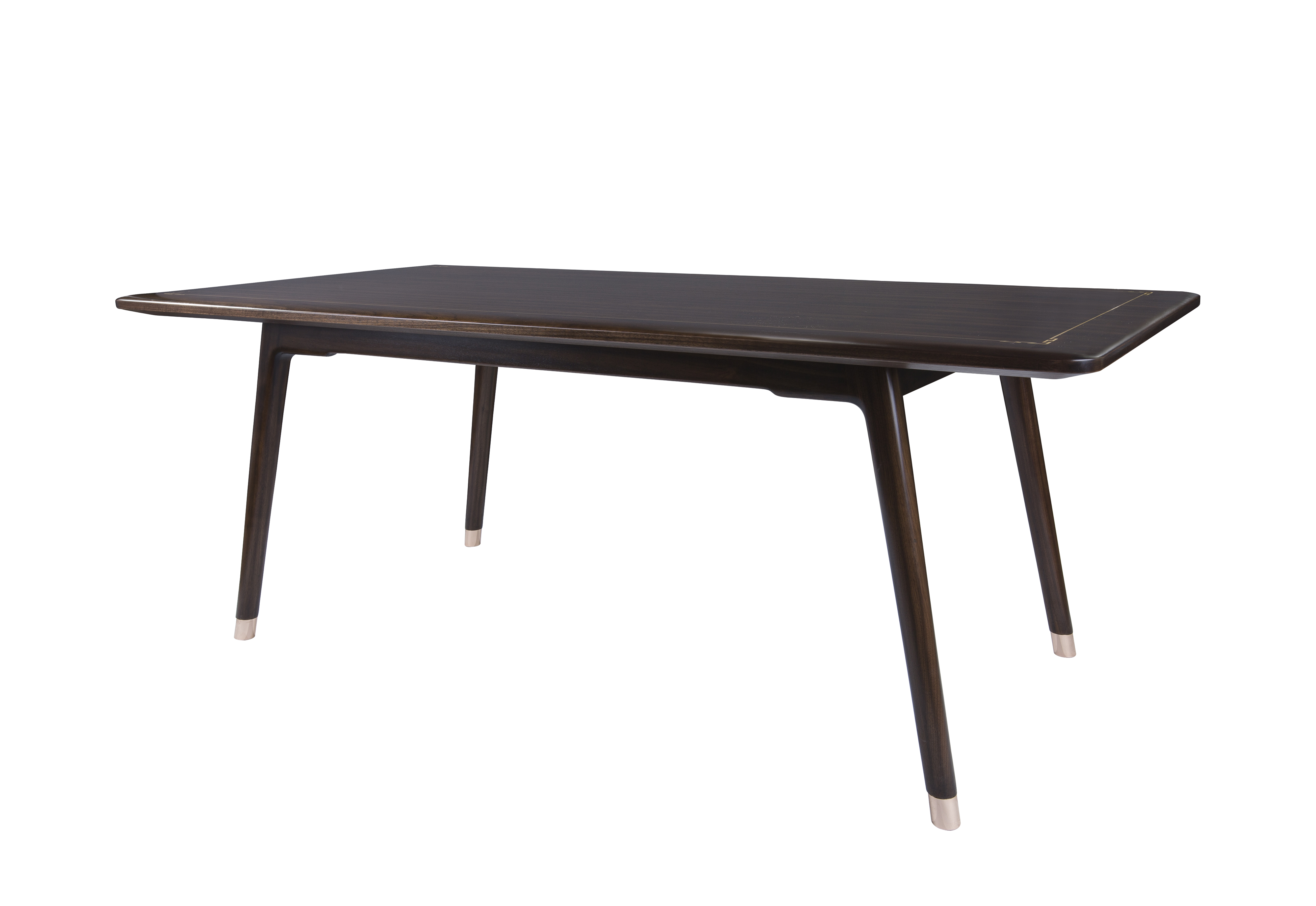 1.餐台整体简洁干练,以线为主,秀美颀长。 2.腿部内收,上收下分,具有很好的视觉稳定感,稳重大方。 3.铜脚设计,赋予中式韵味的同时以防磨损。