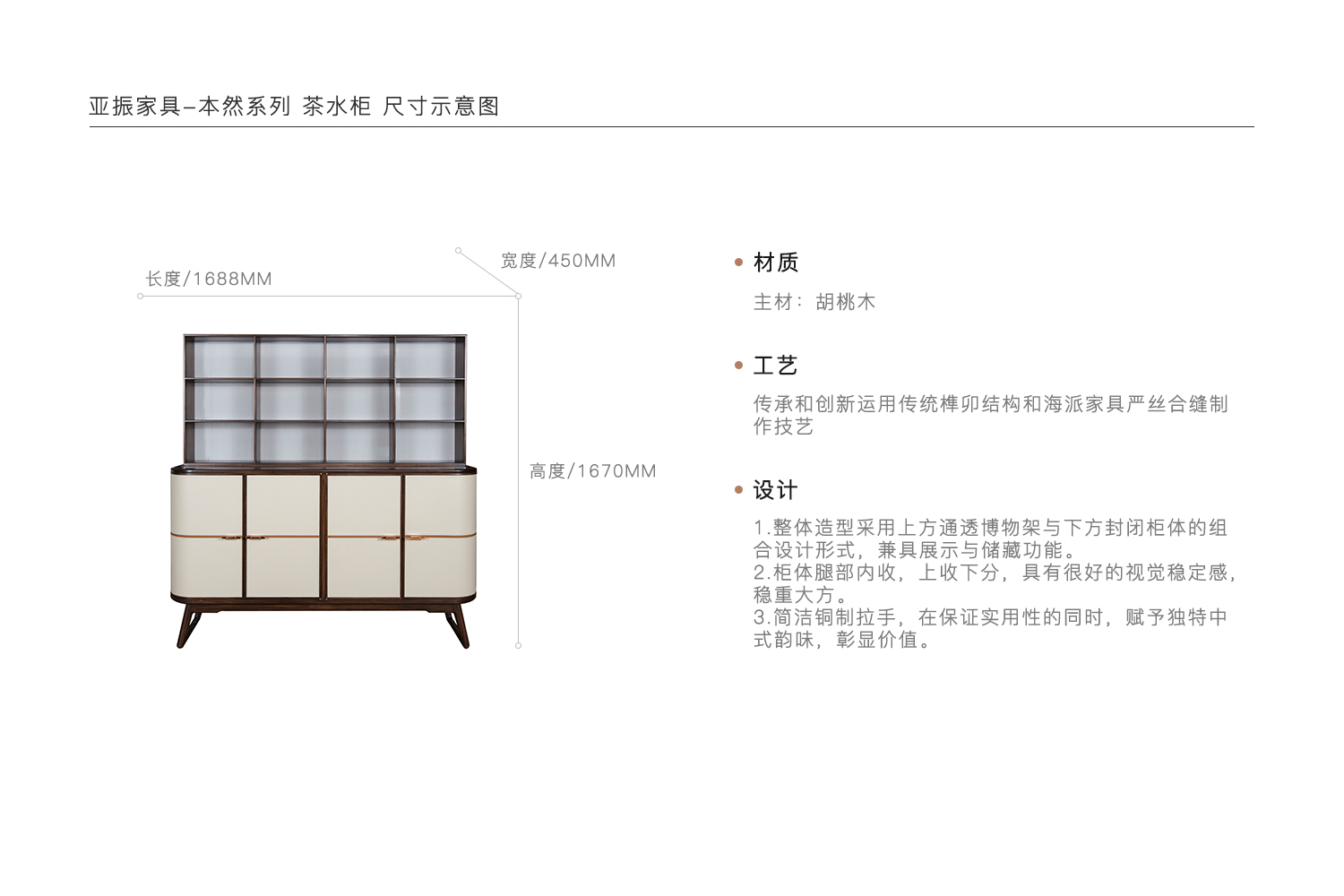1.整体造型采用上方通透博物架与下方封闭柜体的组合设计形式,兼具展示与储藏功能。 2.柜体腿部内收,上收下分,具有很好的视觉稳定感,稳重大方。 3.简洁铜制拉手,在保证实用性的同时,赋予独特中式韵味,彰显价值。